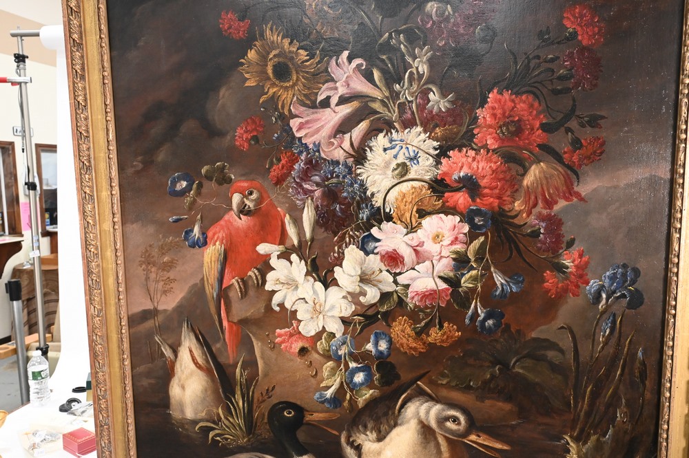 Attributed to Andrea Belvedere (1642 – 1732), floral still life with a parrot and ducks, oil on canvas, unsigned, 49 1/2″ x 39 1/4″. Provenance: Offered for sale by Sotheby’s, important old master paintings and sculpture sale, January 26, 2012.