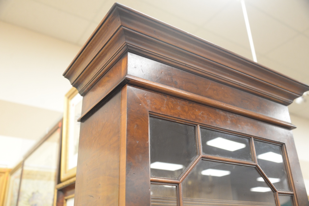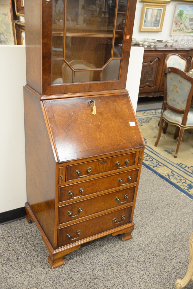 Burlwood Secretary Desk, having one door over drop front opening, tooled leather writing surface and fitted interior bracket base, height 83 1/2 inches, width 23 inches, Provenance: David and Cynthia Kim, 22 Stoney Wylde Lane, Greenwich, Connecticut. View home by visiting: https://www.zillow.com/homedetails/22-Stoney-Wylde-Ln-Greenwich-CT-06830/177238281_zpid/.