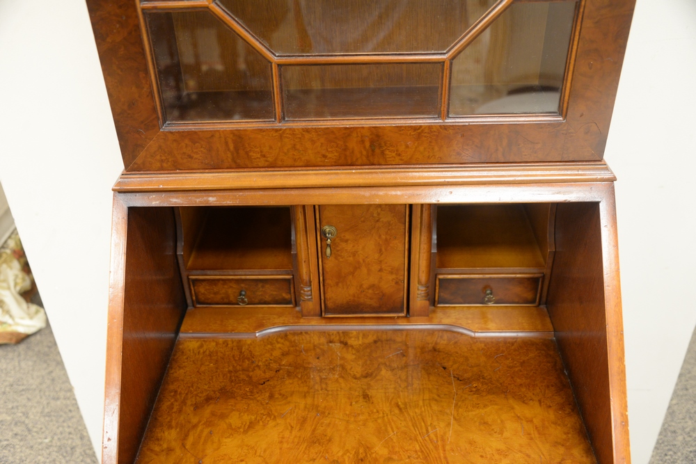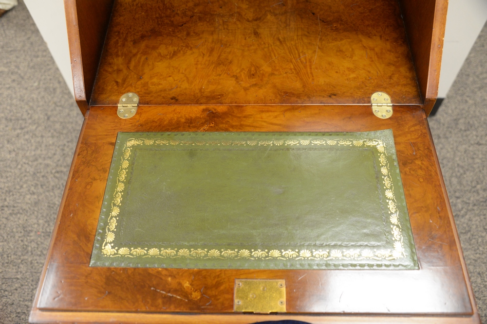 Lot 365: Burlwood Secretary Desk, having one door over drop front opening, tooled leather writing surface and fitted interior bracket base, h…