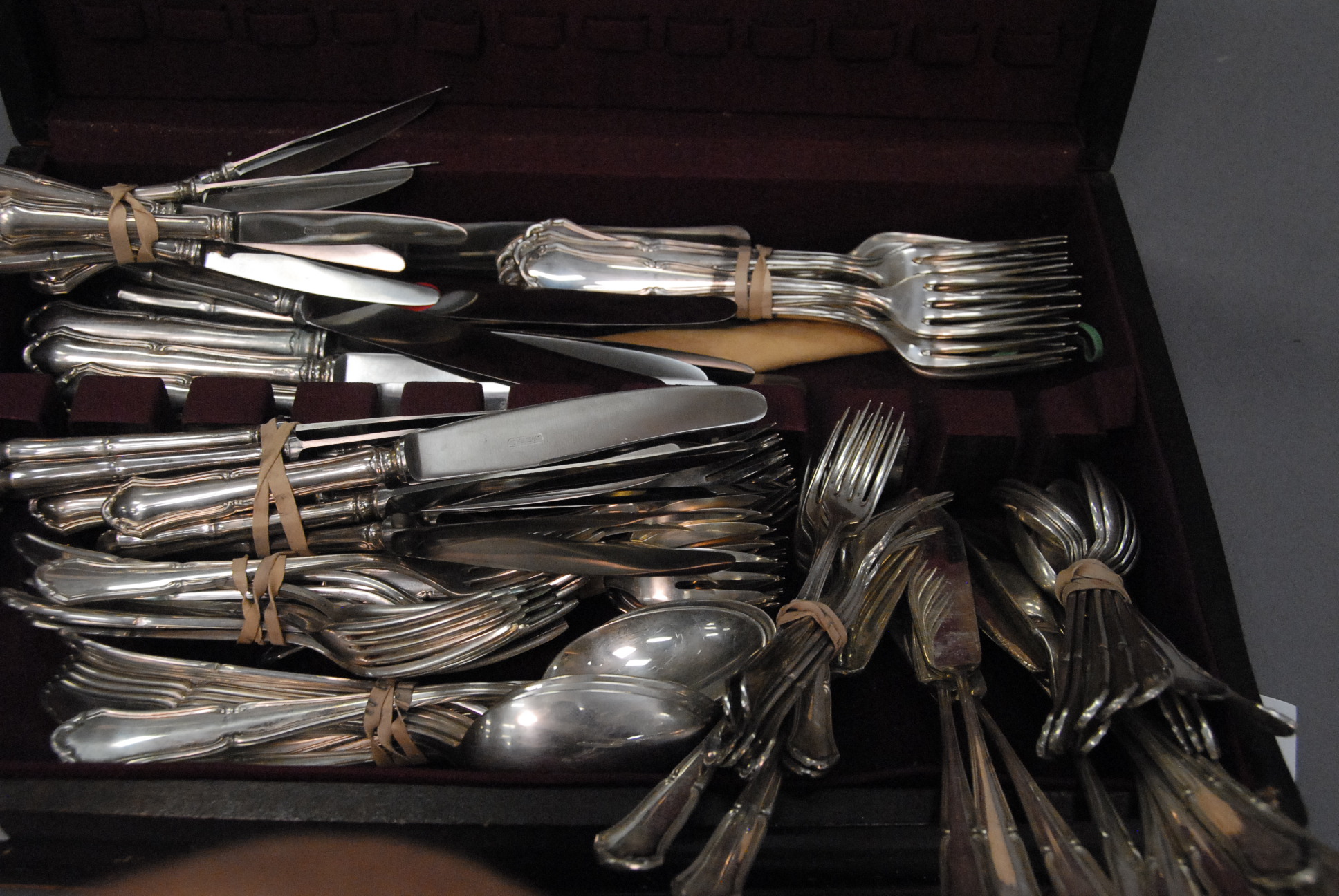 Continental silver flatware setting for twelve, one hundred twenty five pieces total.