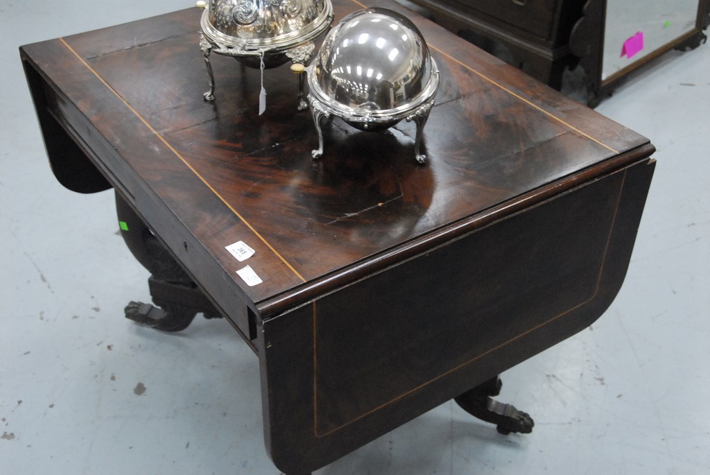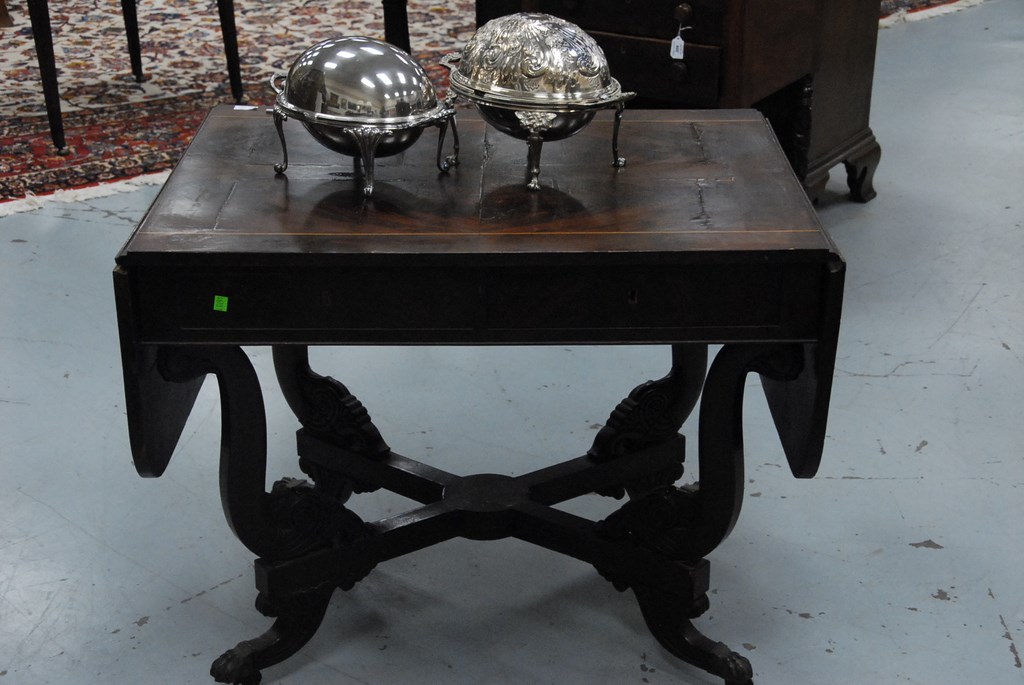 Lot 365: Federal mahogany drop leaf work table with one drawer on either side with quadrant base ending in pad feet. ht. 27in. top open: 28…