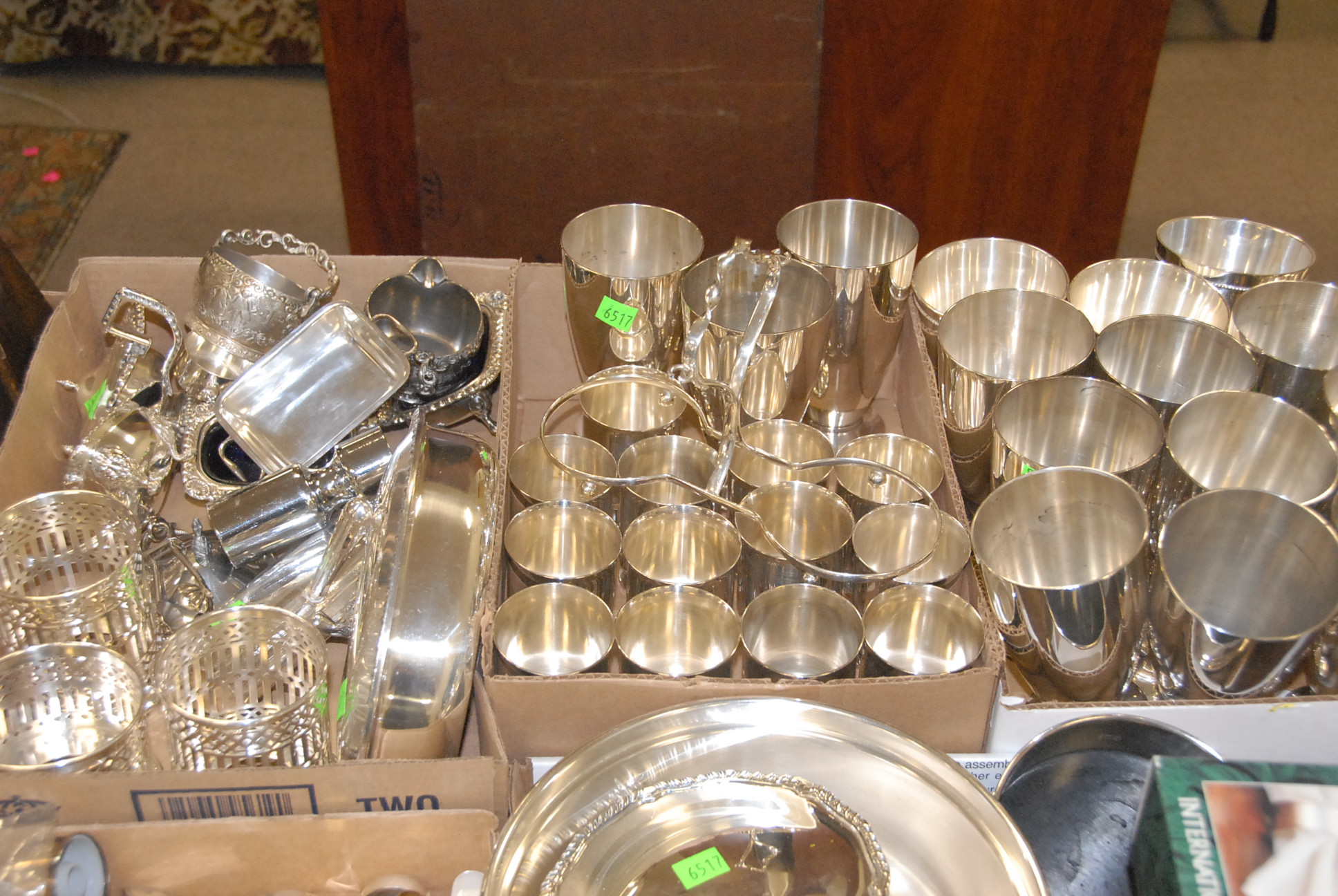 Five box lots of silverplate flatware, serving dishes, cups, etc.