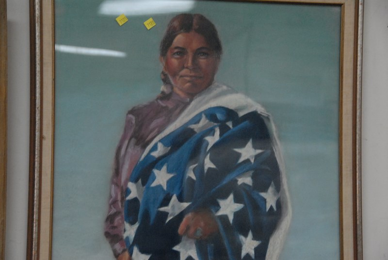 Lot 365: Four piece lot to include two Indian paintings to include Catherine Brodeur Emily Kickapoo pastel 36 x 23, and bust of an Indian C…