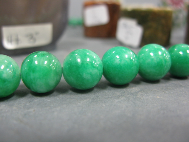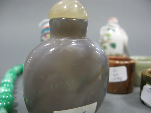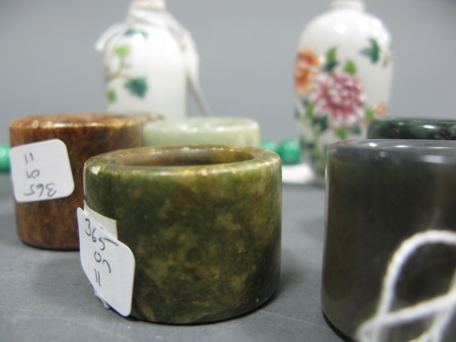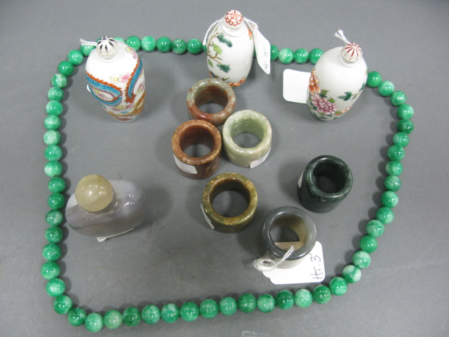 Group lot to include group of six stone and jade rings green jadeite beaded necklace three porcelain snuff bottles: one dragon snuff bottle, one blooming flower snuff bottle and one fruit snuff bottle agate snuff bottle