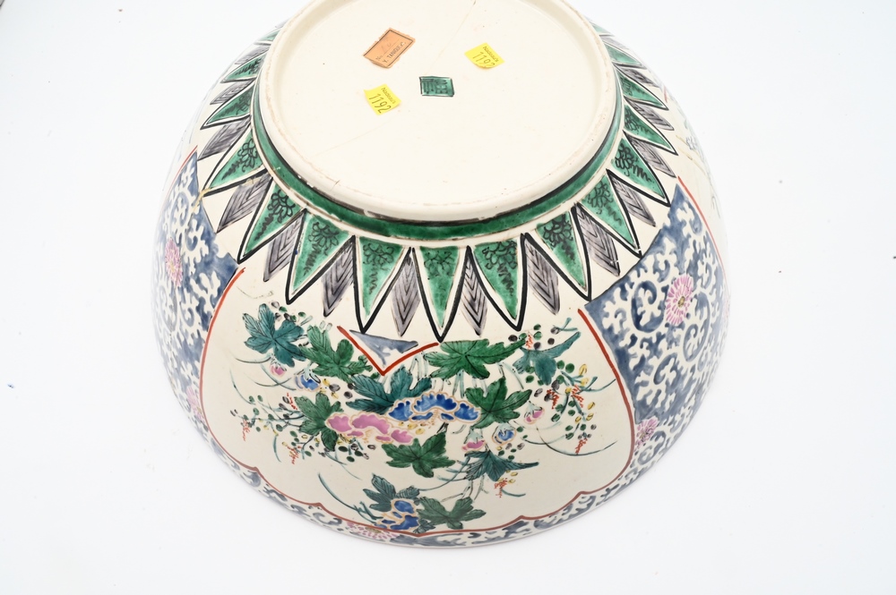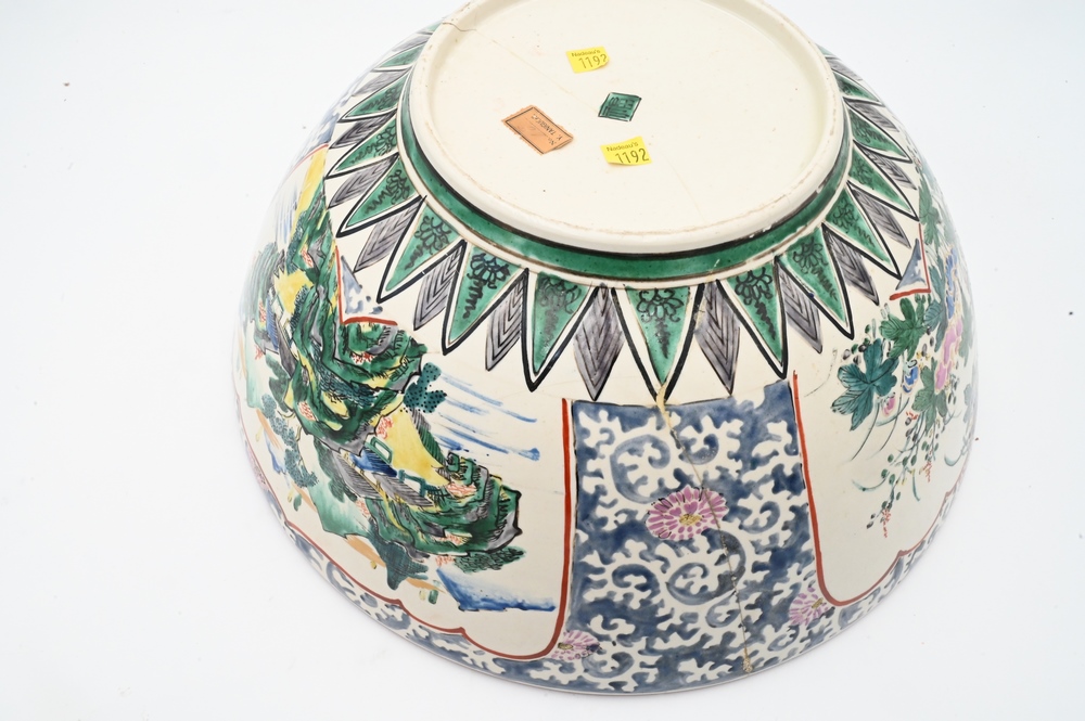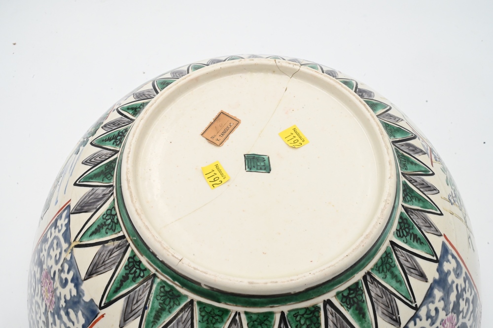 Lot 365: Large Japanese Ko-kutani Punch Bowl, 19th century, Meiji period, decorated inside and out with landscapes, star crack and pottery mark on base, height 9 inches with base, depth 18 1/2 inches.