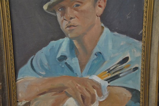 Lot 365: Margaret Fitzhugh Browne 1884-1972 PORTRAIT OF A MAN WITH PAINT BRUSHES oil on canvas written on back, 20 x 24.