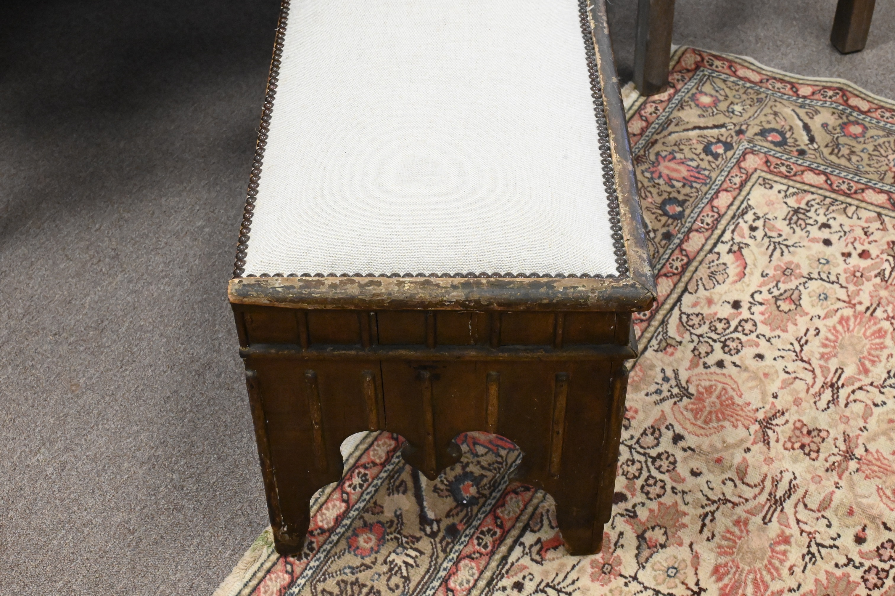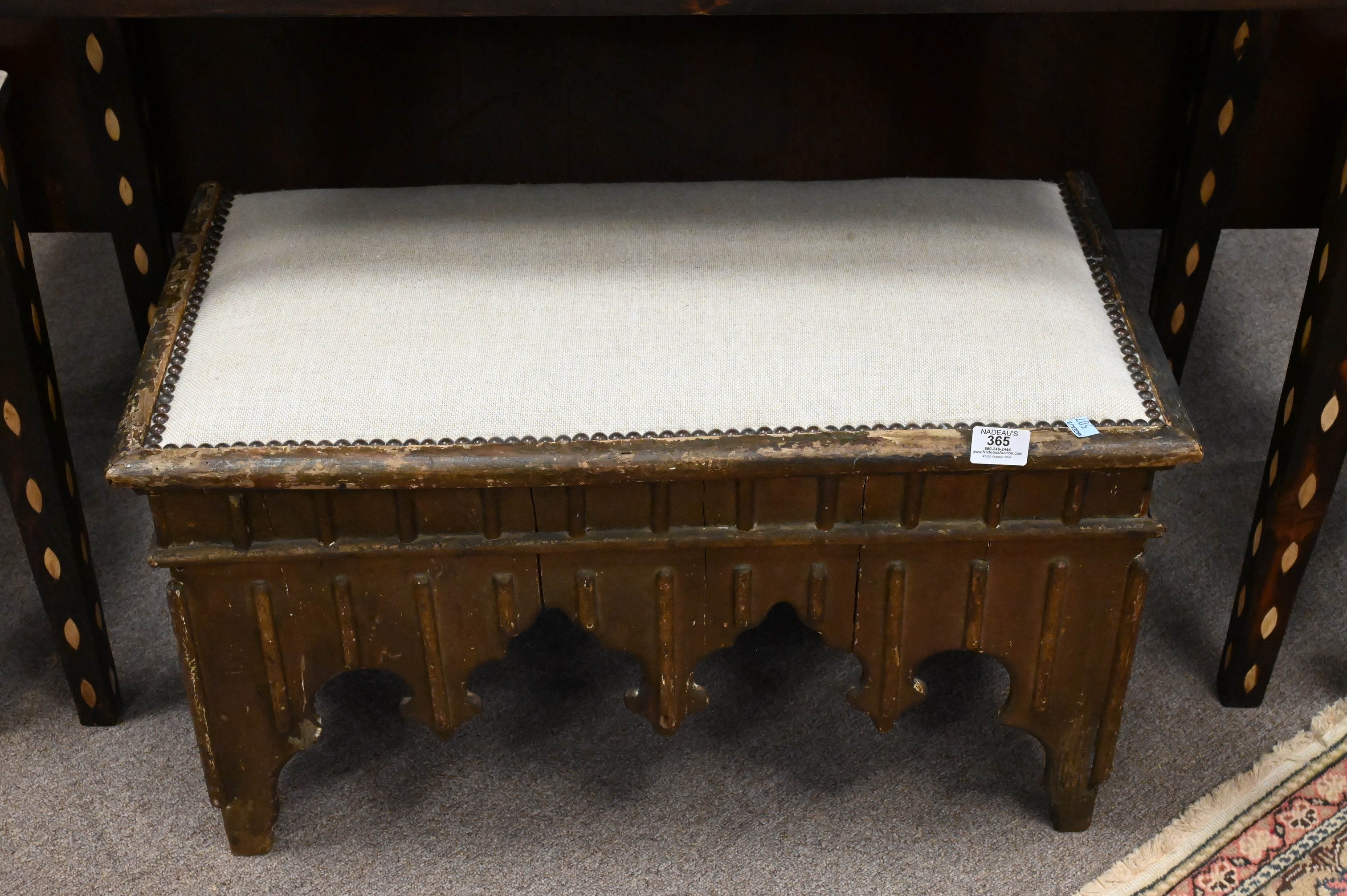 Lot 365: Moroccan Bench having Upholstered Top Over Carved Legs