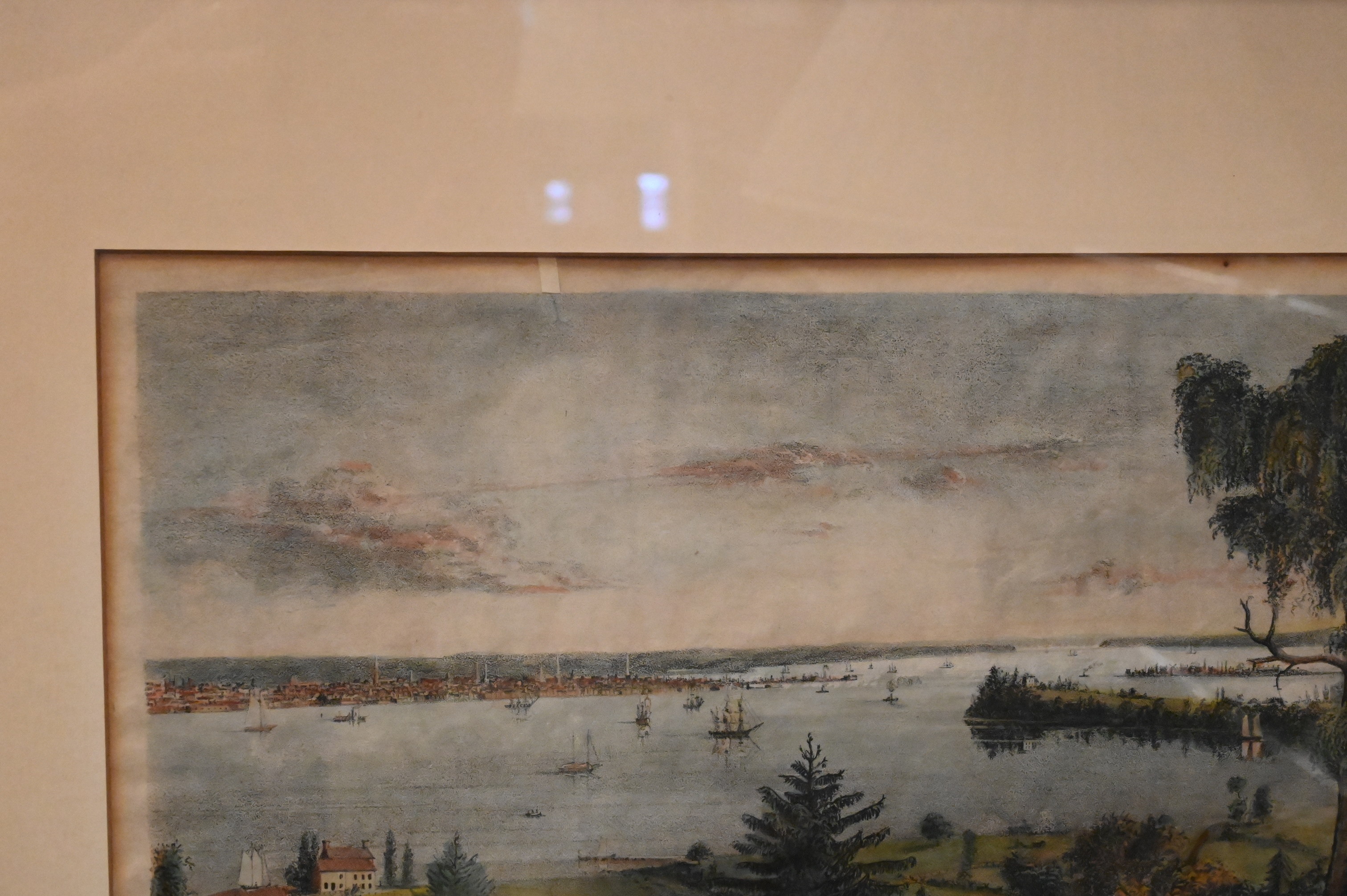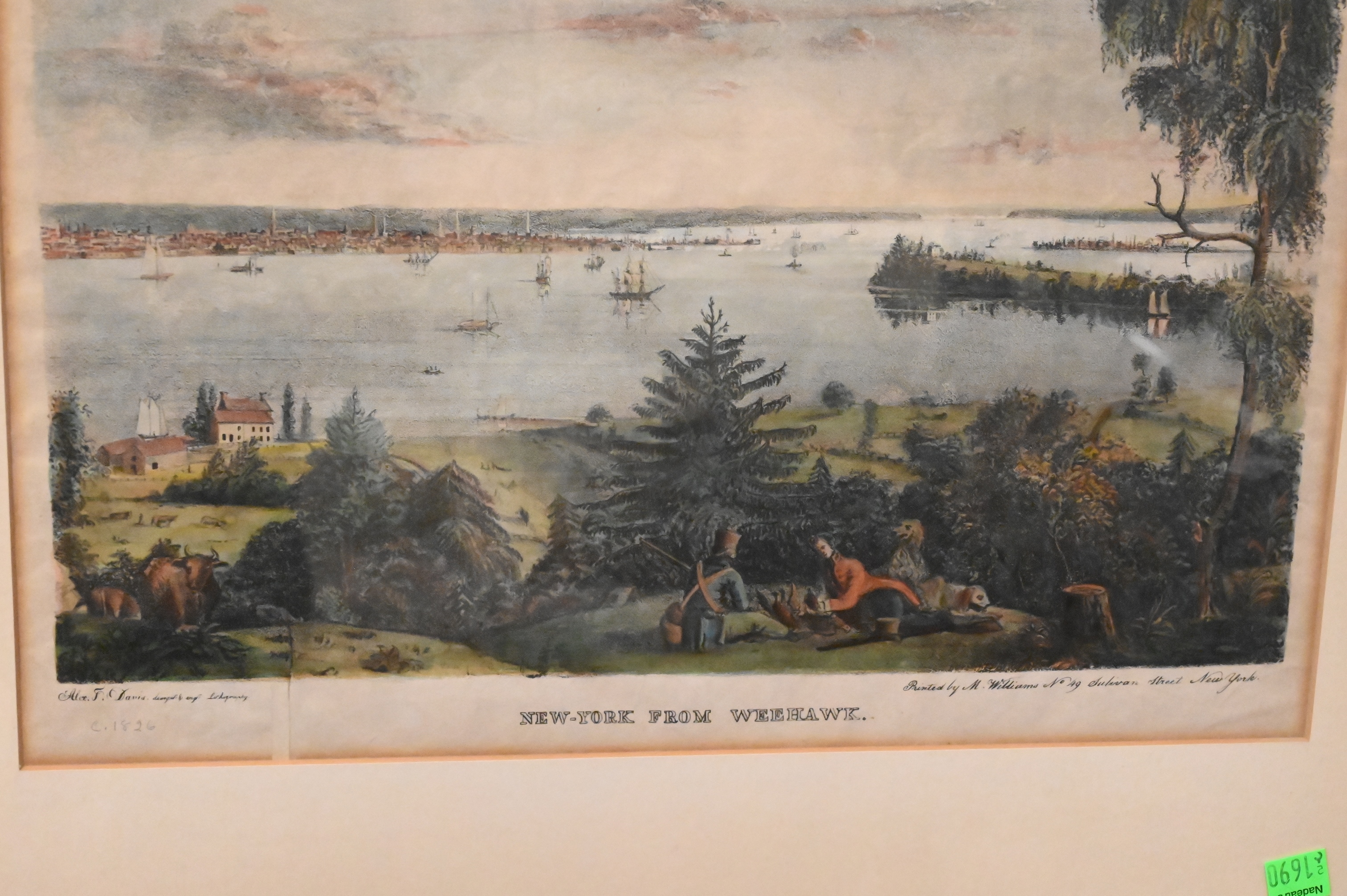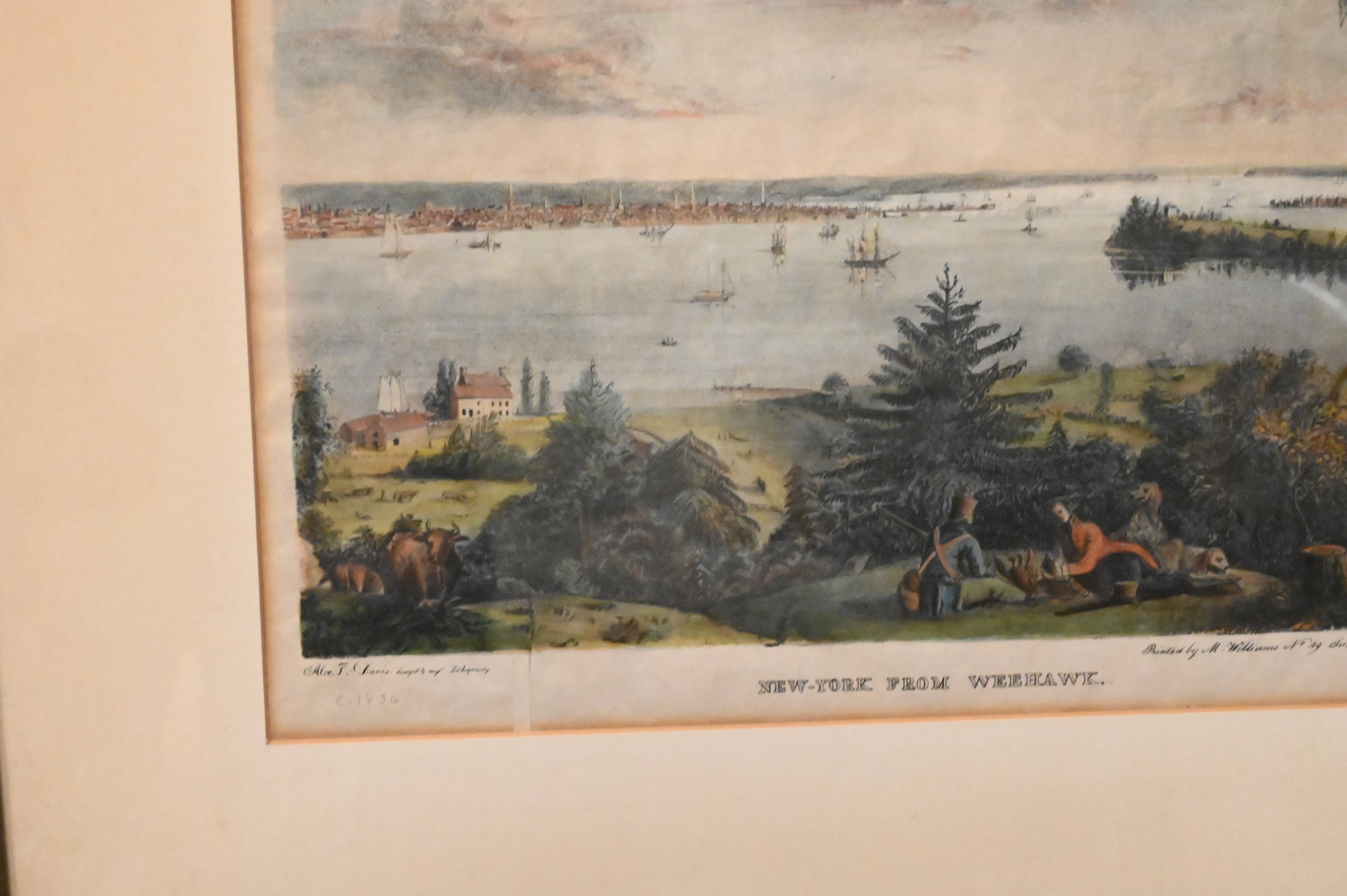 “New York From Weehawk” Circa 1826 Designed by Alex F. Davis, Printed by M. Williams hand colored lithograph having repairs to tearing 11″ x 16″