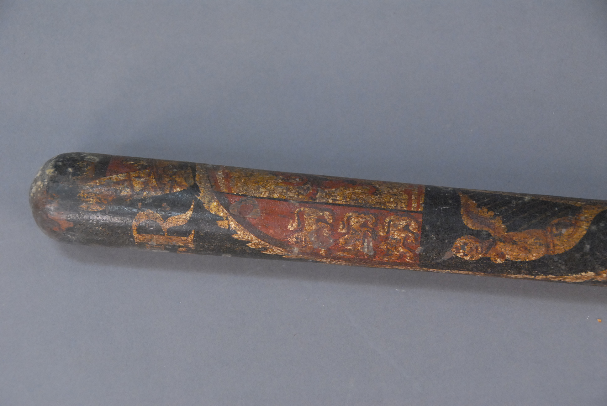 Night stick with original paint decoration and coat of arms with lions and horse, initialed GII R, late 18th early 19th century, probably English. lg. 24in.