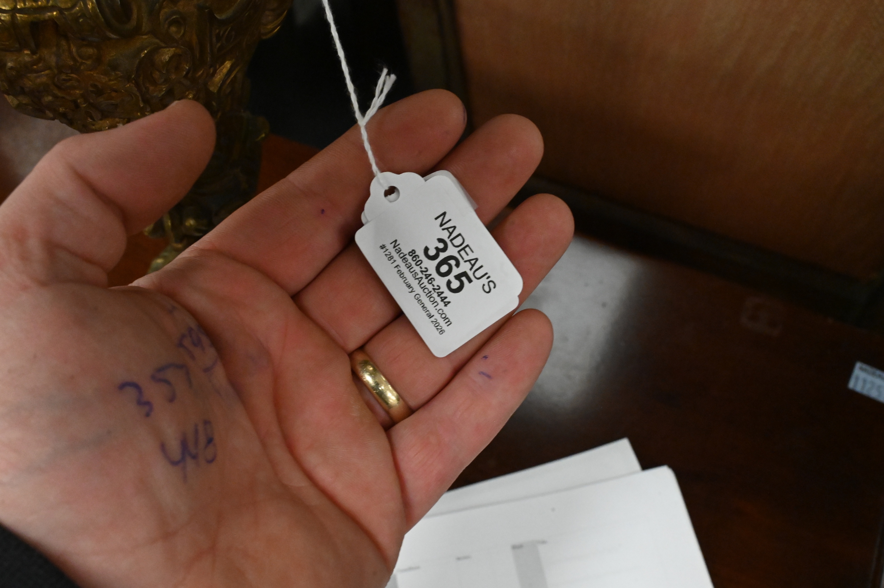 All lots are sold “AS IS.” Condition reports are available by request and answered in the order received starting the week of the sale. Our in-house buyer’s premium (for absentee and phone bidders) is 25%, with a 3% discount for payments by cash, check, wire, or Zelle. If bidding through a third-party platform, payment must be made through that platform. The online buyer’s premium for all third-party sites (Invaluable and Live Auctioneers) is 32%, third party platform users are not eligible for any discounts. Our buyer’s premium on our own website (bid.NadeausAuction.com) is 30%, with a 3% discount for cash, check, wire, or Zelle payments for buyers using only our site or bidding in-house.