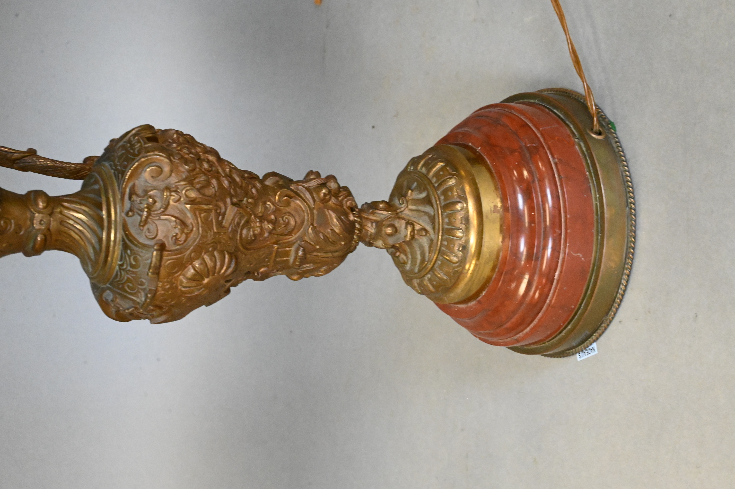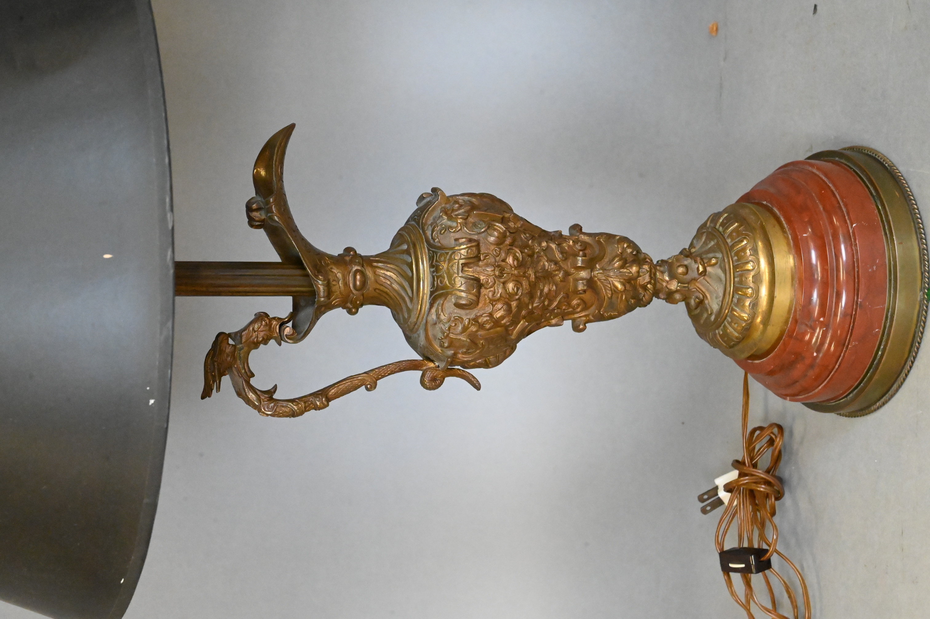 pair of French gilt-bronze mounted figural ewer-form lamps, each with scrolling acanthus and rocaille decoration, stylized dragon-form spouts, and tiered circular bases with red marble and gilt-bronze accents, later converted to electric lamps, modern shades included, late 19th century