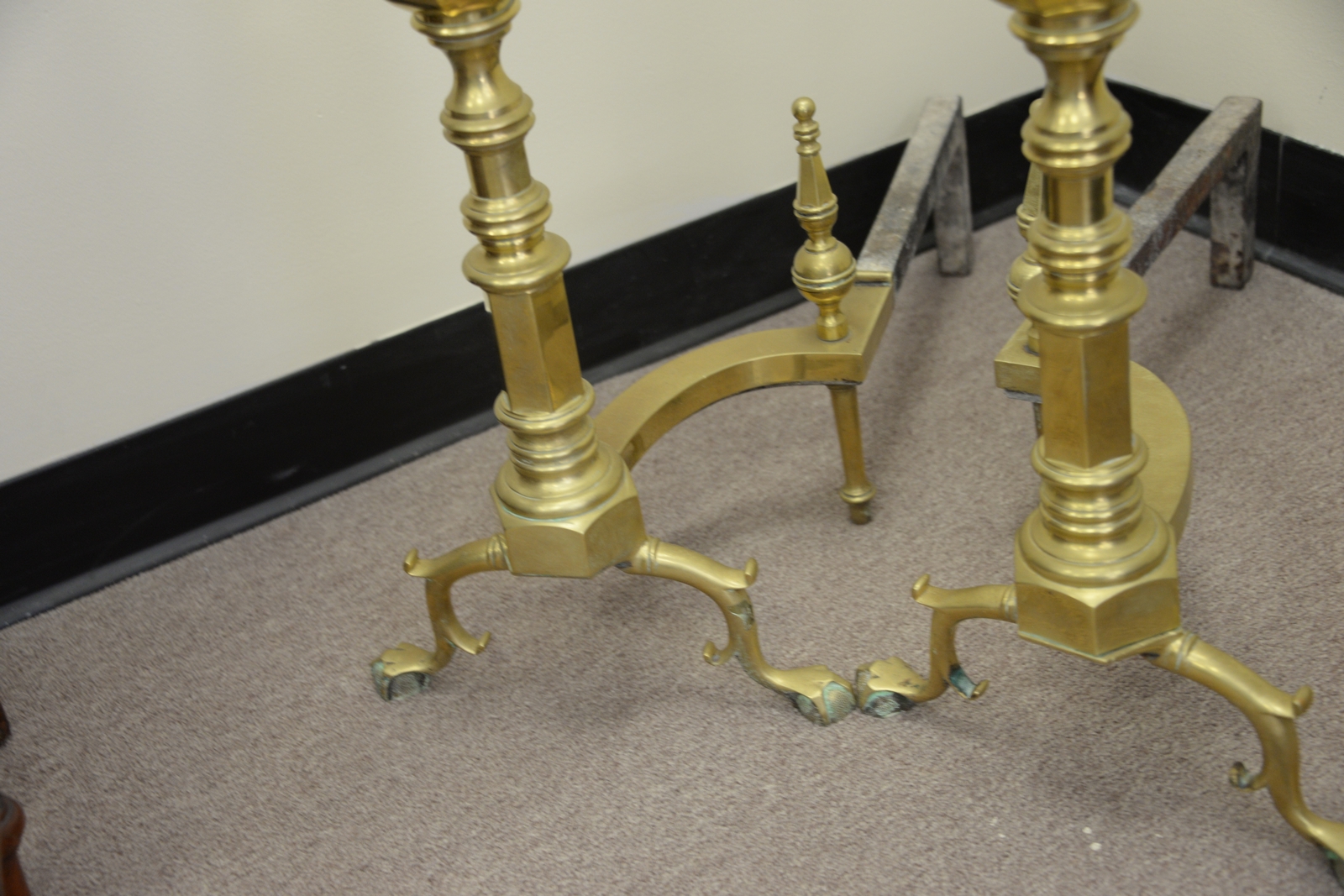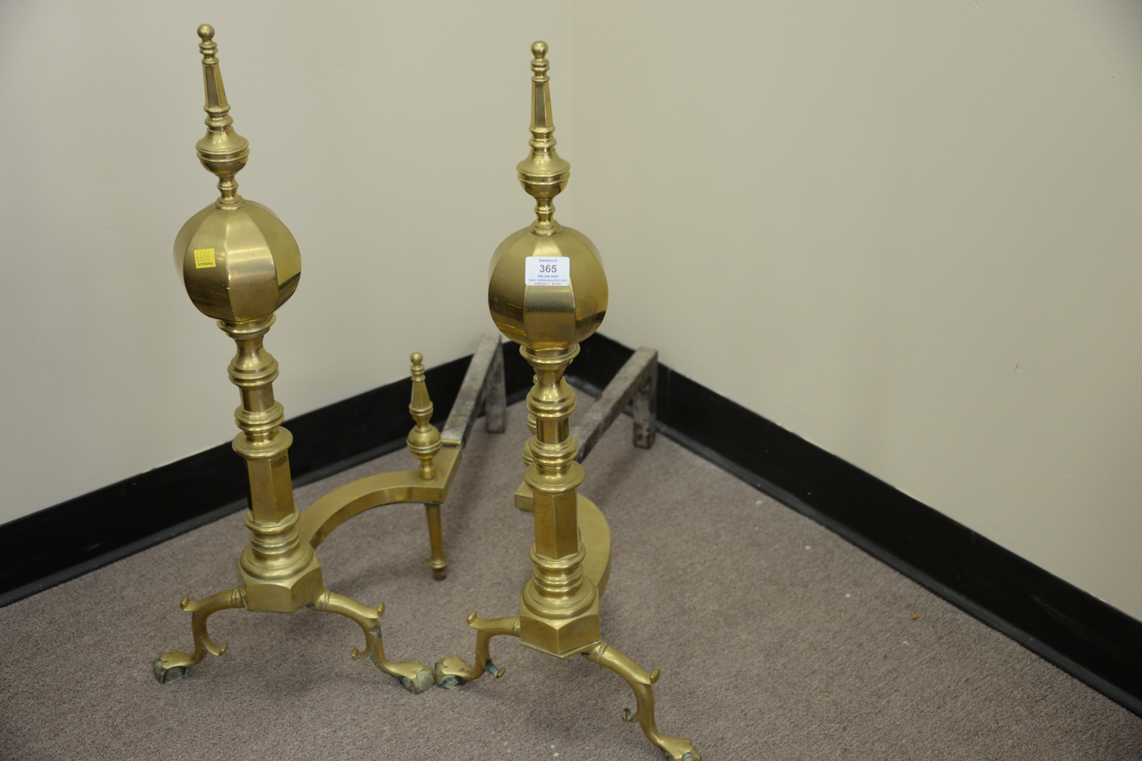 Pair of tall brass steeple top andirons with log stops, 20t century. ht. 29in.