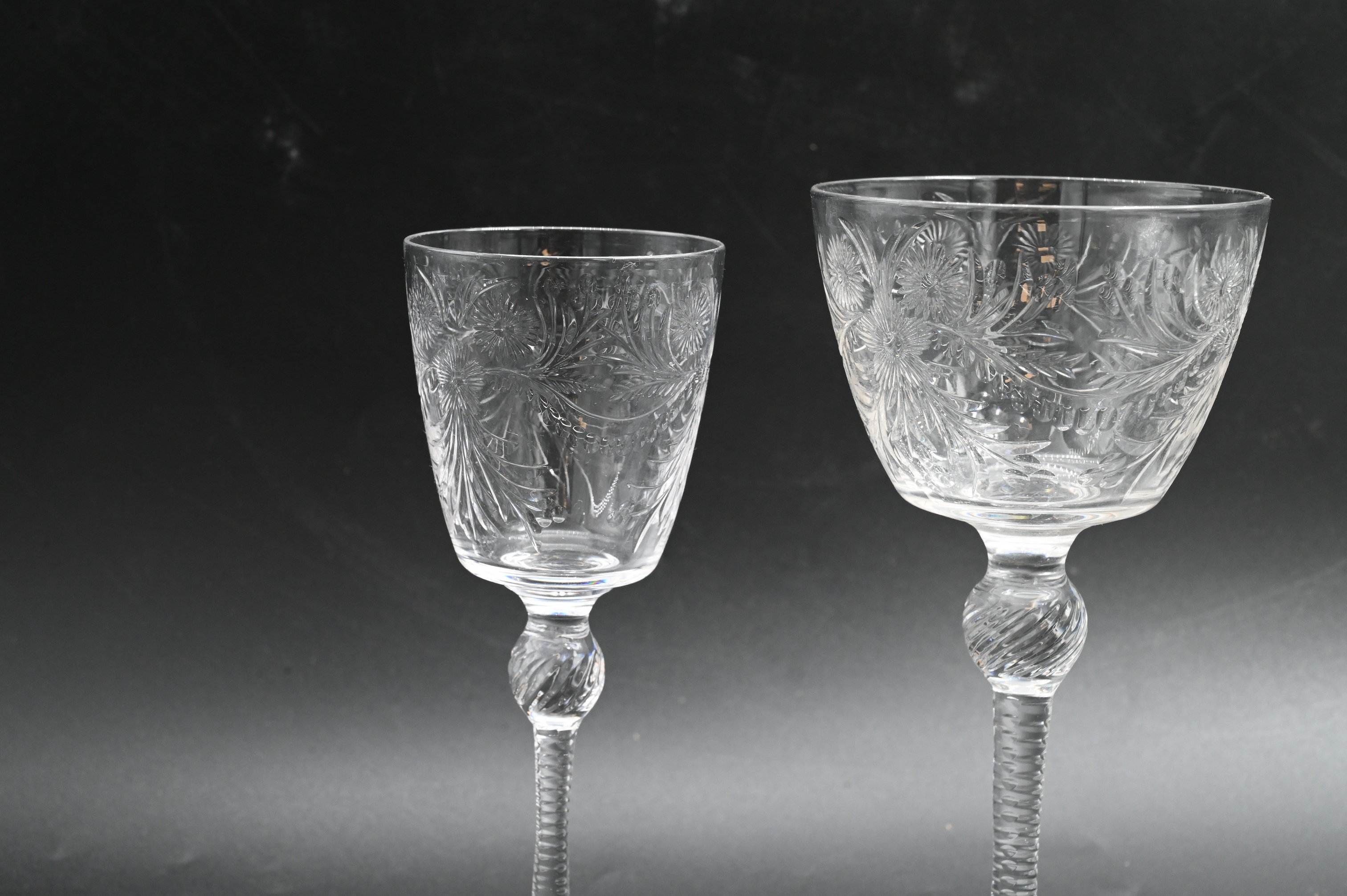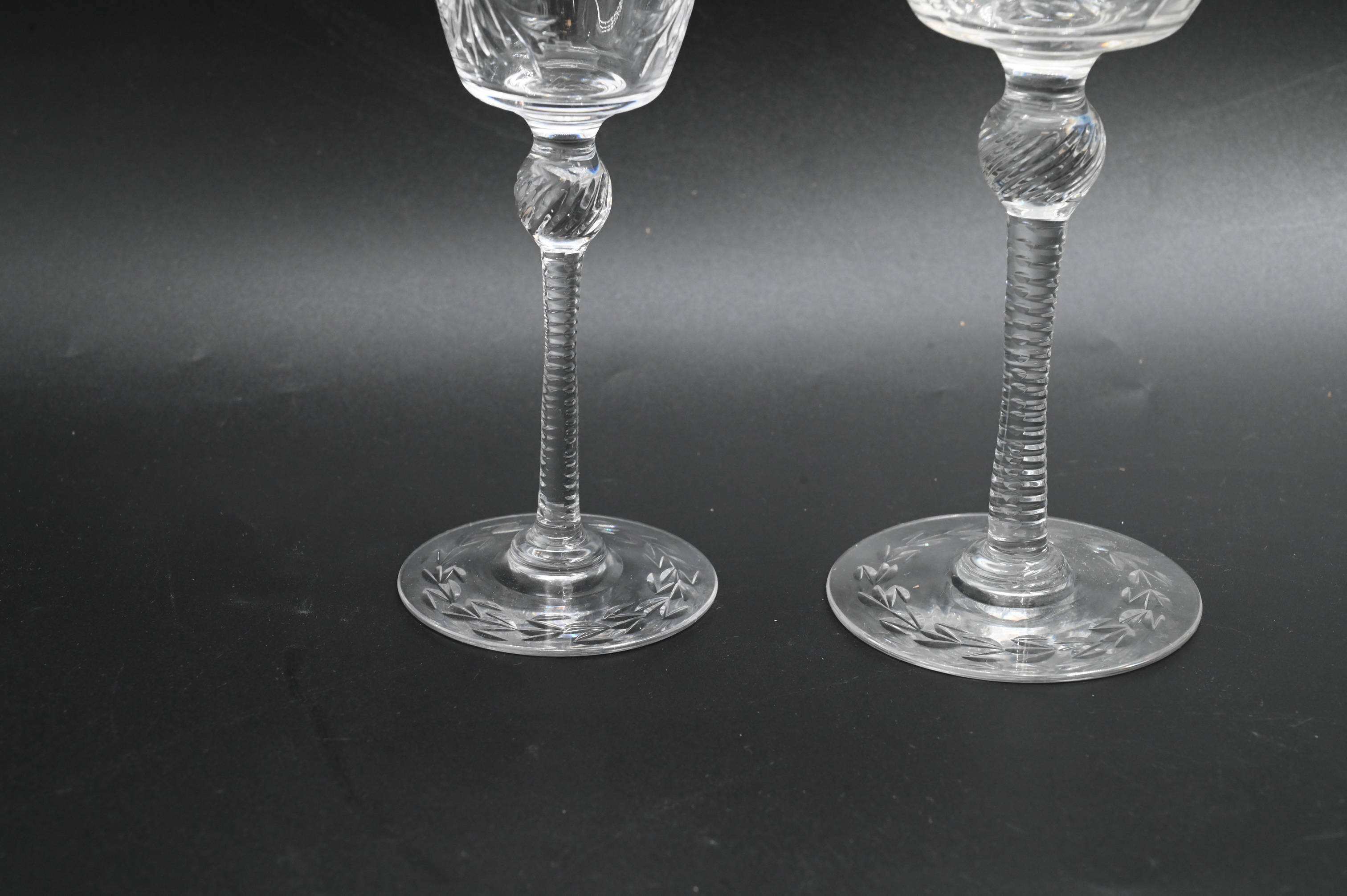 eight cordials and ten wines, in the manner of Hawks, having etched scrolling foliate and flower motif