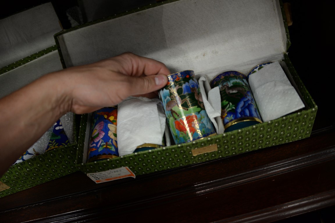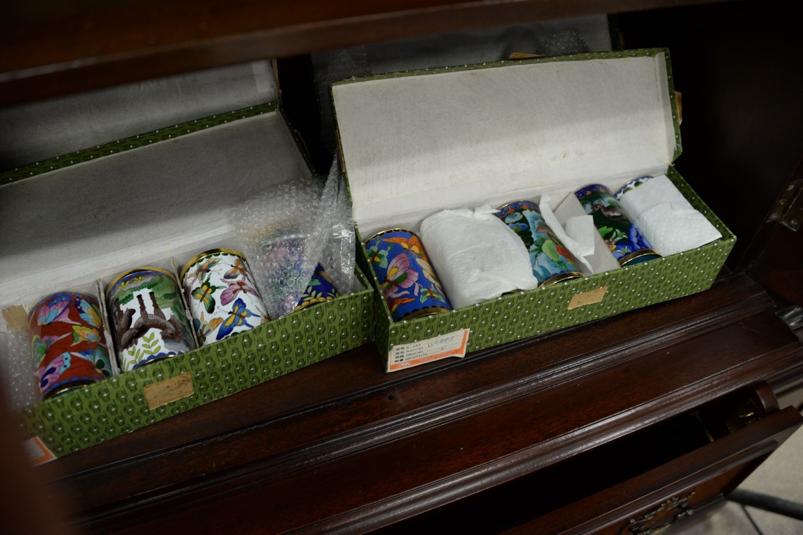 Lot 365: Set of thirty Chinese Cloisonne cups, chrysanthemum and birds, horses, deer, butterflies, fish, and ducks. ht. 4in.