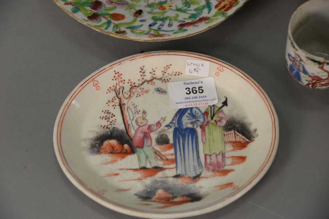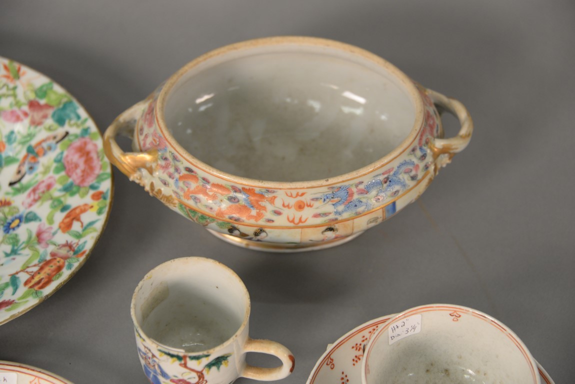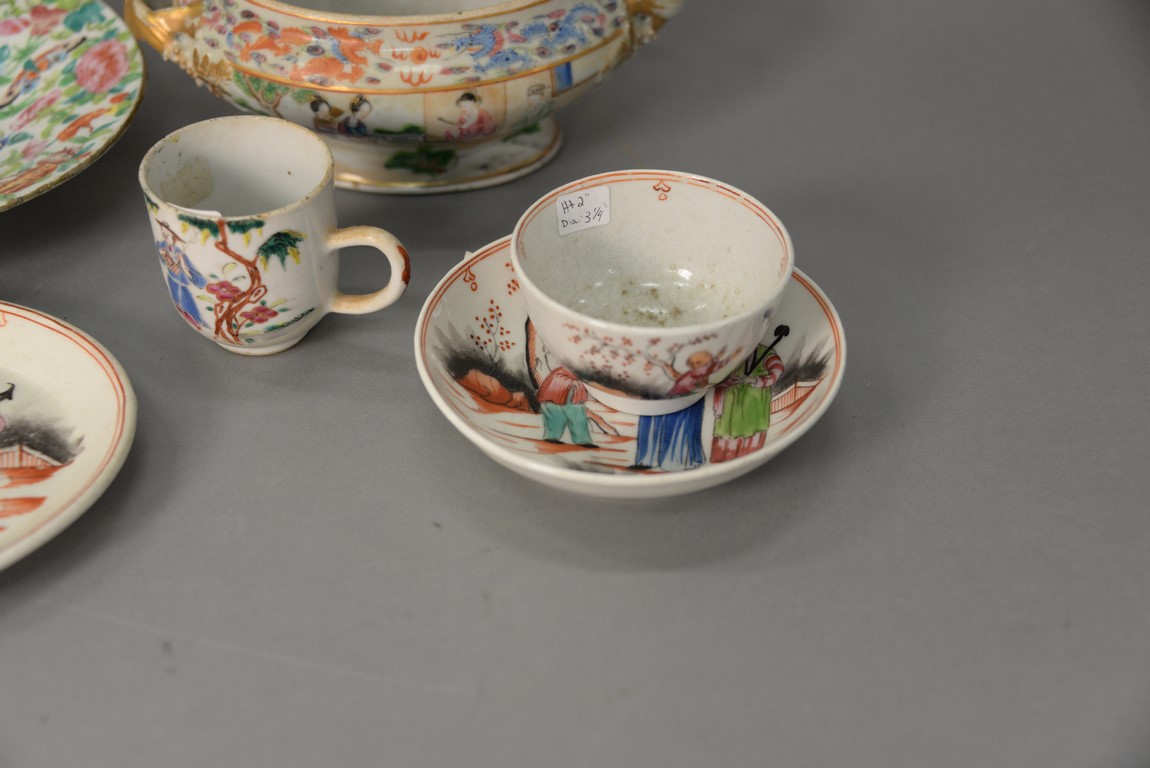 Lot 365: Six piece Chinese lot Famille Rose small tureen and small plate as is, Export cups, one saucer,and one small platter.