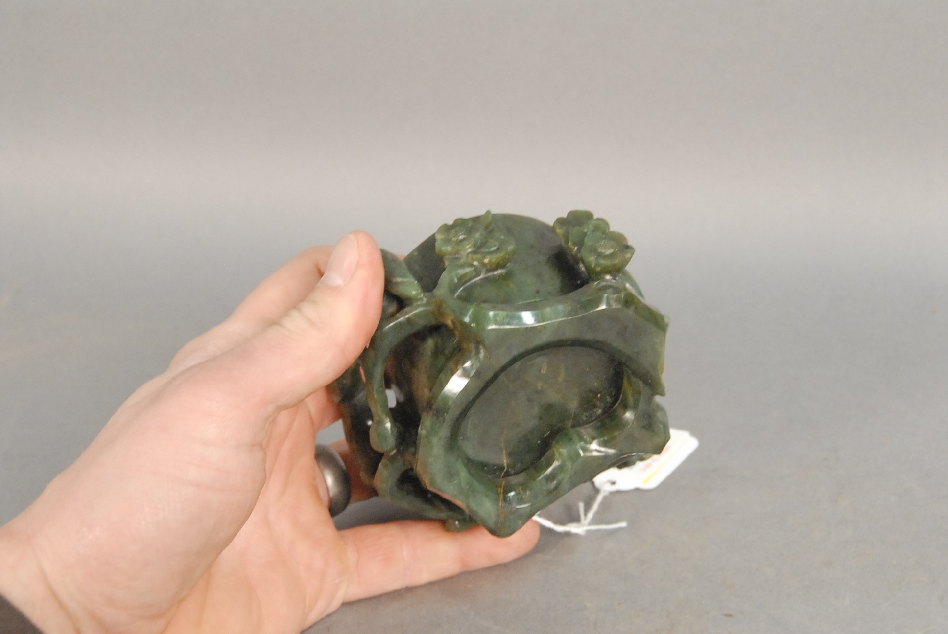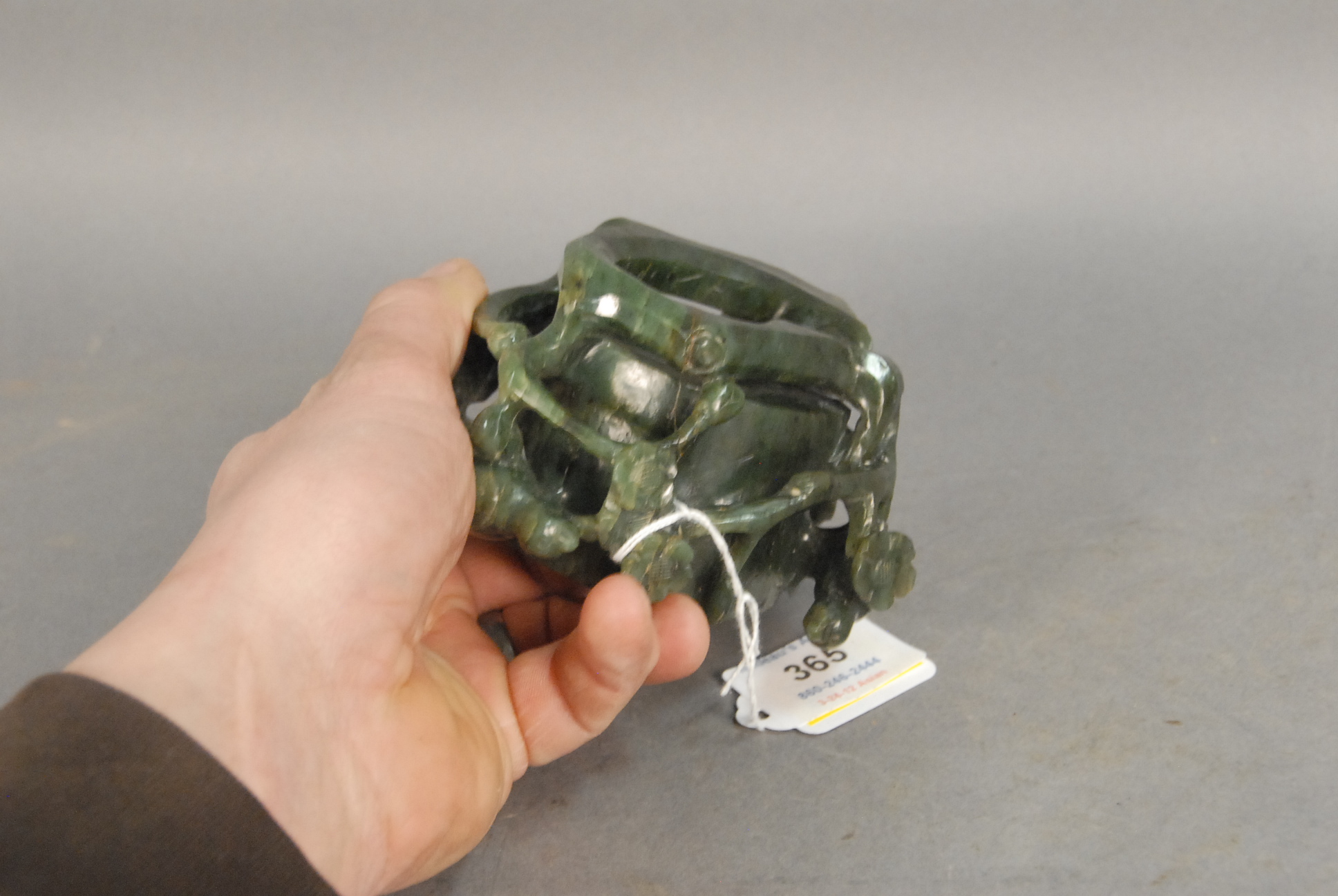 Spinach green jade cup having carved branches with birds and flowers on them, ht. 2 1/4, wd. 4 1/4.
