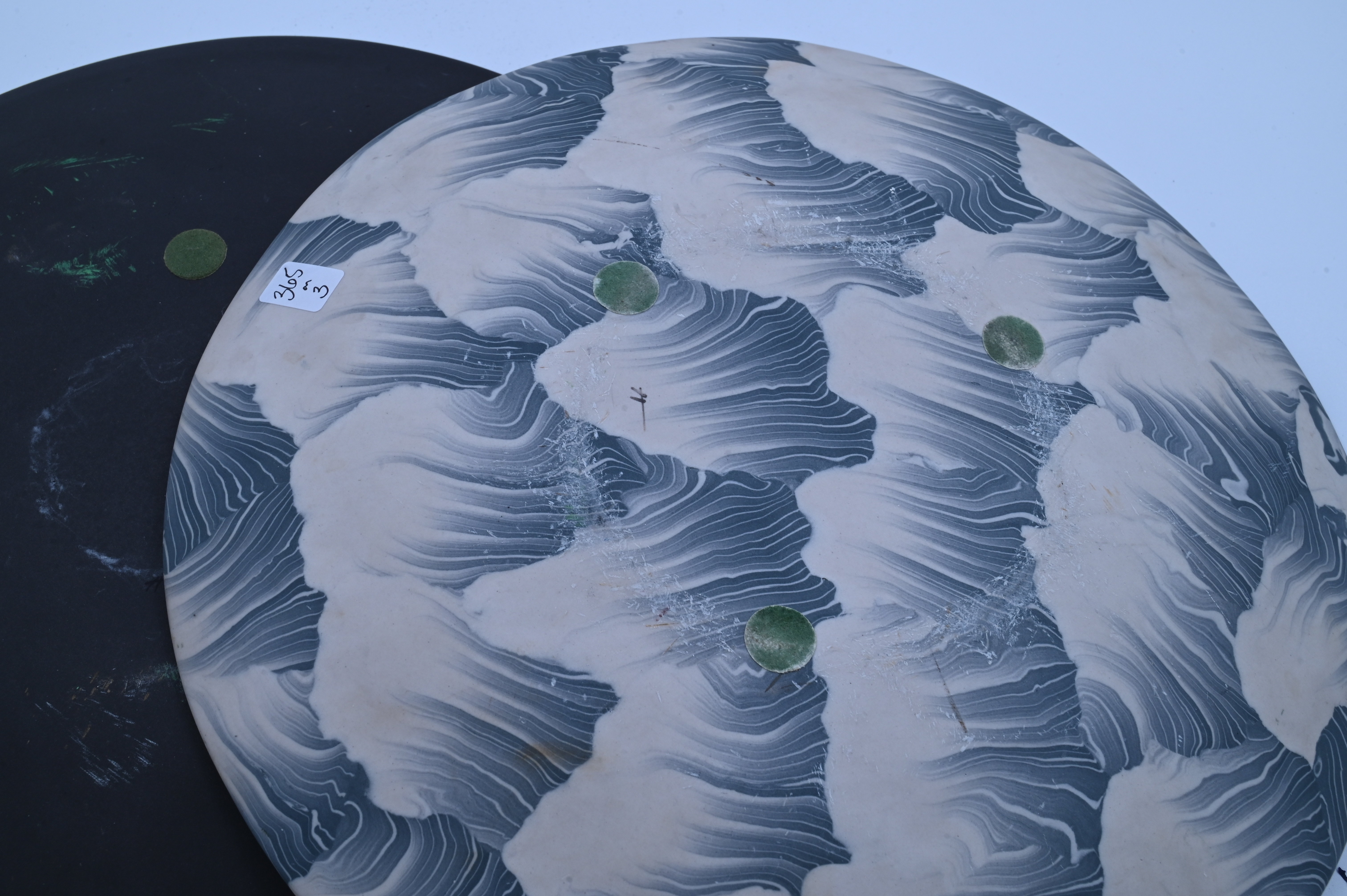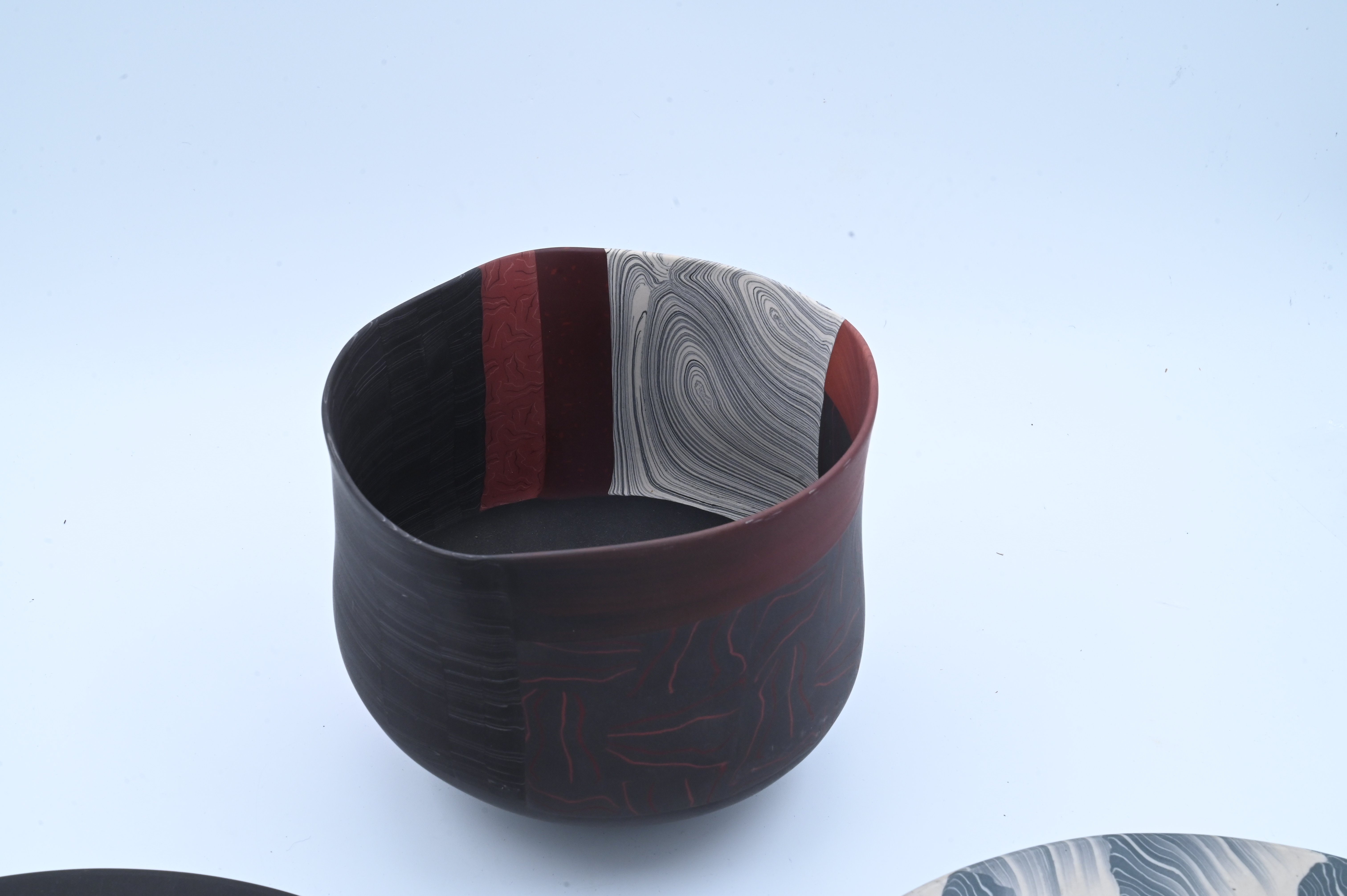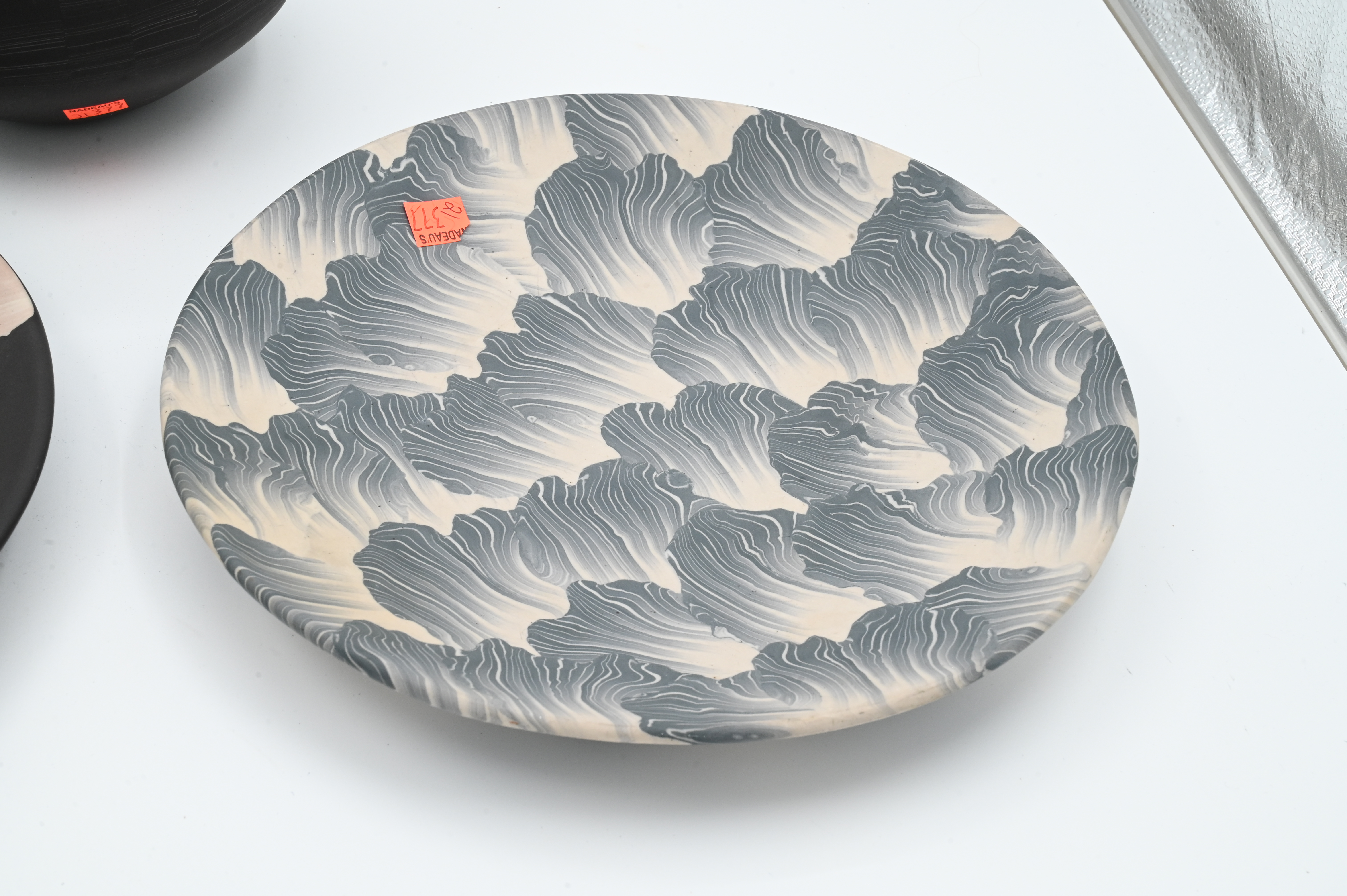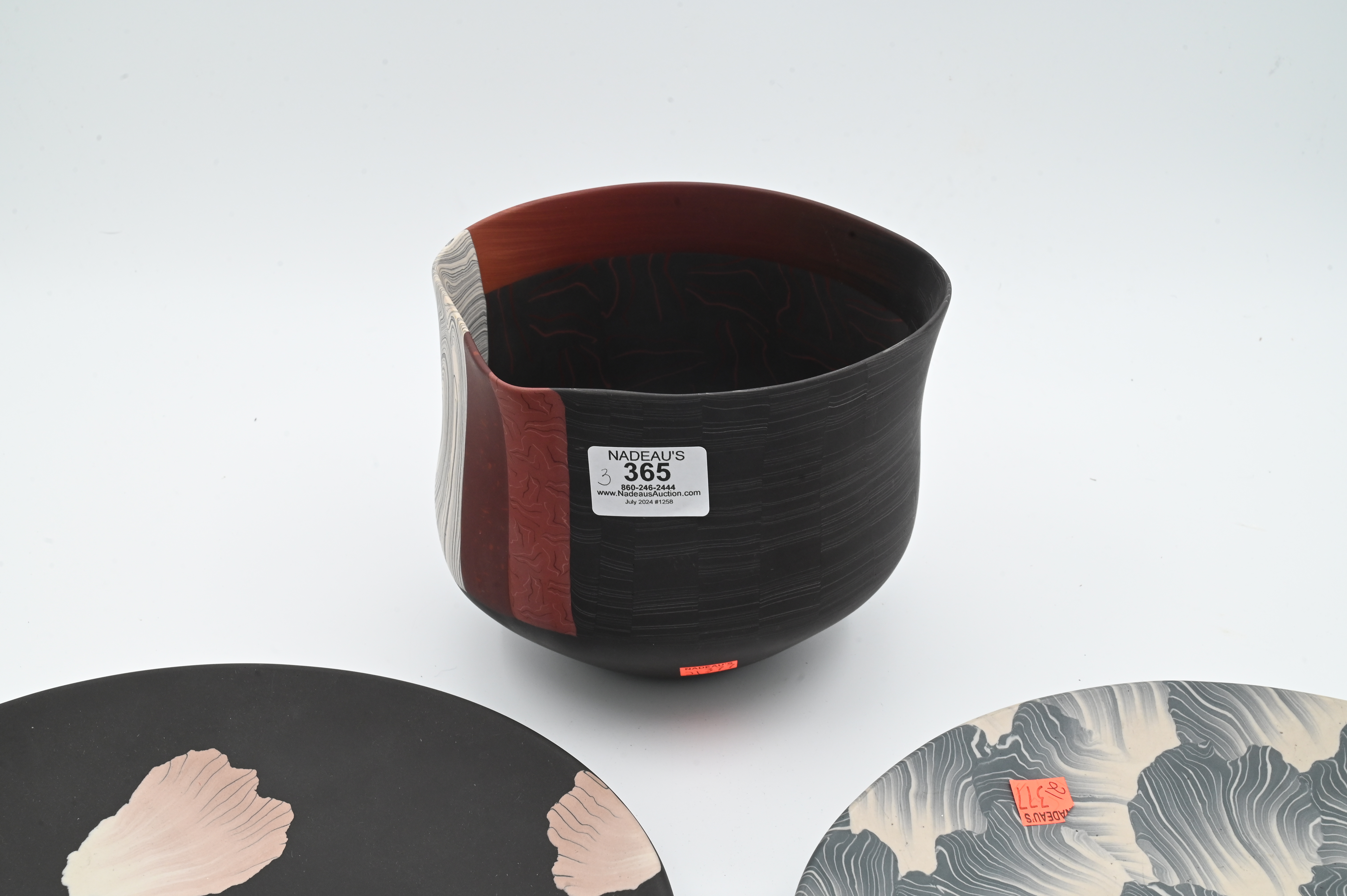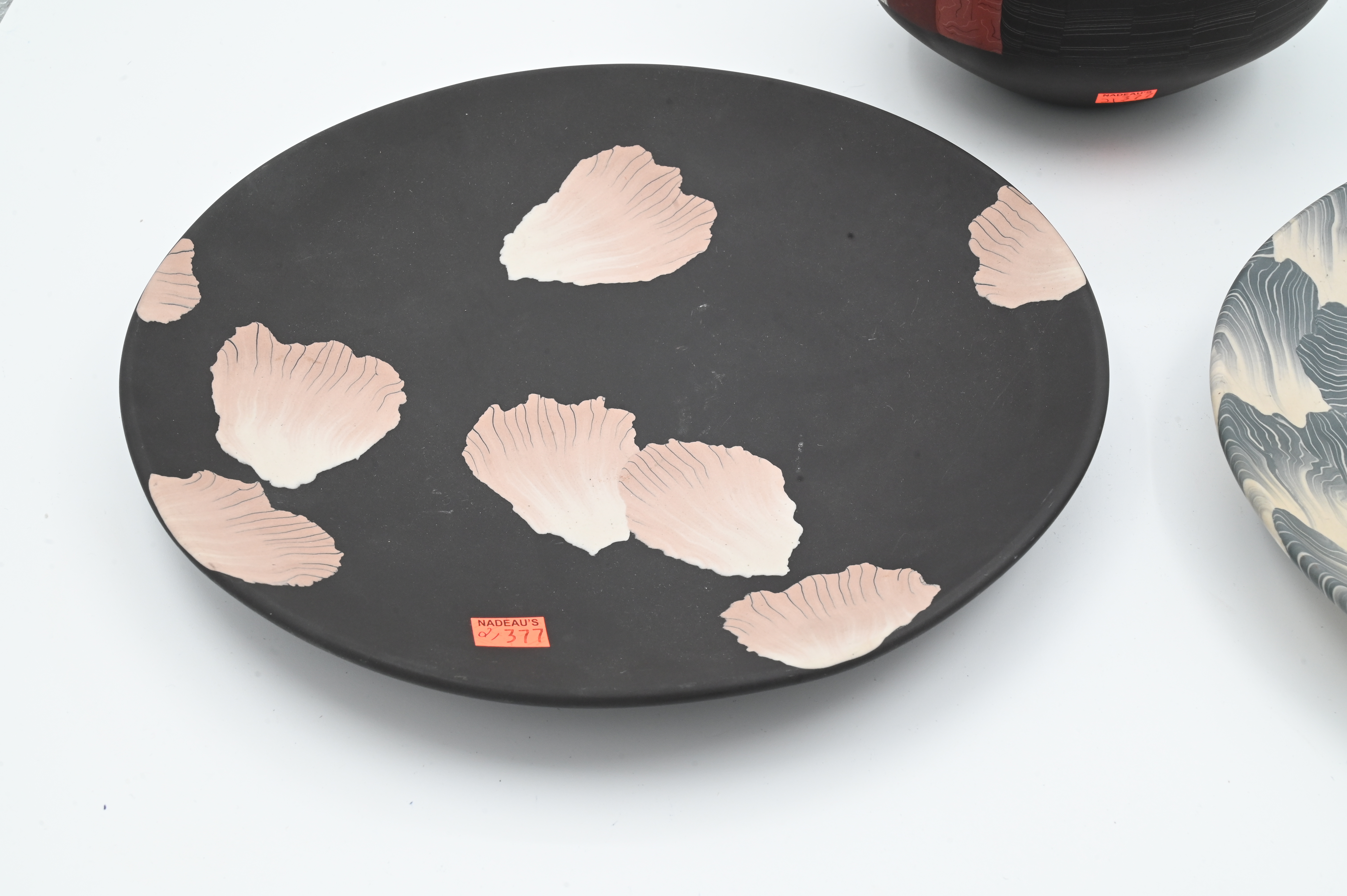 Nerikomi porcelain bowl signed on base “TH”, black porcelain plate having flower petals signed on base “TH”, blue gray porcelain plate having wave design signed on base “TH”