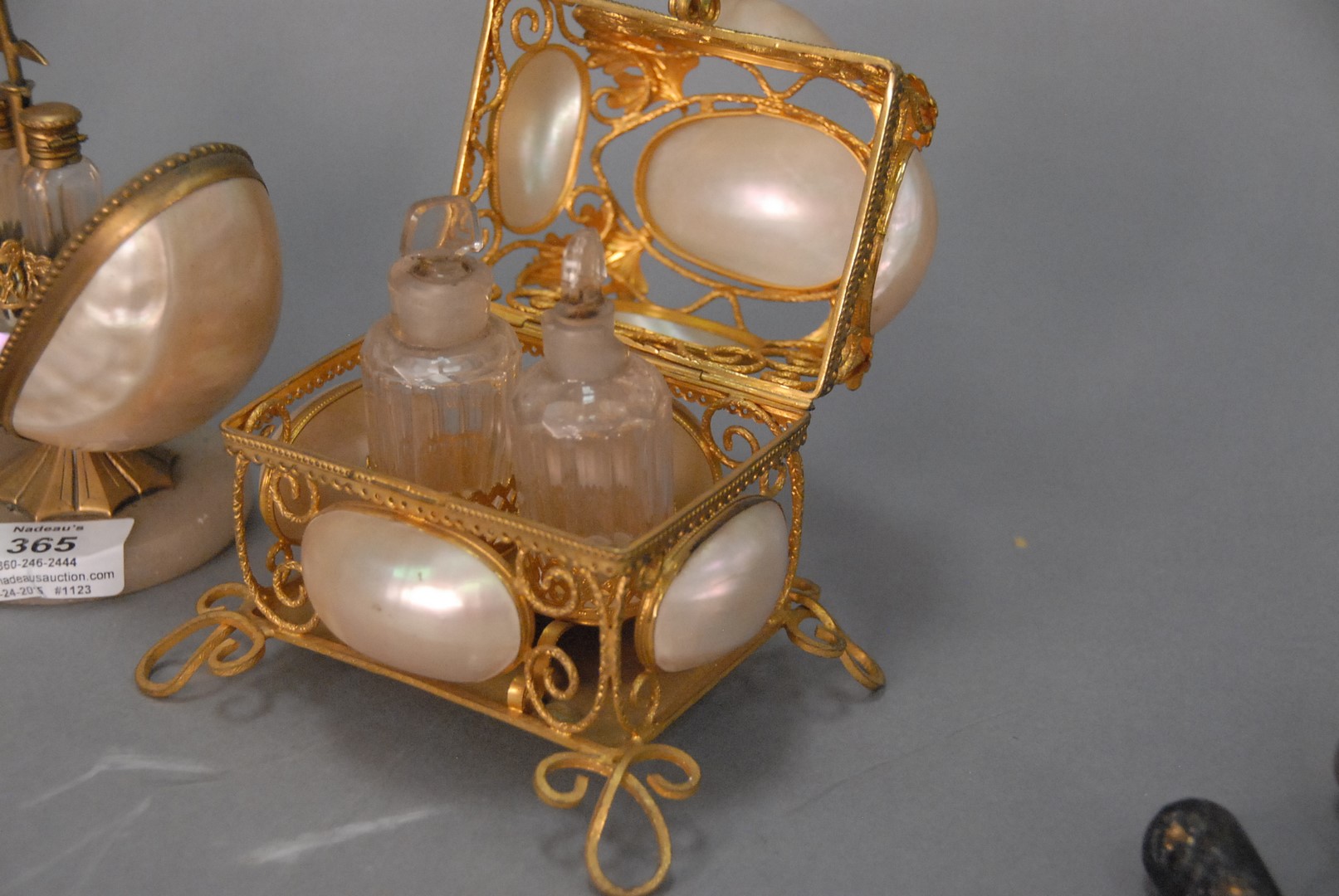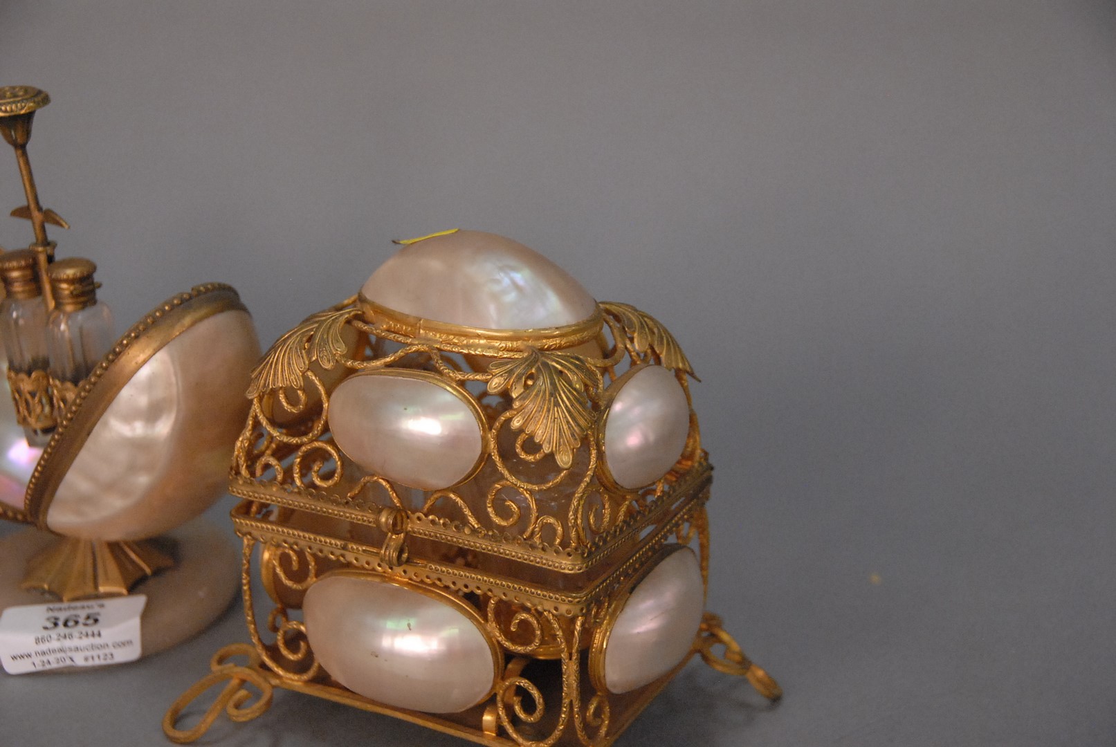 Lot 365: Three Victorian mother of pearl and brass items including hinged covered box with two perfumes, snail pediment release with two larg…