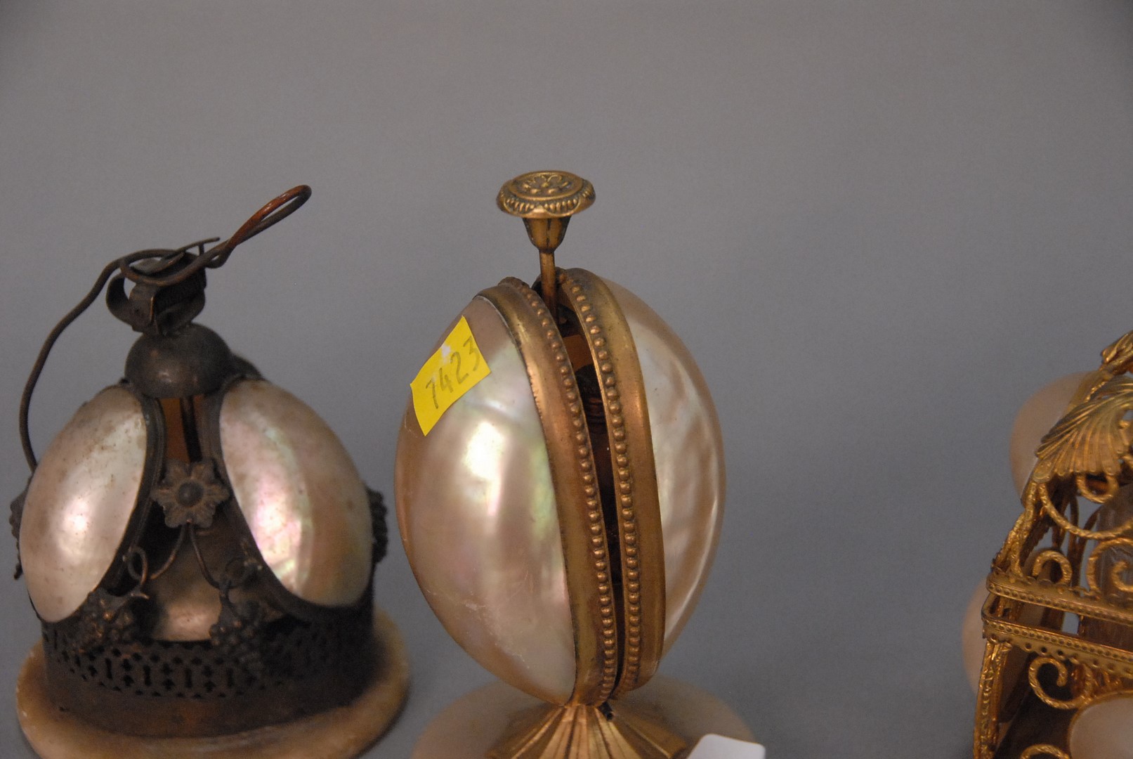 Three Victorian mother of pearl and brass items including hinged covered box with two perfumes, snail pediment release with two large hinged pearl shells, and small bell with three shells.