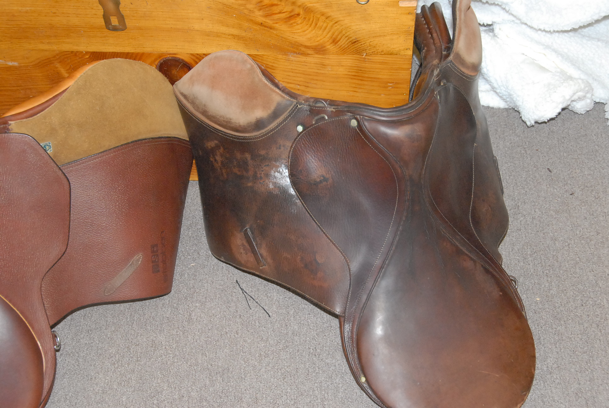 Horse riding gear to include two English riding saddles one marked Stubben along with a custom wooden lift top box with bridles and cleaning accessories and horse blankets