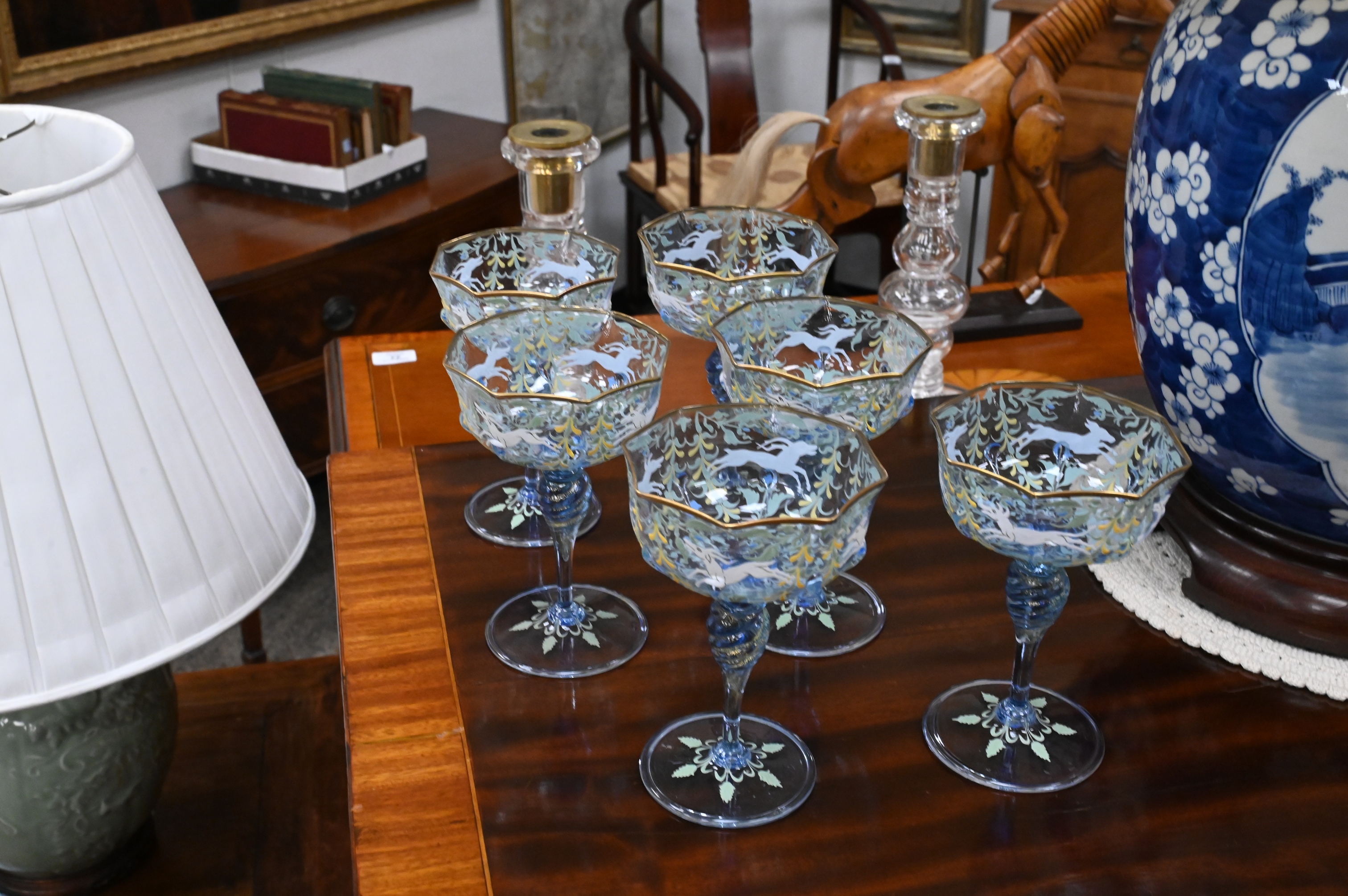 to include nine stems, six finger bowls, eight plates, and seven under plates