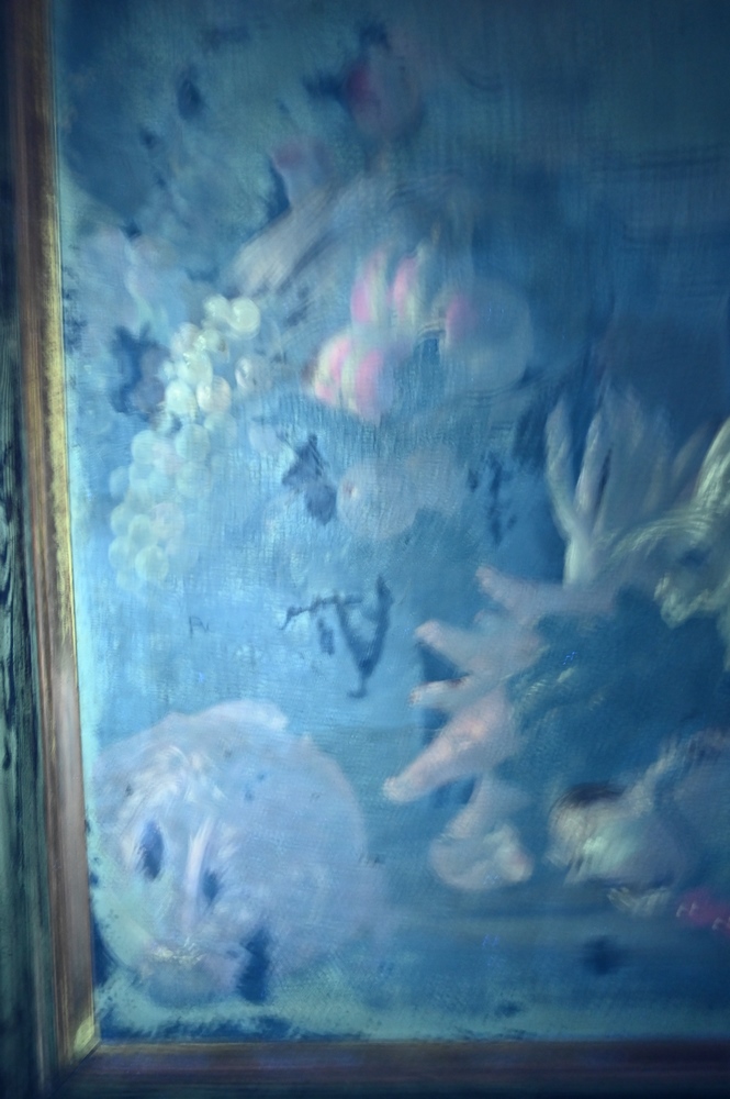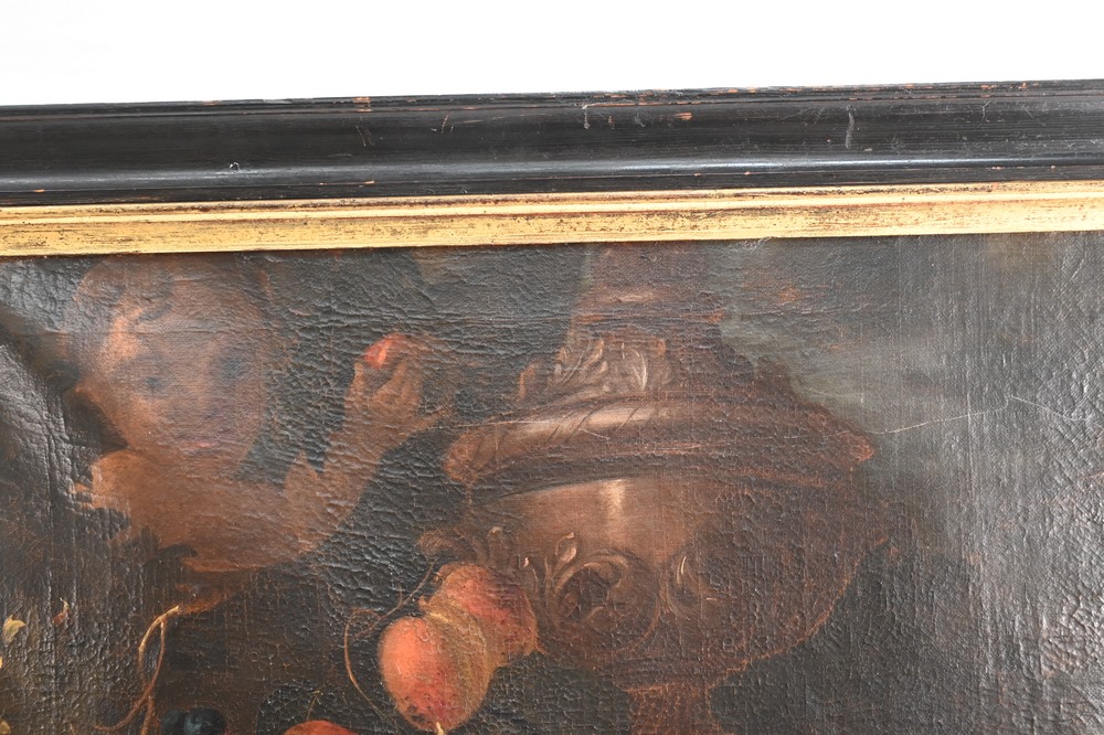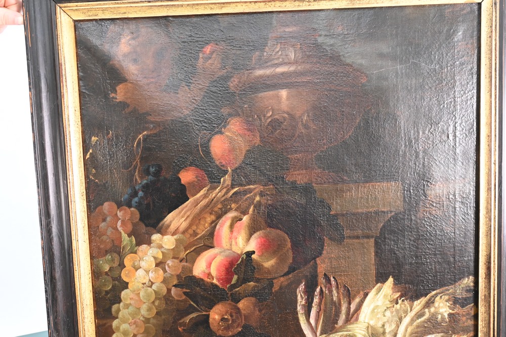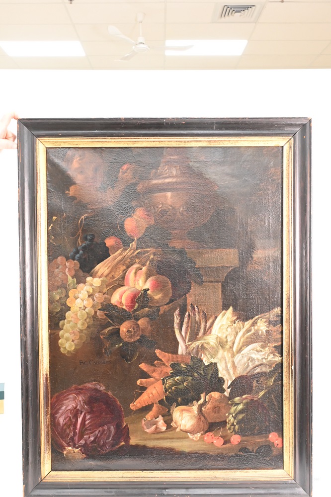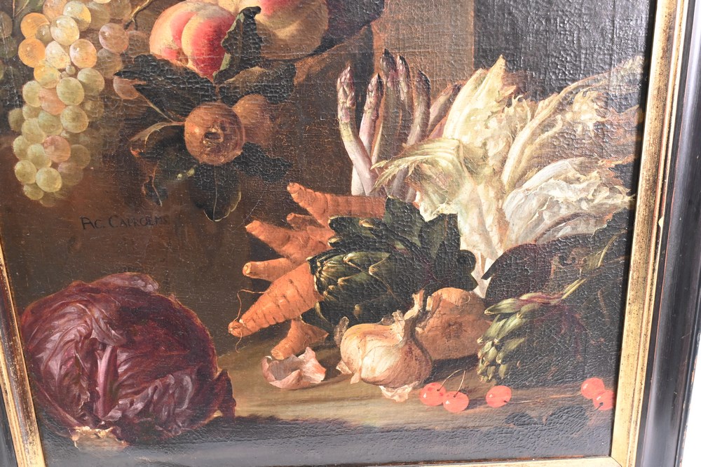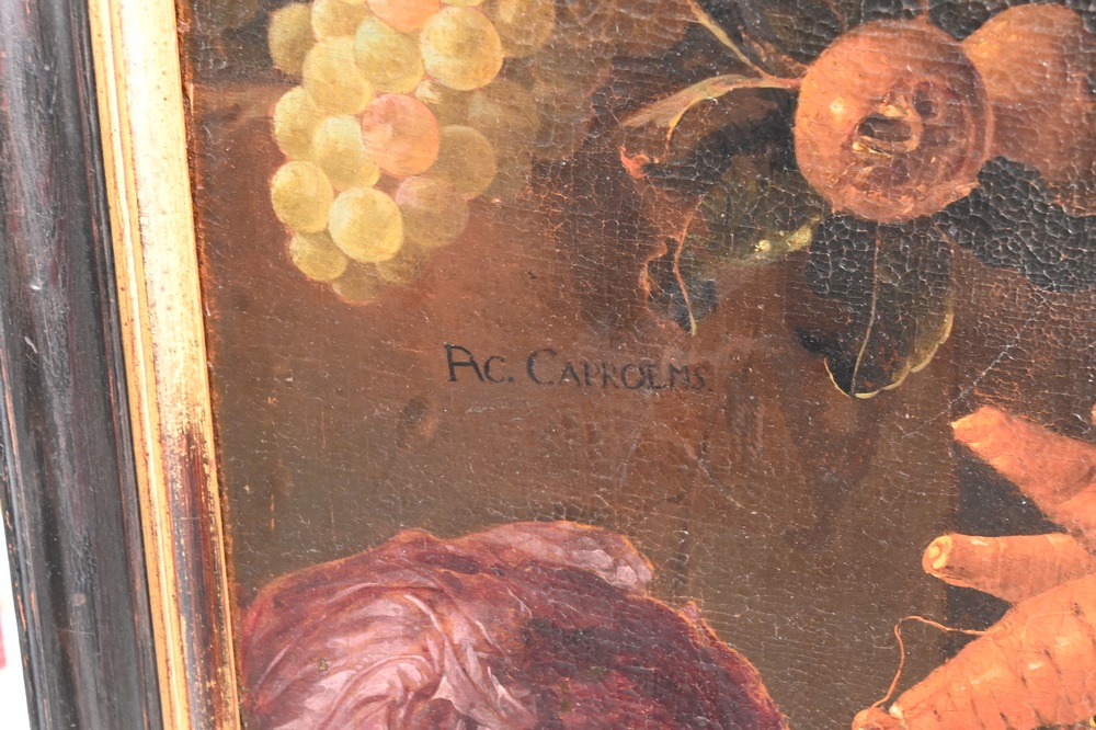 Lot 366: A.C. Caproems, still life of fruit and vegetables, 17th or 18th century, signed lower left “A.C. Caproems”, 35 1/4″ x 25 1/2″.