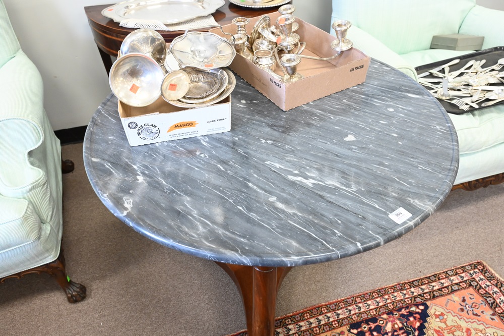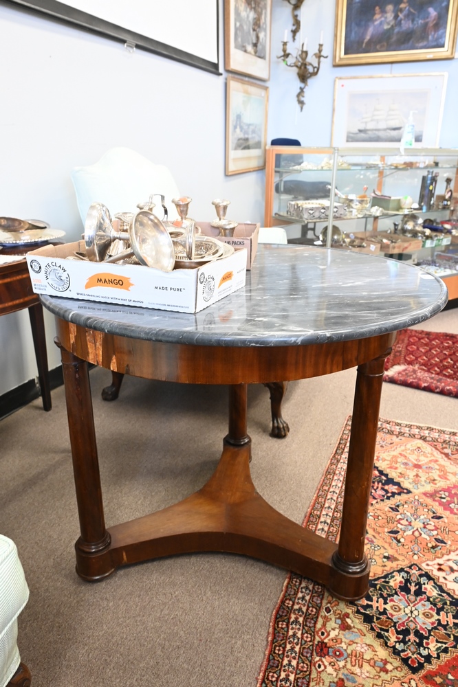 Lot 366: Empire Round Table, on three legs, having grey marble top, height 29 inches, diameter 35 inches, (chips on frieze and edges).