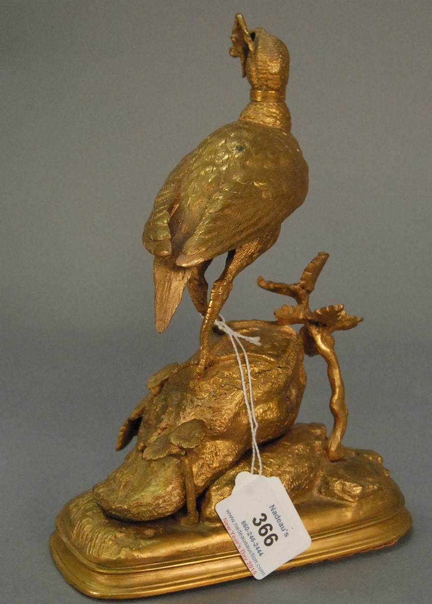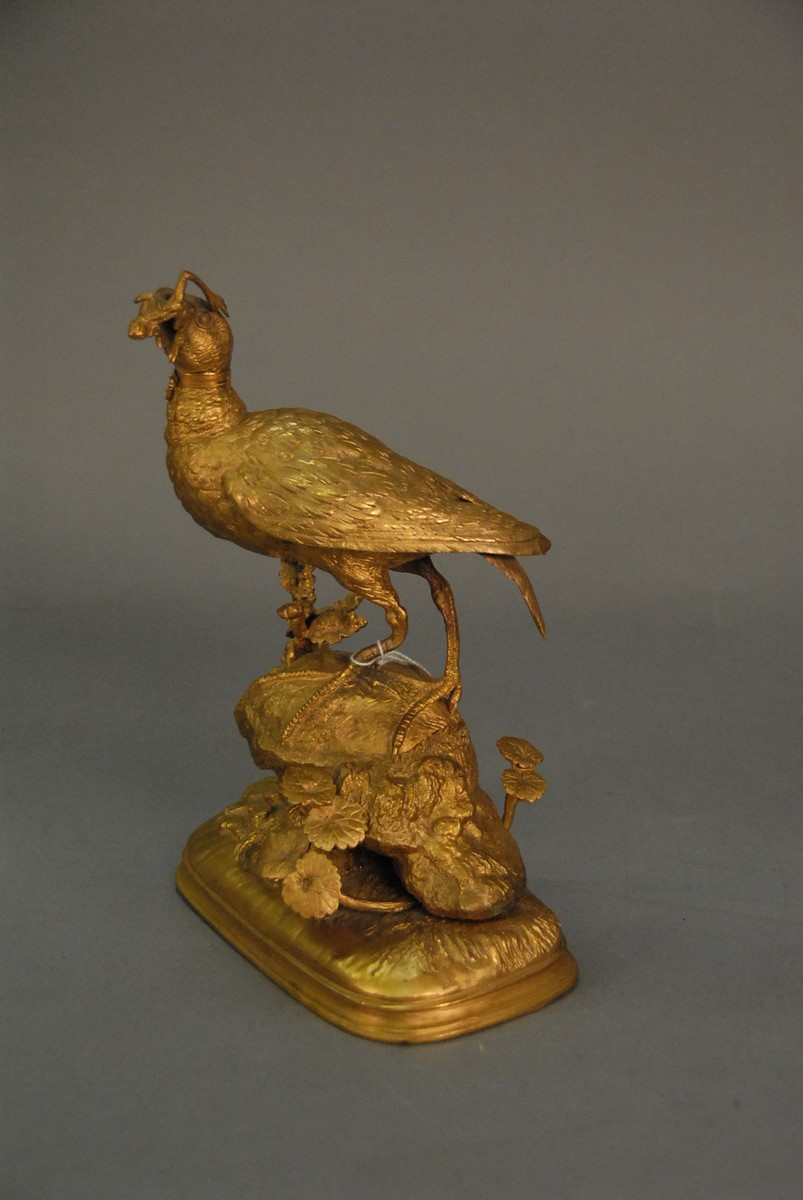 Lot 366: Ferdinand Pautrot 1832-1874 gilt bronze game bird catching a frog standing on a rock with plants, all on an oval stepped base signed F. Pautrot. ht. 9 1/2 in. Provenance: Property from a Private Collection Sold for the Benefit of th