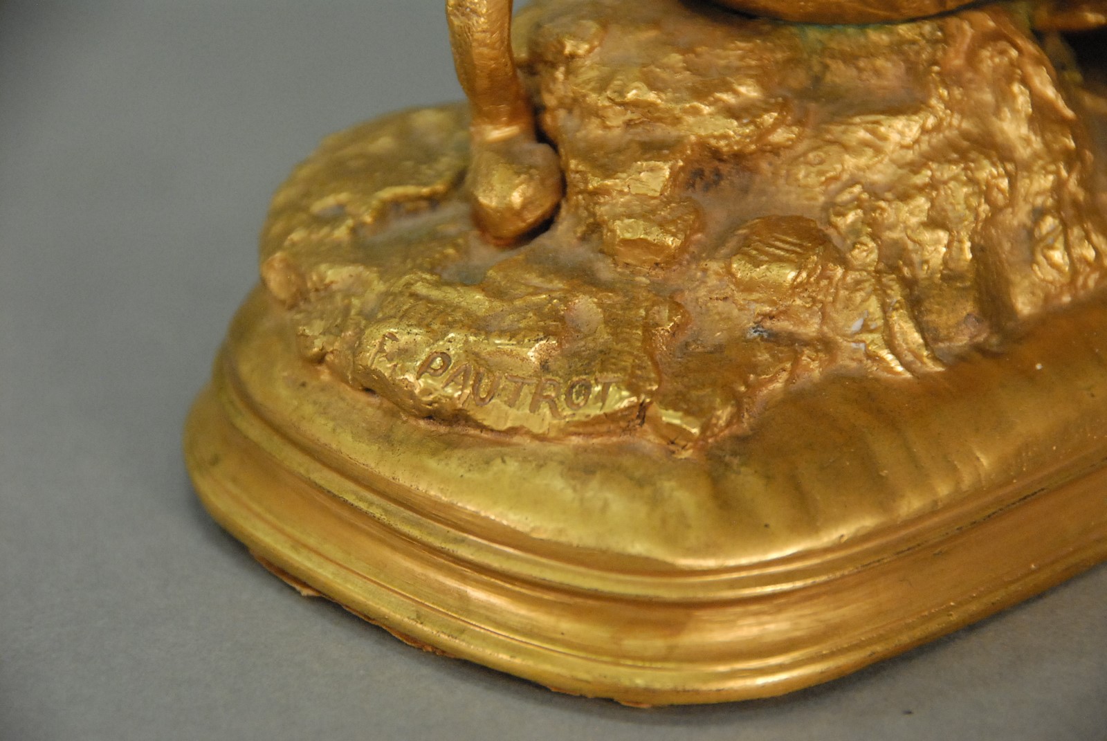 Ferdinand Pautrot 1832-1874 gilt bronze game bird catching a frog standing on a rock with plants, all on an oval stepped base signed F. Pautrot. ht. 9 1/2 in. Provenance: Property from a Private Collection Sold for the Benefit of the Virginia Historical Society.
