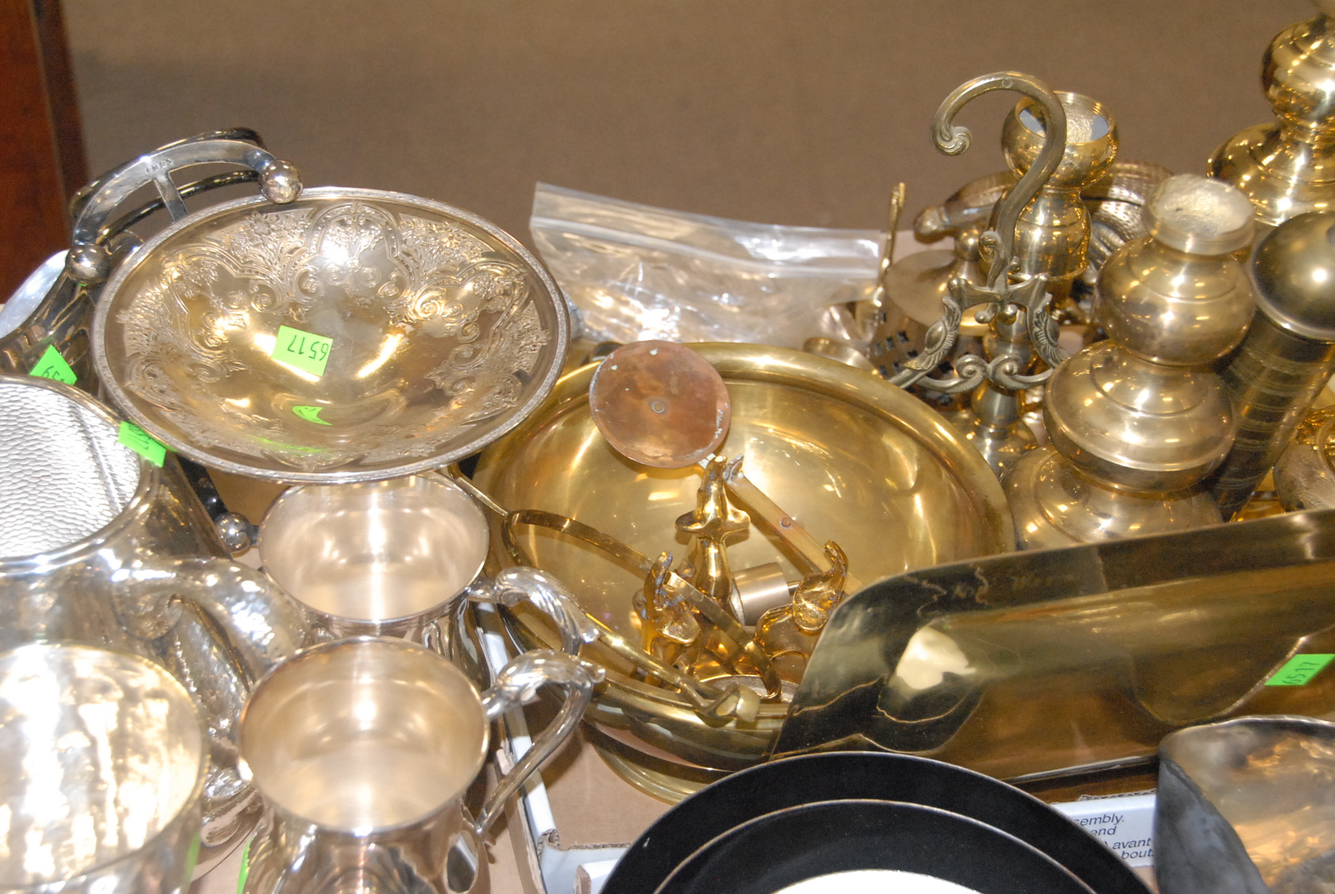 Lot 366: Four boxes of silverplate and copper serving pieces, candlesticks, figures, nut cracker, pitchers, bowls, pewter bank, etc.