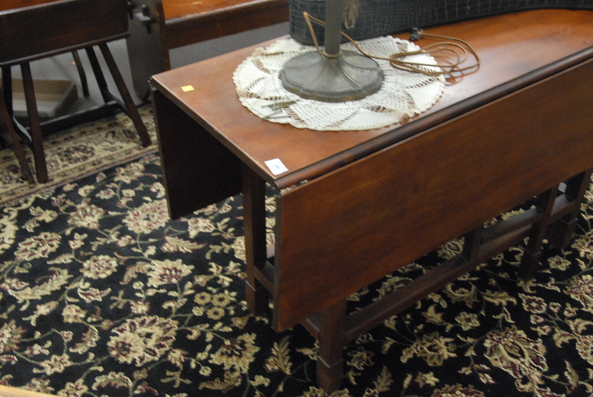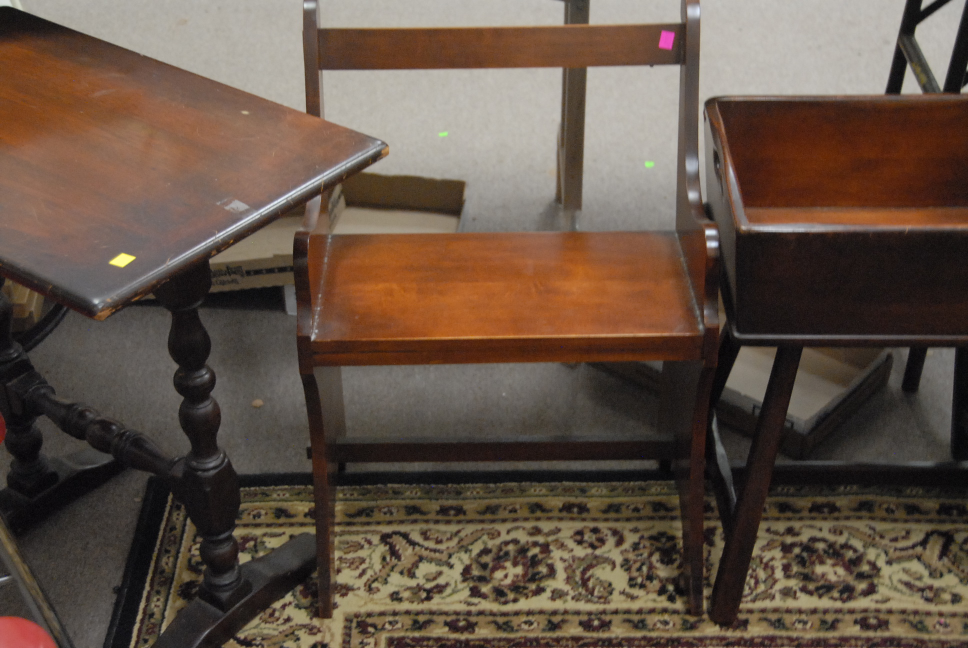 Four piece maple lot including drop leaf table, chair, wood basket, and table.