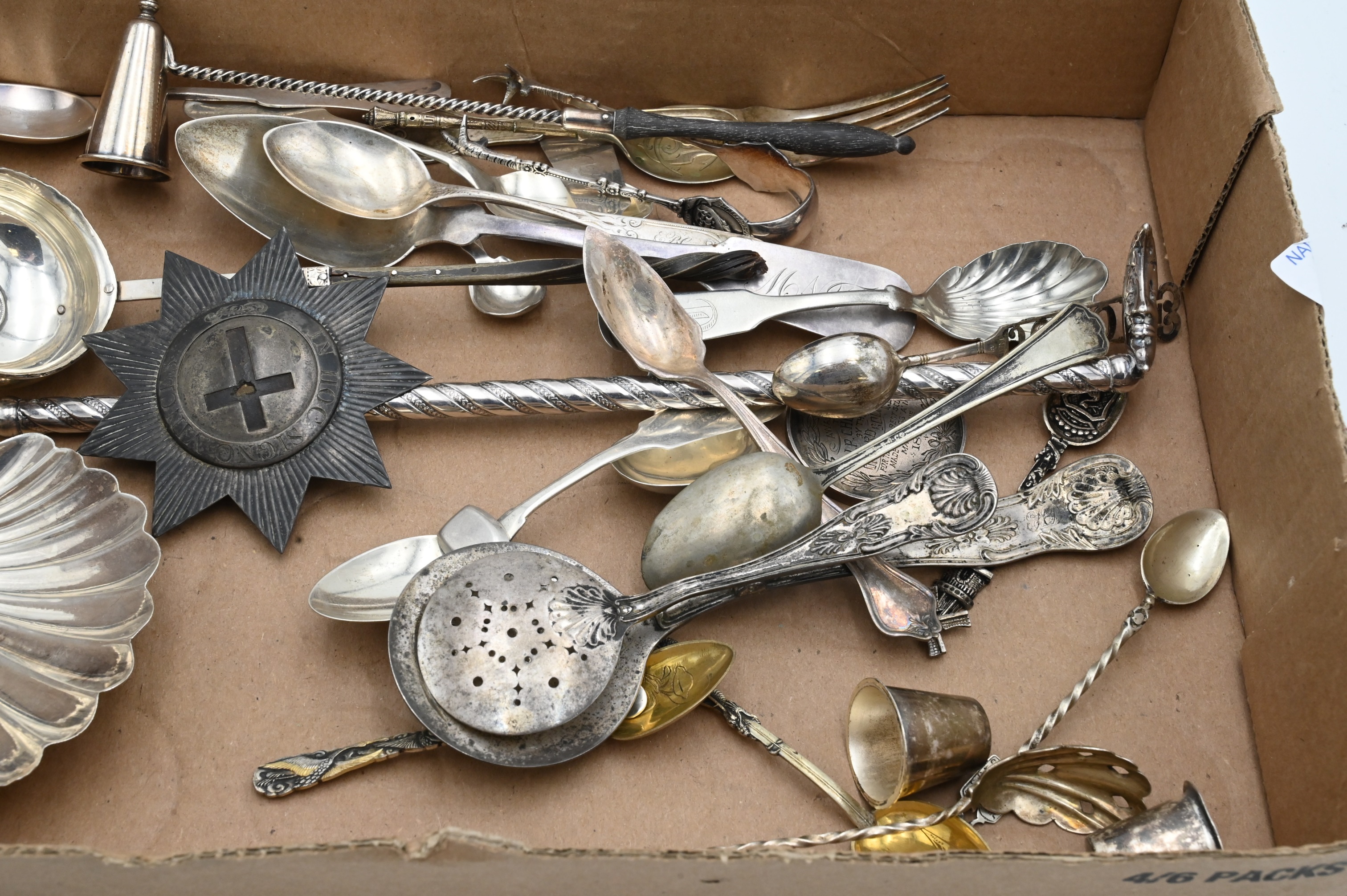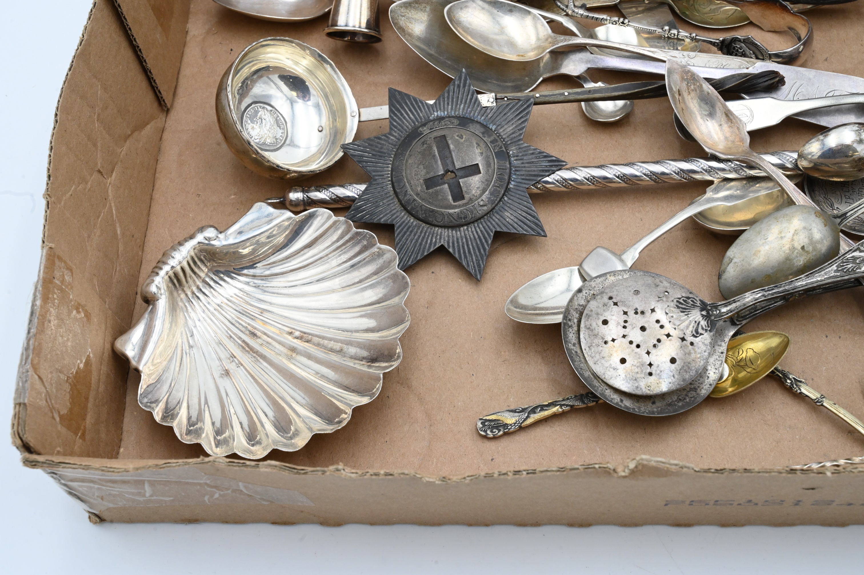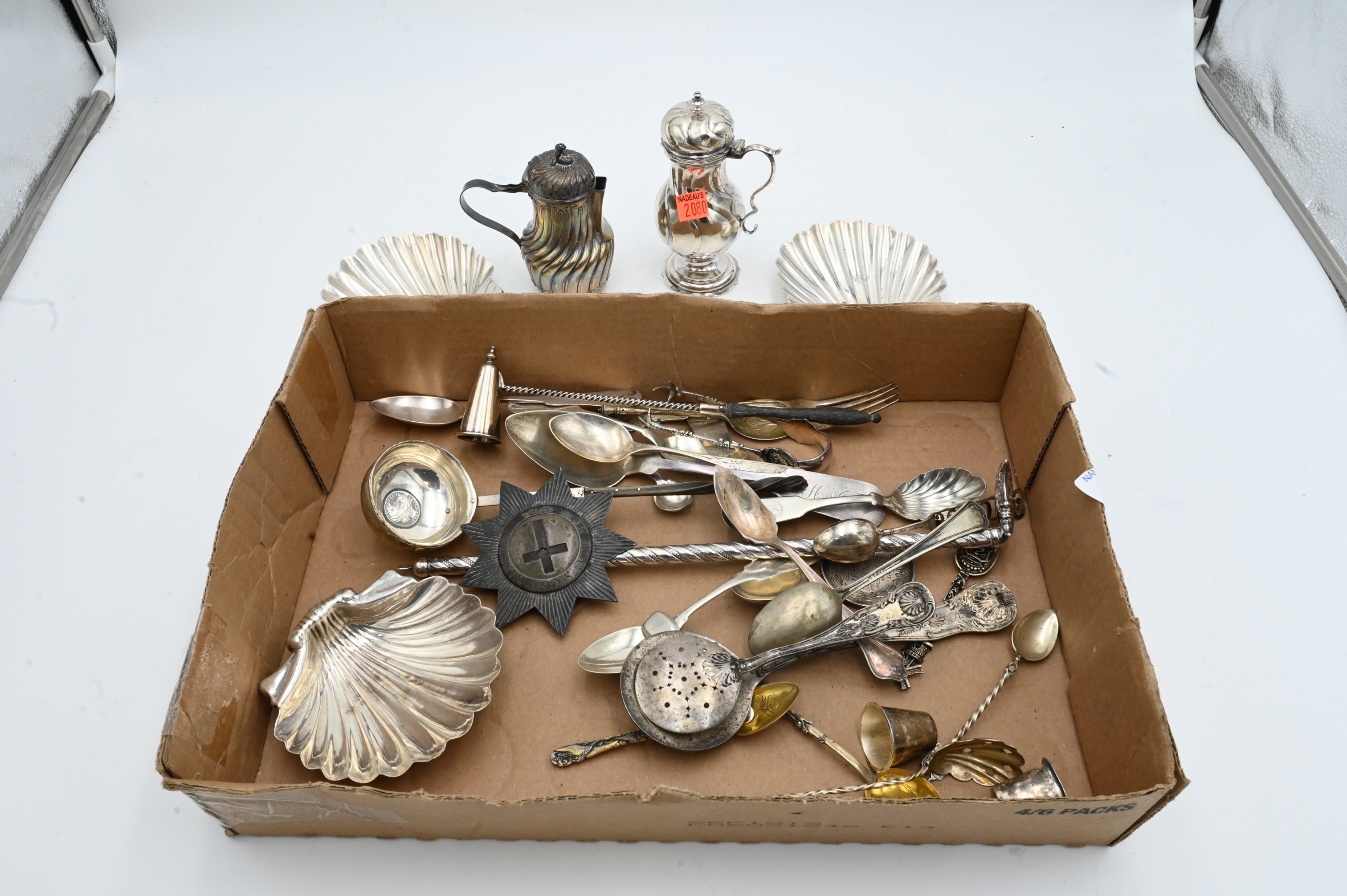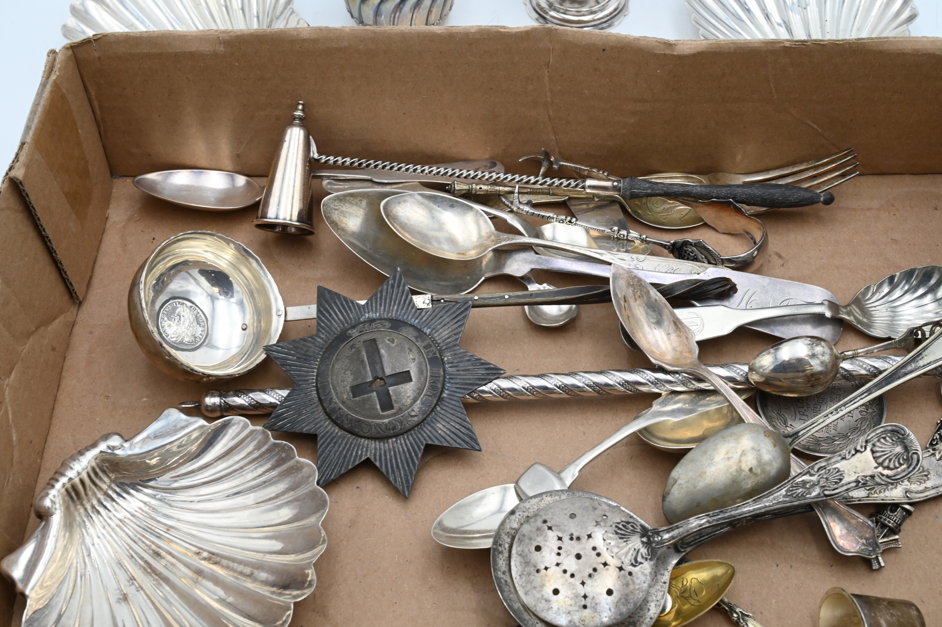 Group of Mostly Silver, to include shell form dishes, spoons, candle snuffer, and ladle with coin, etc., 40.4 t.oz.