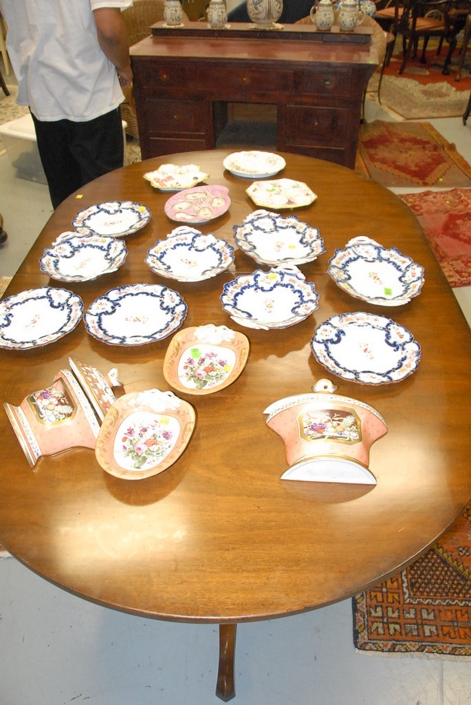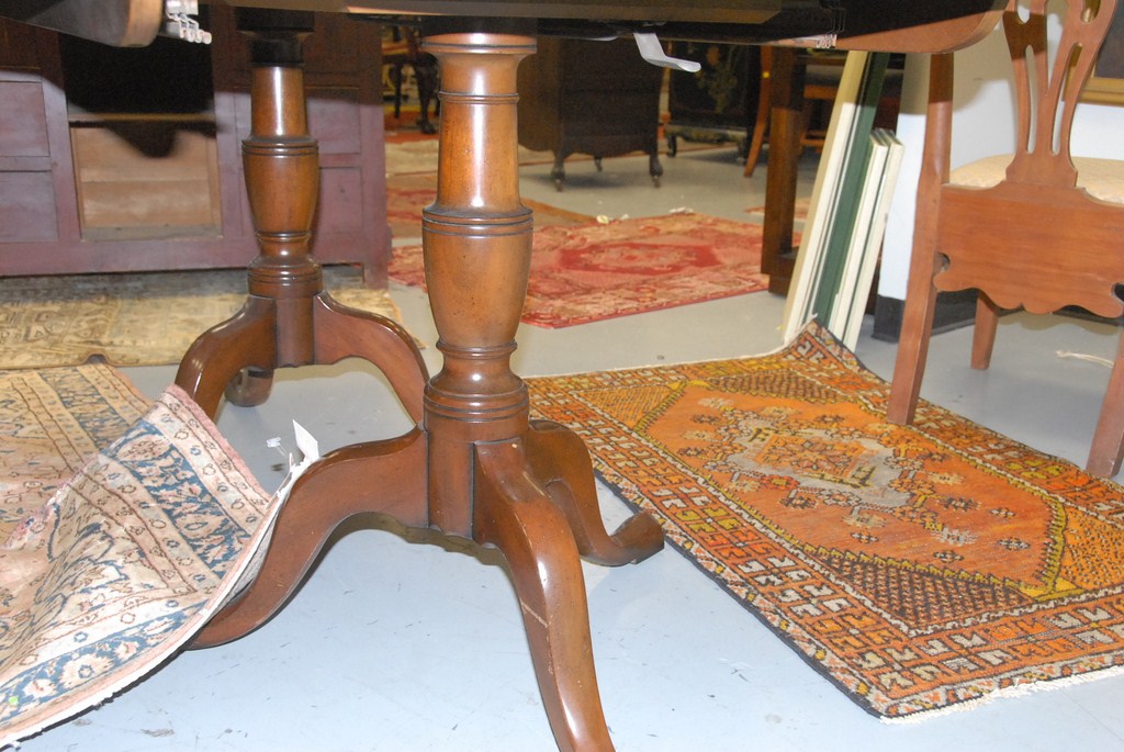 Kittinger mahogany double pedestal oval dining table, ht. 30in. top: 44 x 68 plus two 18in. leaves and custom pads.