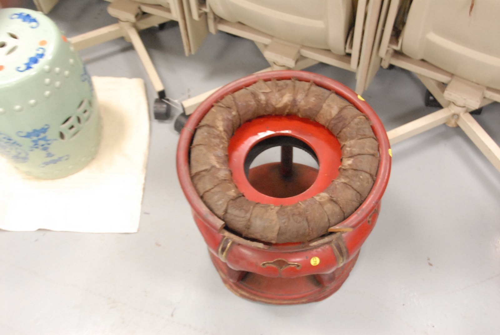 Large Sino-Tibetan gong/drum basin with red lacquered stand and striker, loose parts to stand.