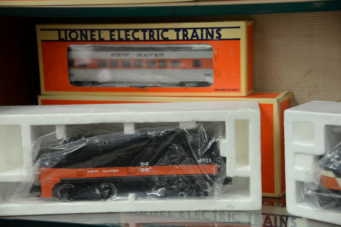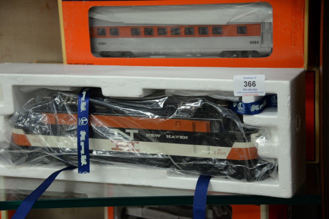 Lot 366: Lionel New Haven train set to include two engines, 2460 six-wheel and A Alco diesel engine, along with seven New Haven Visit Dome …