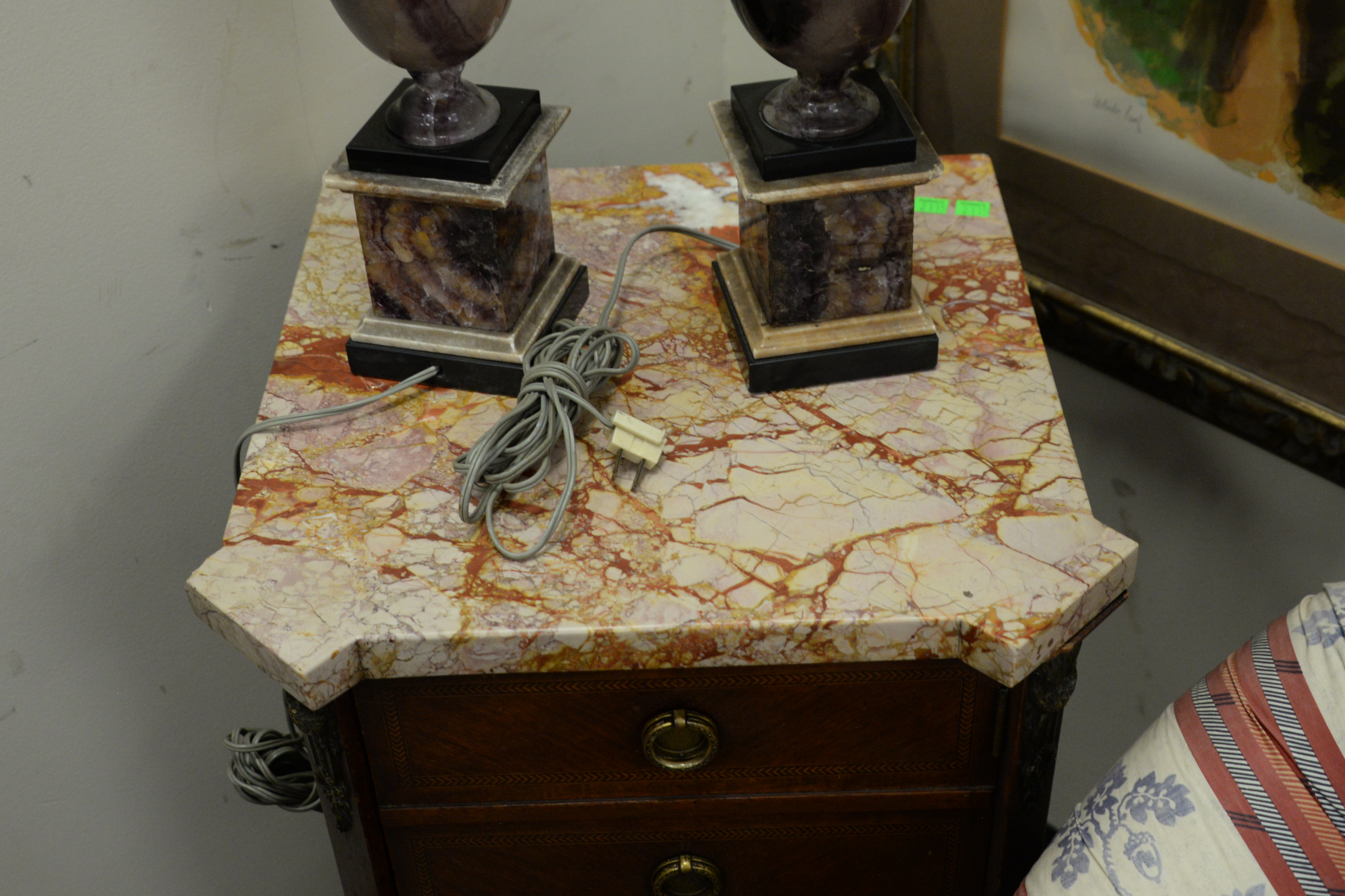 Louis XV Style Marble Top Inlaid Chest, along with three drawer marble top side table, each with cabriole legs, height 37 1/4 inches, top 23×49″