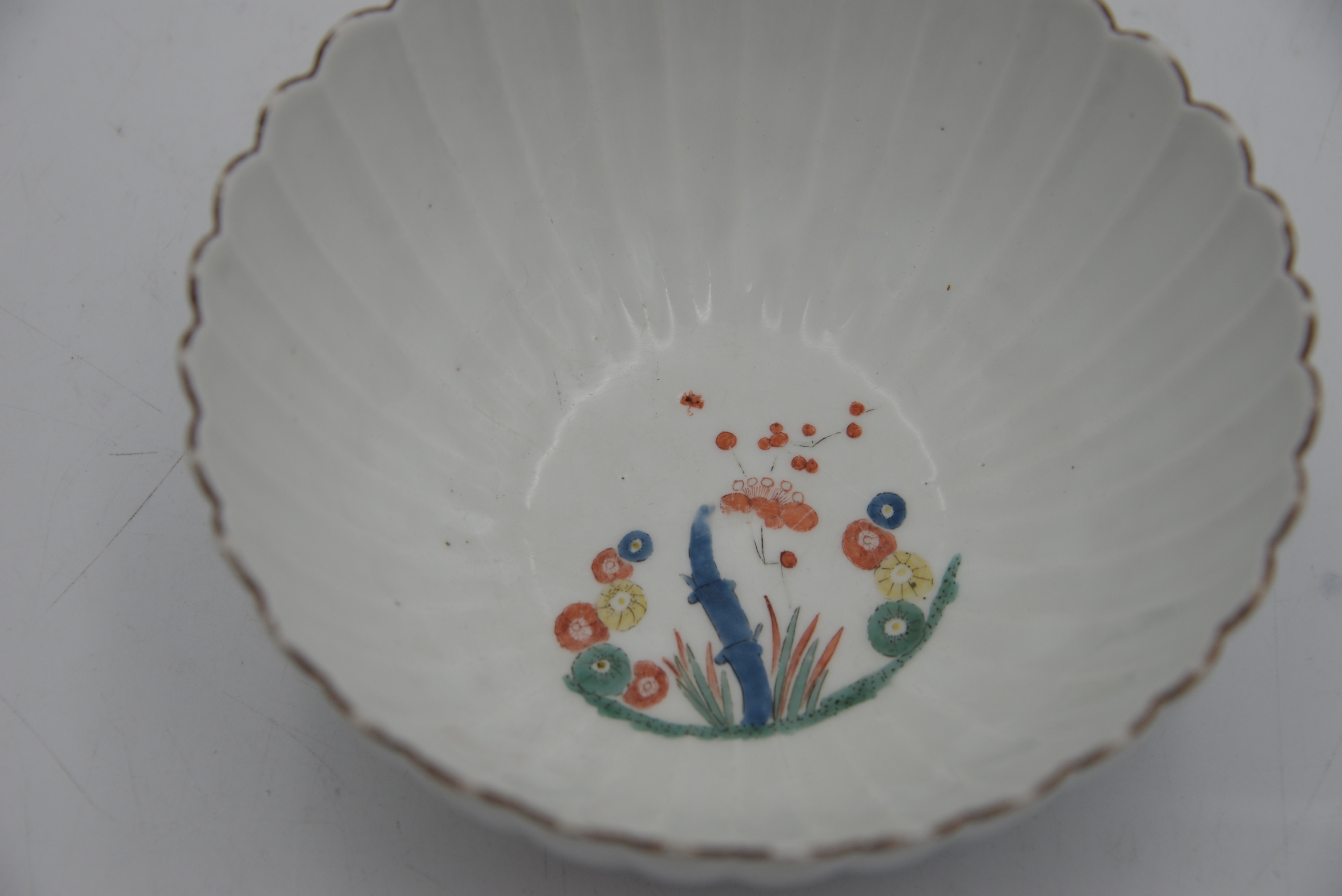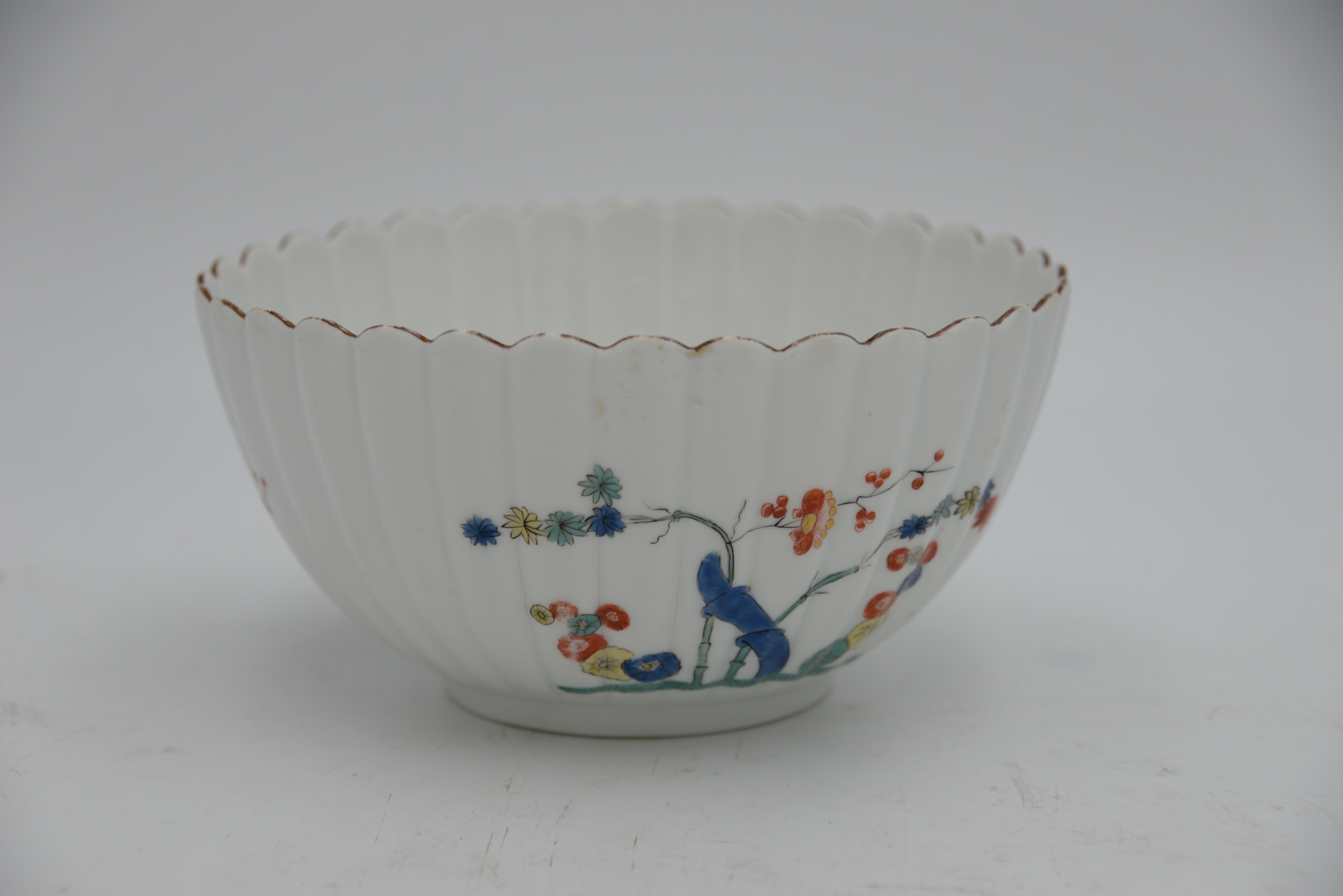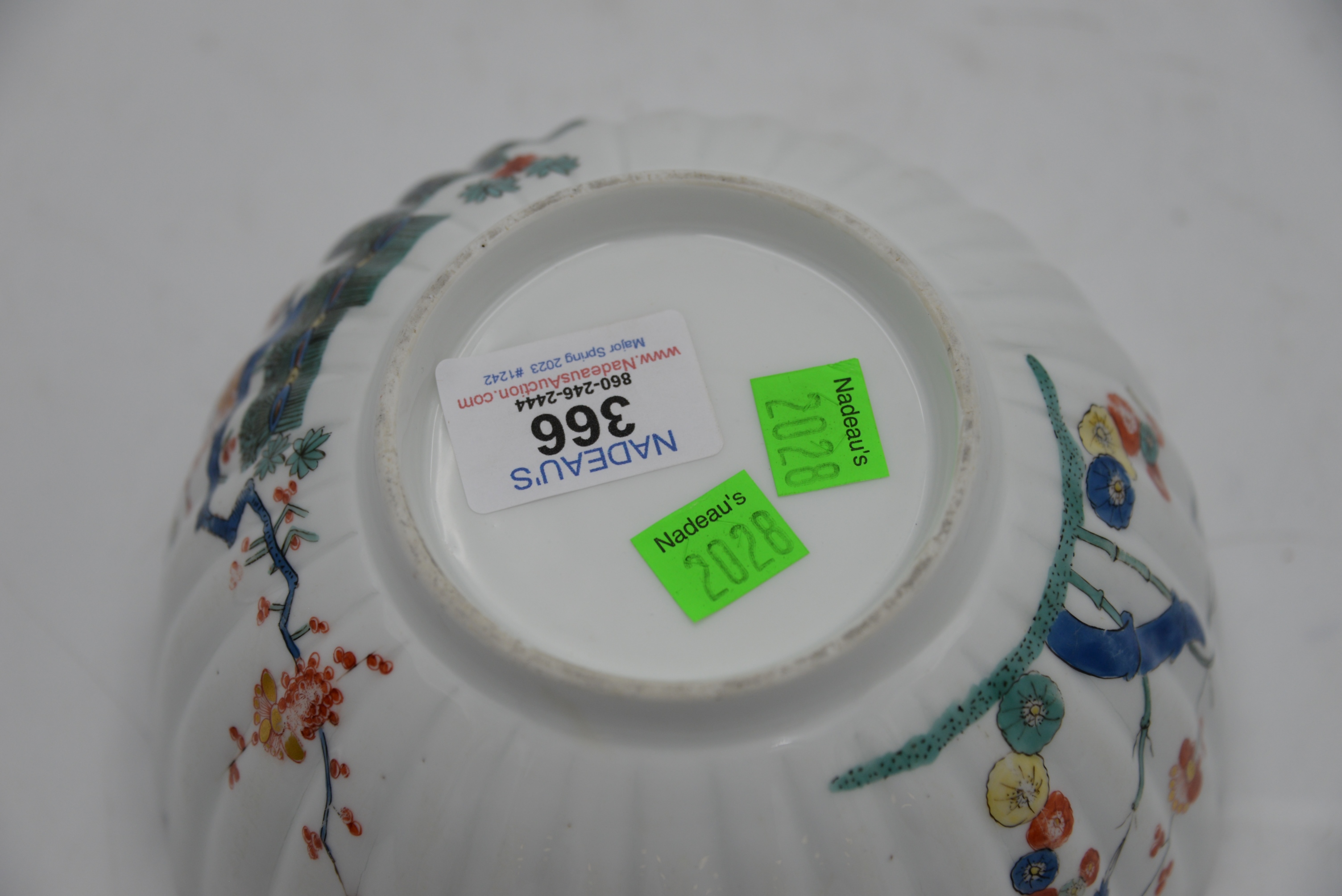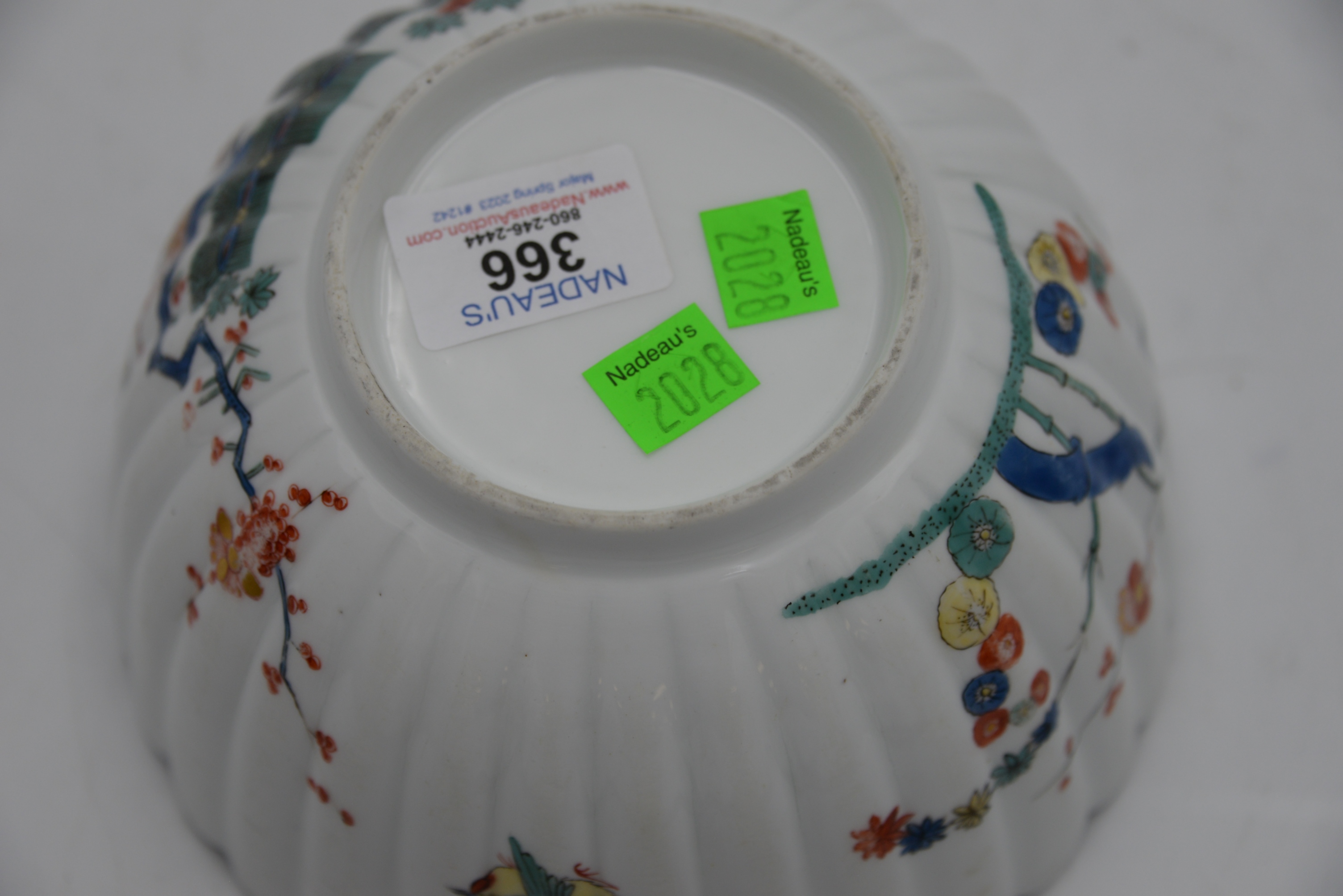 Meissen Kakiemon Decorated Bowl, 18th century, “Three Friends of Winter,” interior with flowering branches, blue crossed swords mark on bottom, painted in kakiemon palette, having scalloped edges, diameter 7 inches. Provenance, Parke Bernet Galleries, May 1970 Sale, item #276, Julius H Jacobson II a Fifth Avenue Estate.
