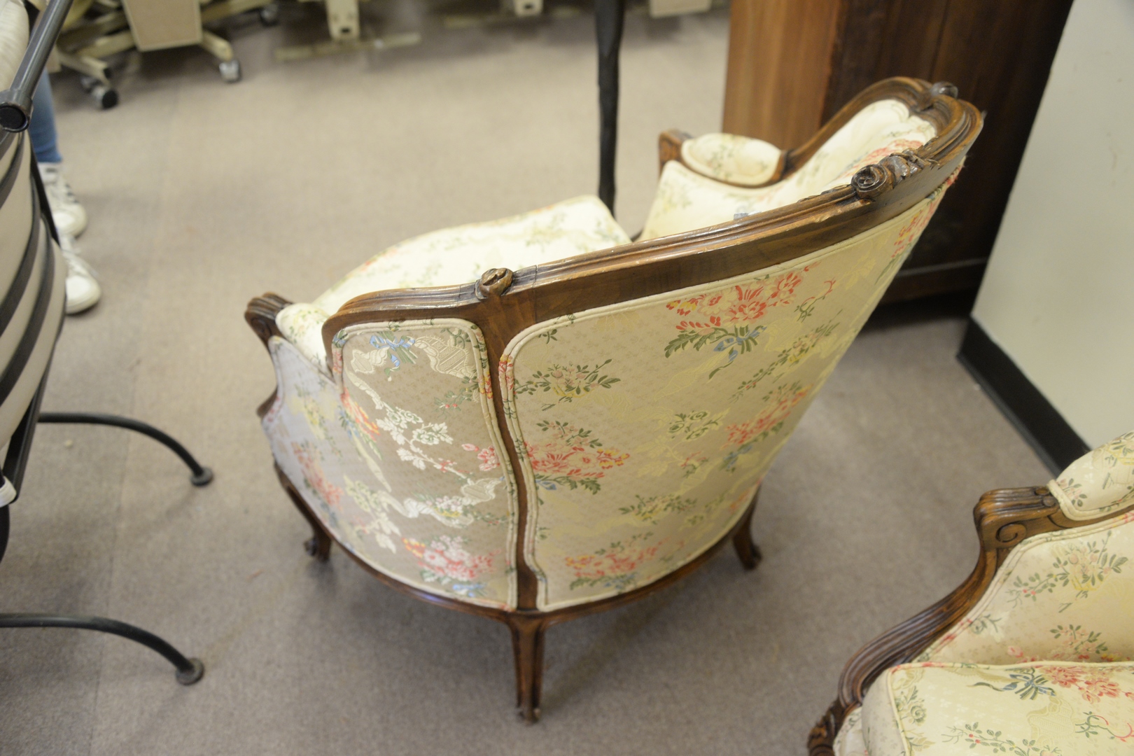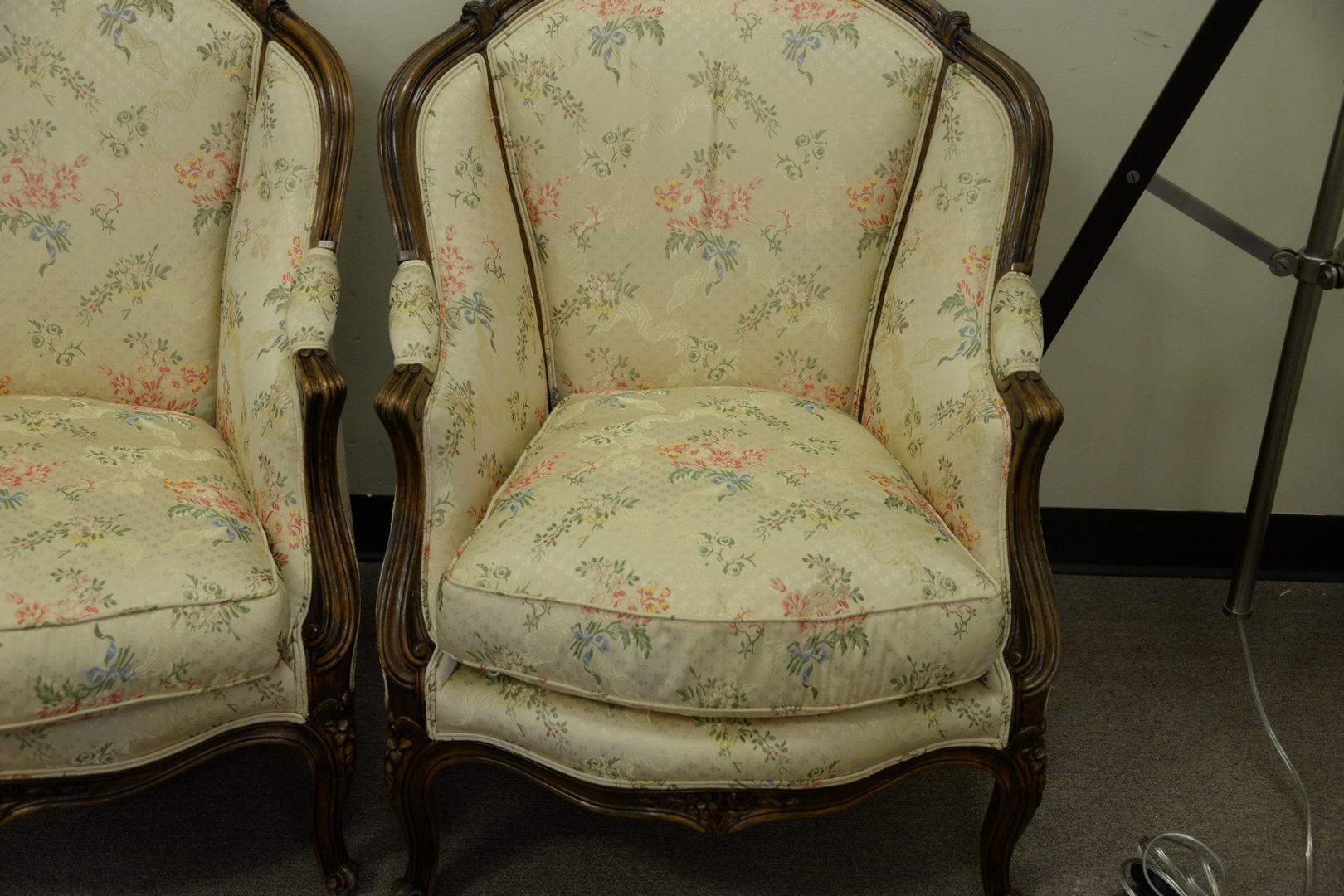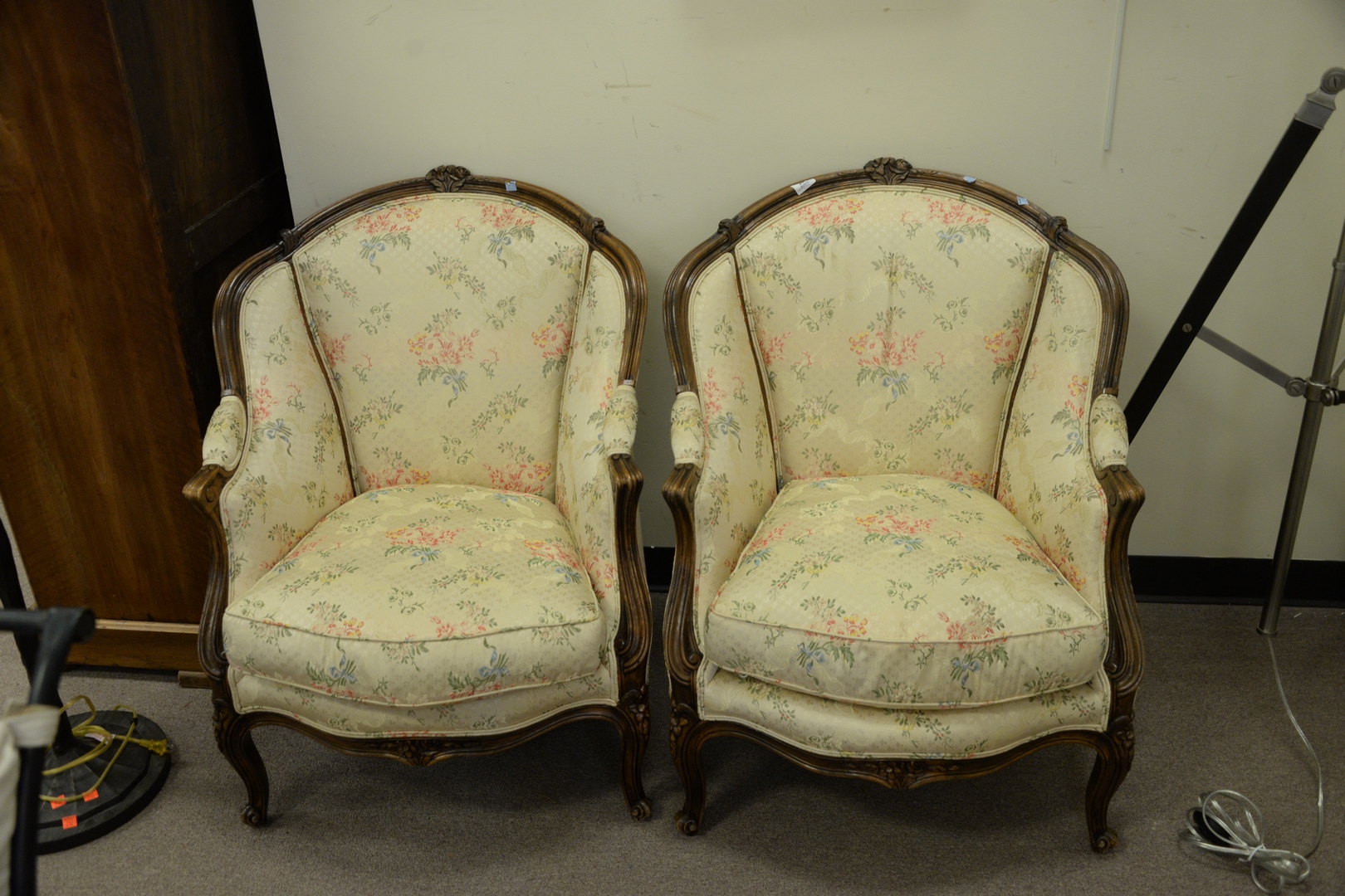 Pair of Louis XV Style Fauteuils, having custom silk upholstery.