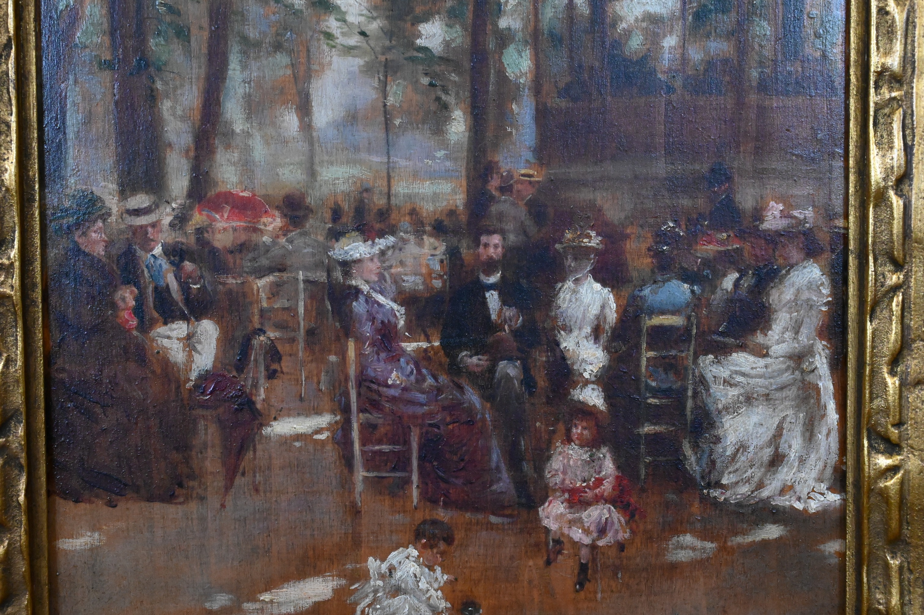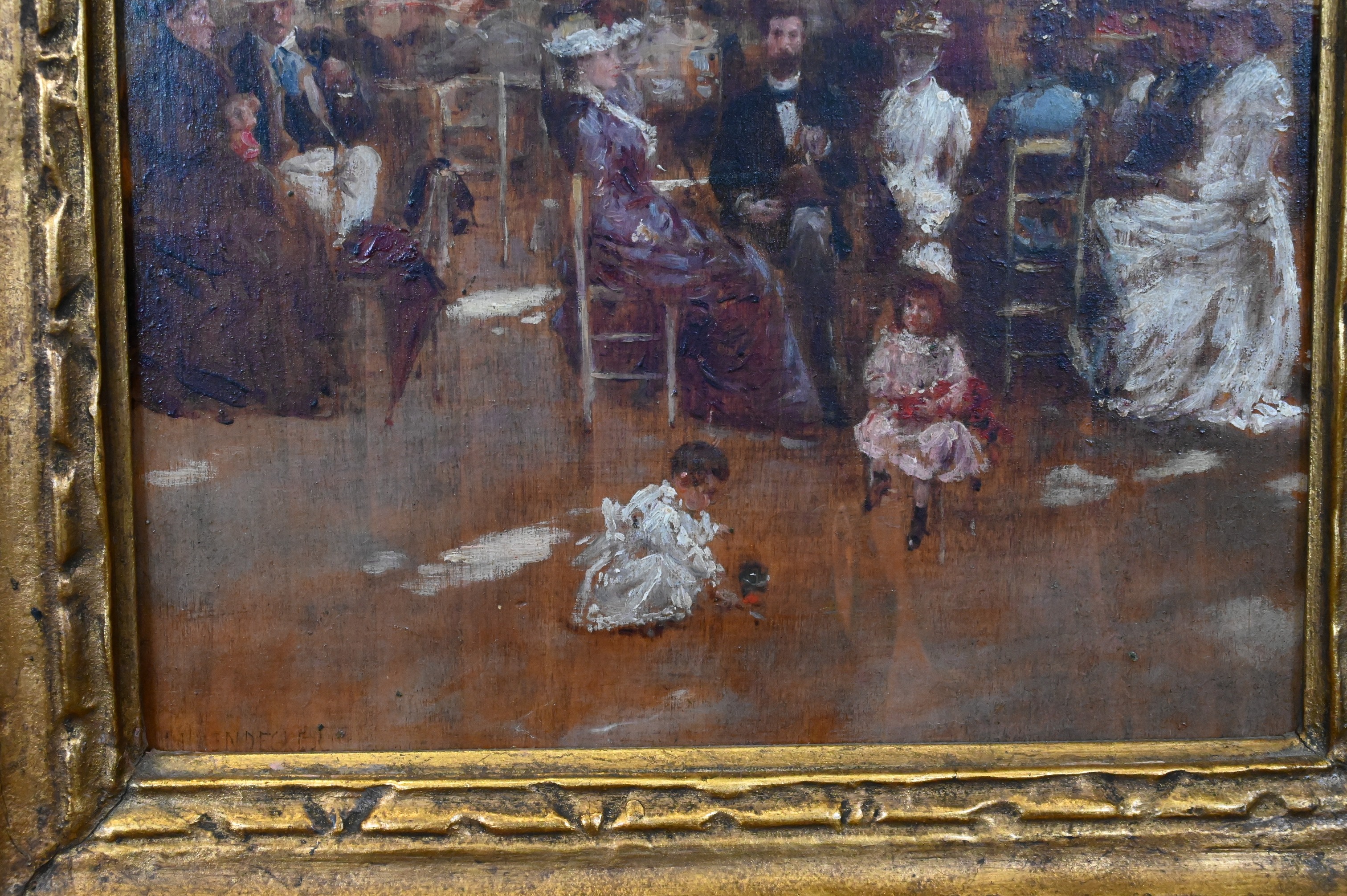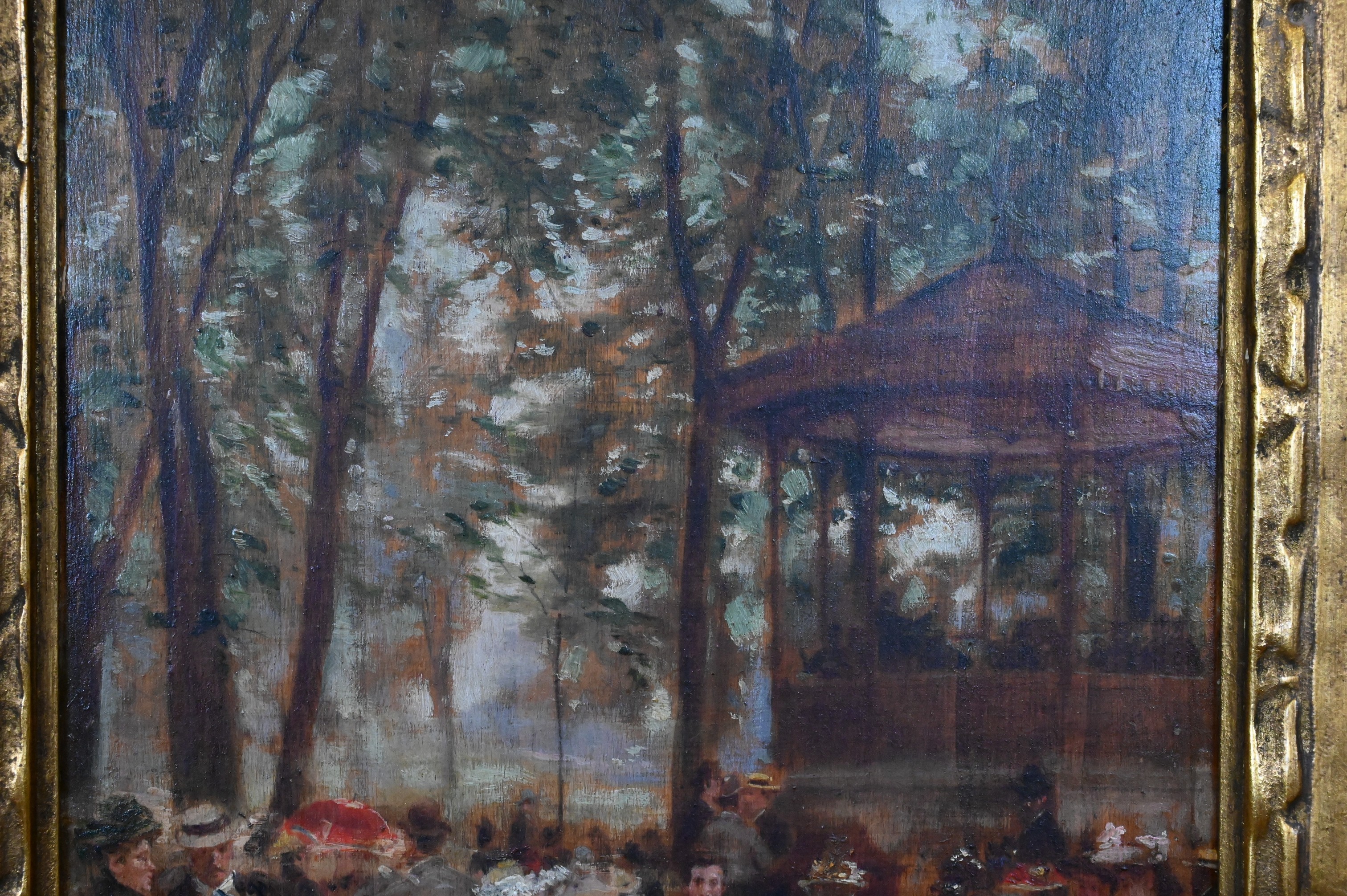 depicting a lively park setting with elegantly dressed women and children gathered near a pavilion beneath dappled afternoon light; executed with loose, fluid brushwork and a harmonious palette of soft greens, blues, and creams, the scene reflects the French Impressionist influence on Leyendecker’s later work and his sensitivity to light and atmosphere