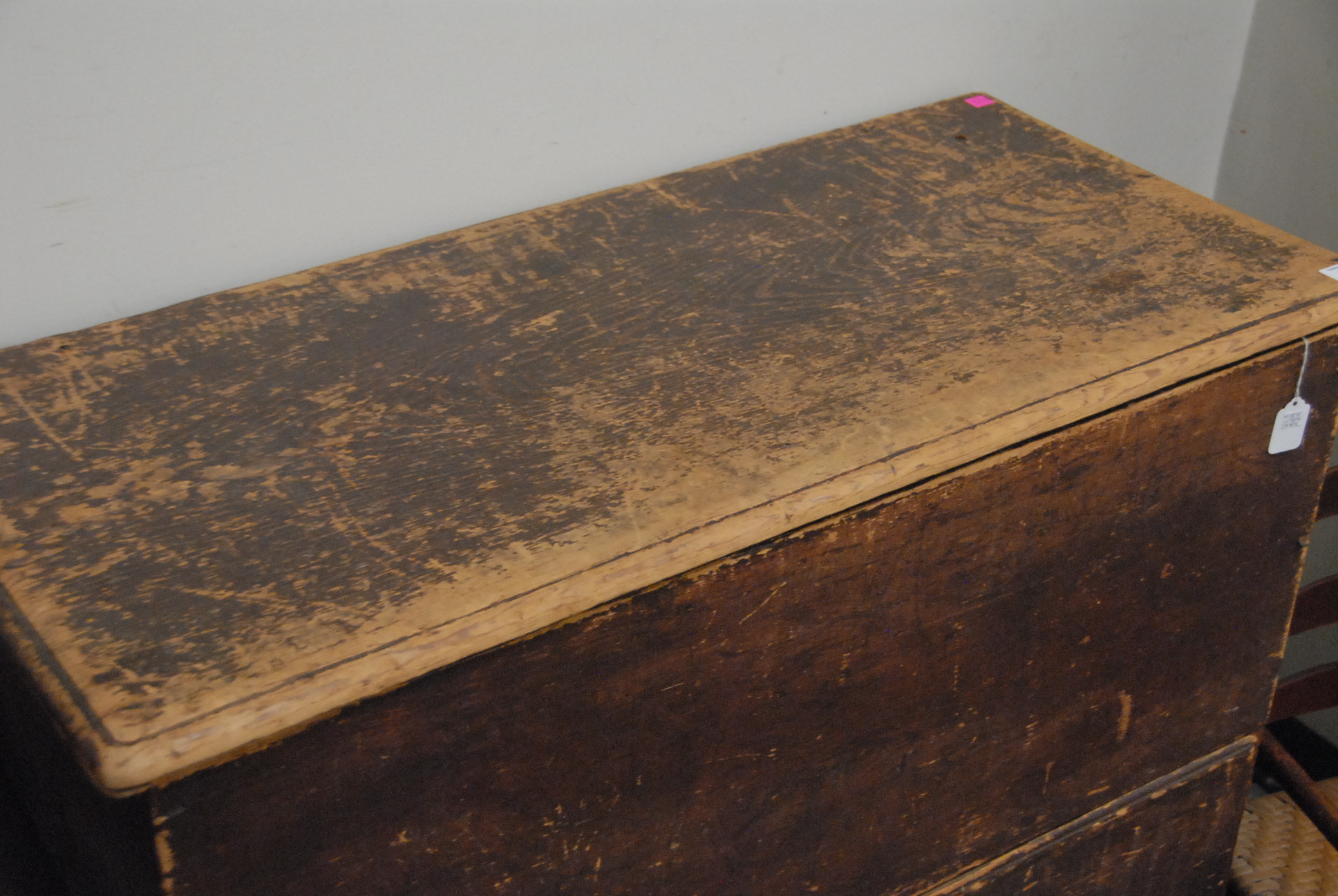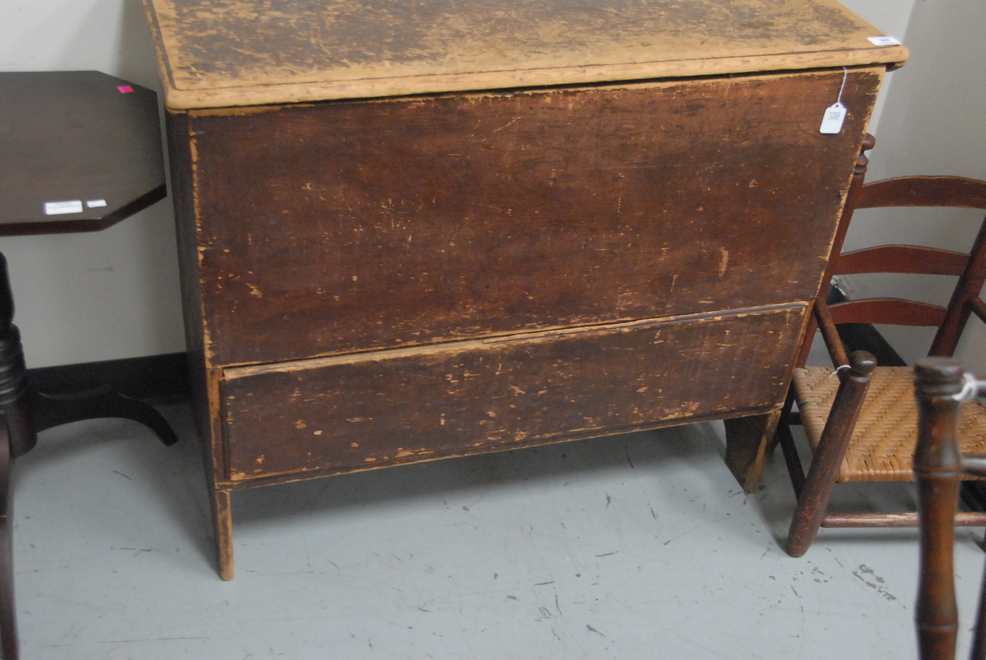 Lot 366: Primitive blanket chest with lift top over one drawer on boot sack ends. ht. 32 1/2 in. wd. 35 1/2 in.