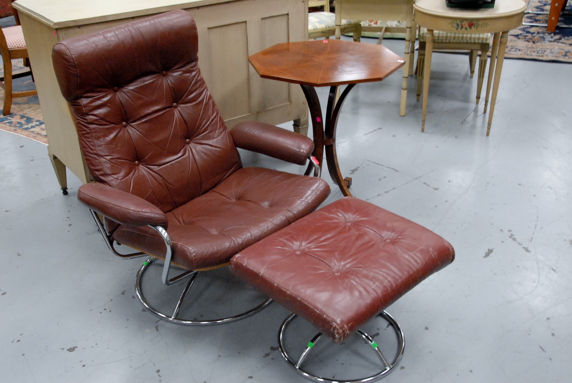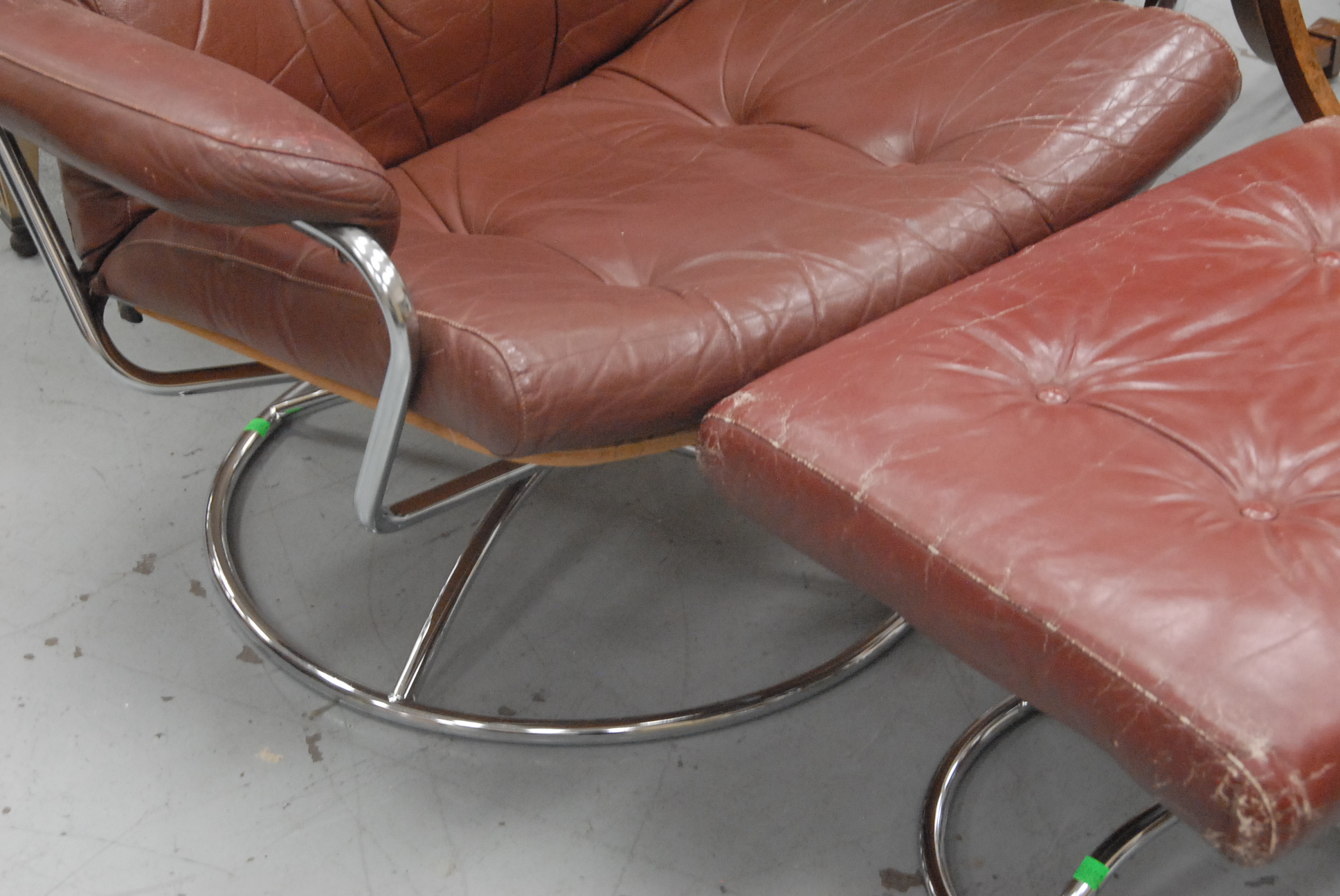 Scandinavian leather and chrome lounge chair with matching ottoman.