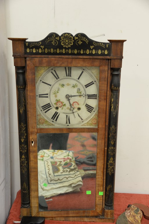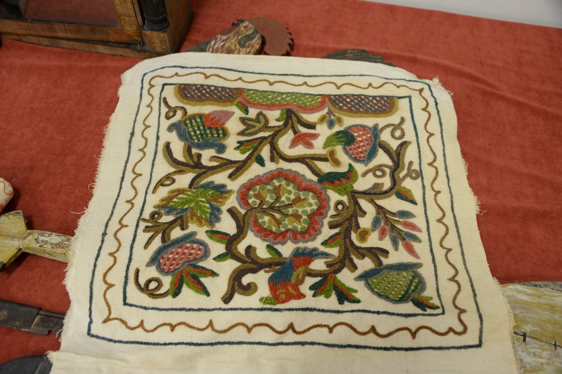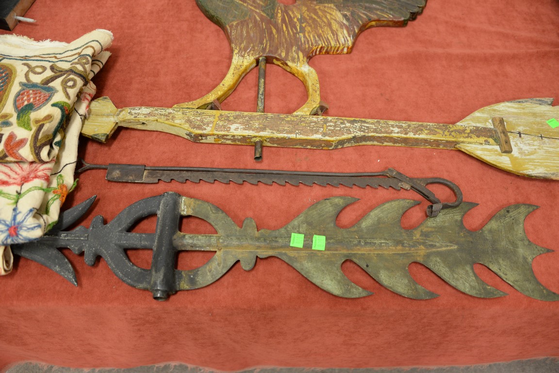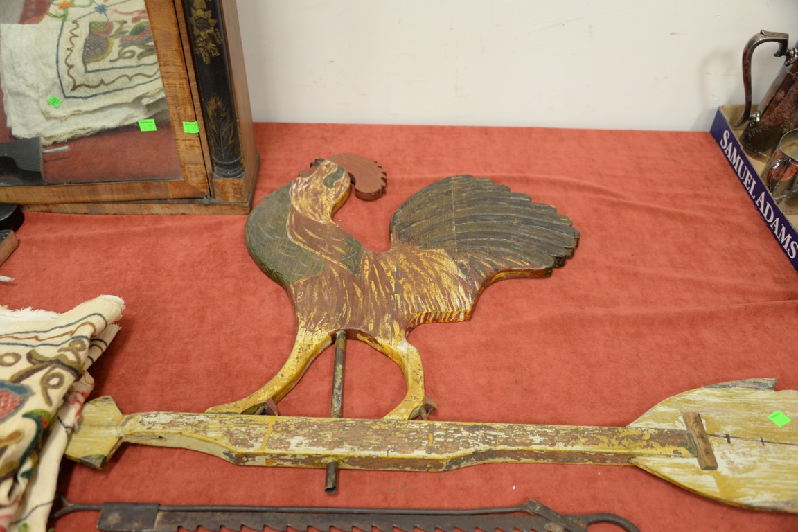 Lot 366: Six piece lot to include wood rooster weathervane, iron candle jack, vane directionals, Federal shelf clock, and two cruelwork cloths.