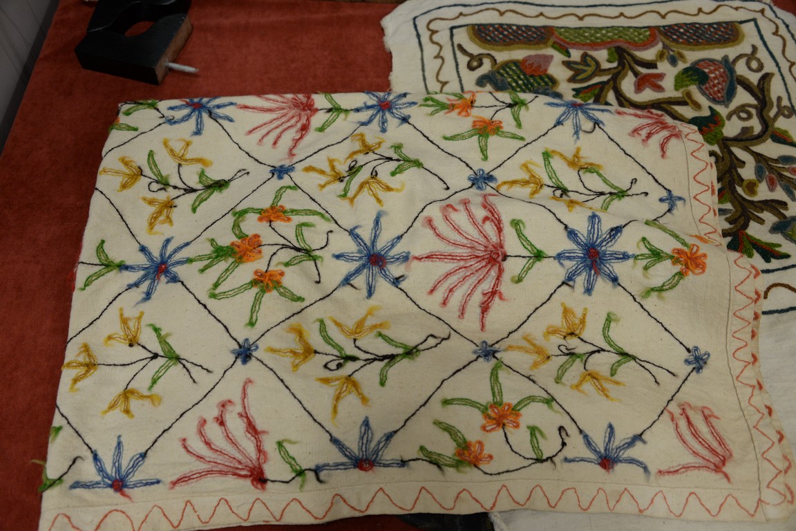 Six piece lot to include wood rooster weathervane, iron candle jack, vane directionals, Federal shelf clock, and two cruelwork cloths.