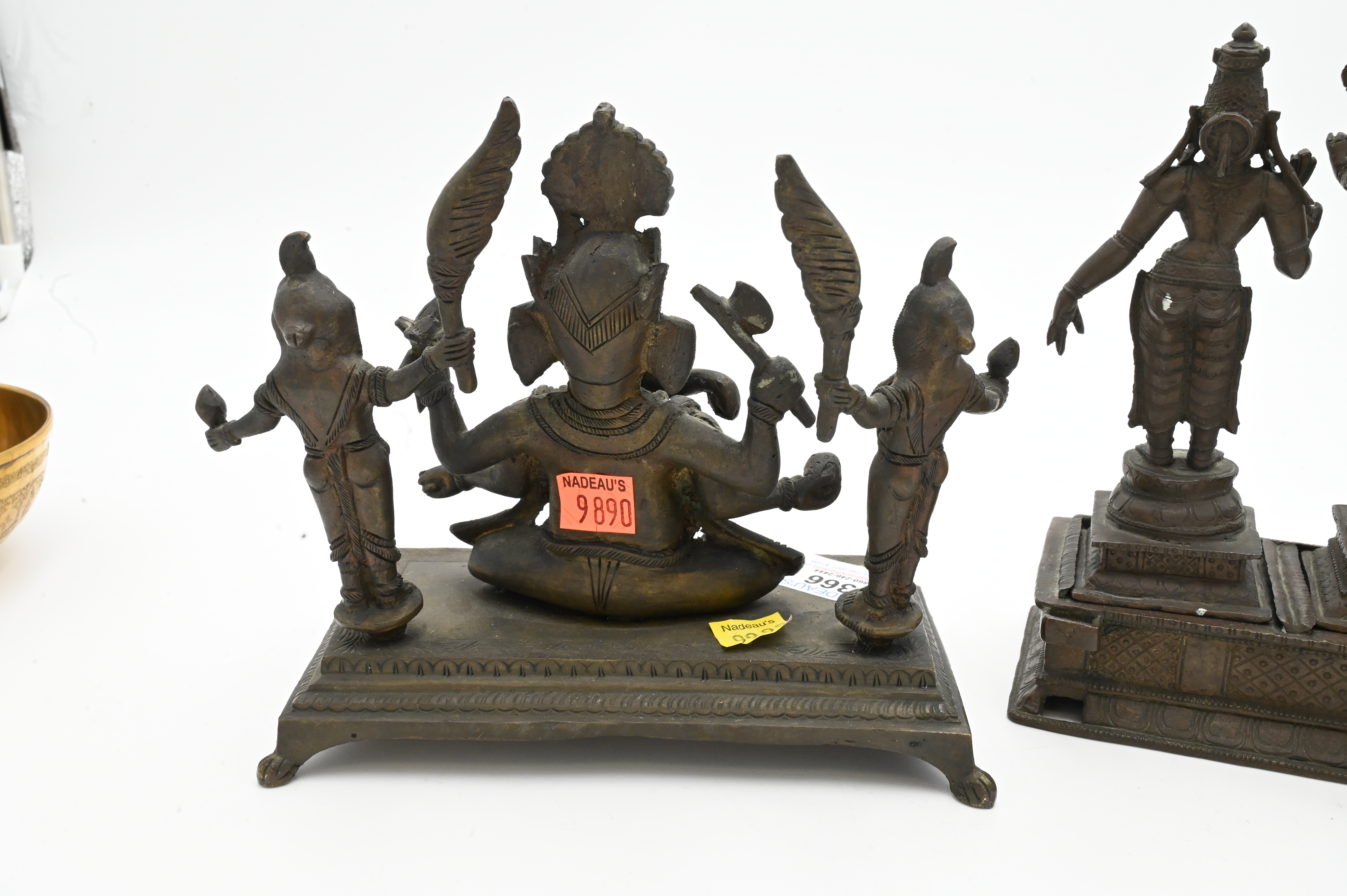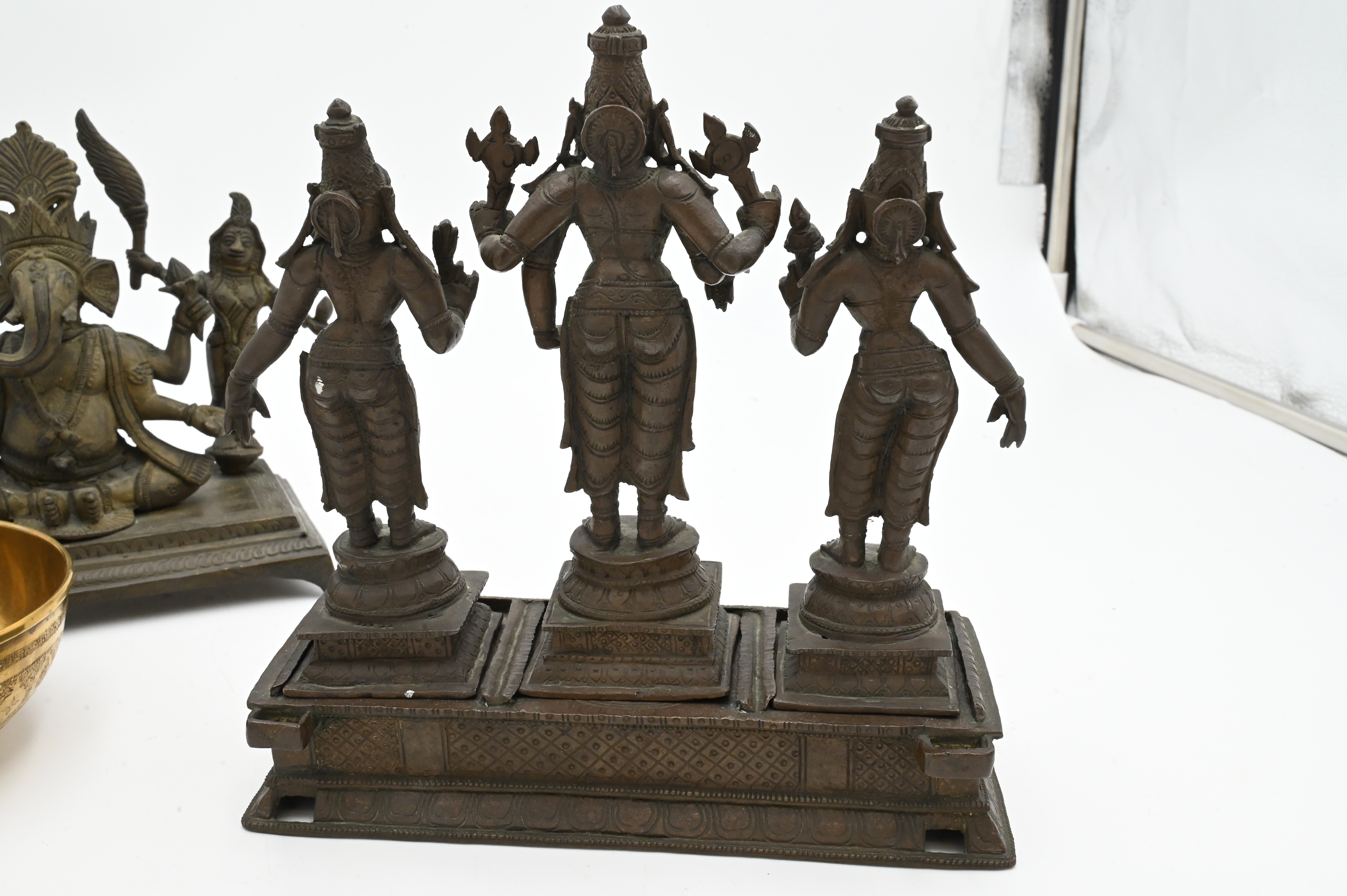 Three Piece Group of Middle Eastern Items, to include two triple bronze deities, figures standing on platform, along with a brass bowl, tallest 8 inches.