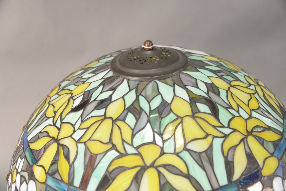 Lot 366: Tiffany Style Table Lamp, having apple blossom leaded glass shade, height 24 inches, shade diameter 21 inches.