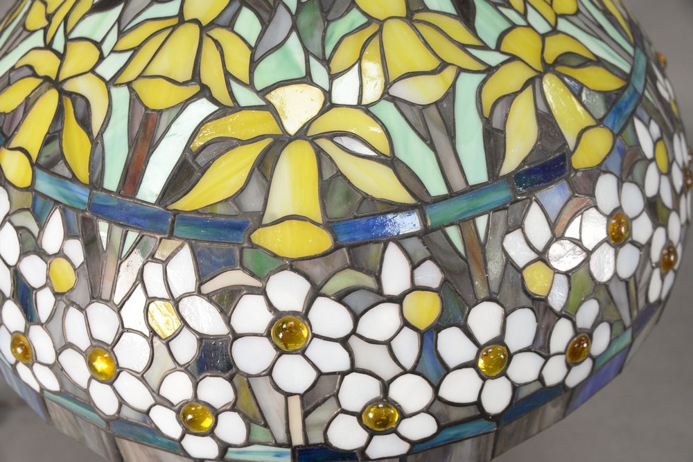 Tiffany Style Table Lamp, having apple blossom leaded glass shade, height 24 inches, shade diameter 21 inches.