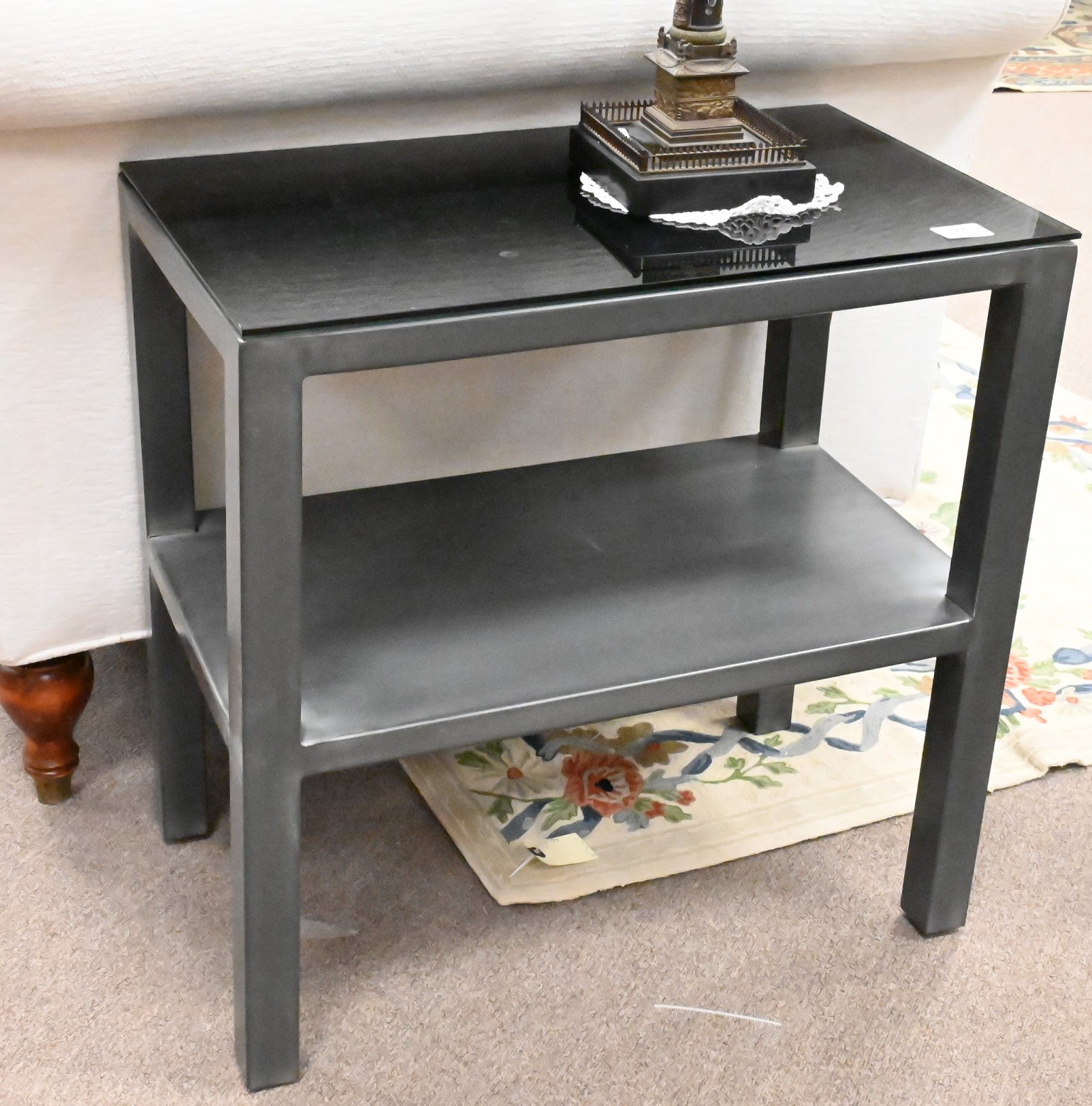 to include oxleg side table having black glass top set on metal legs, other having glass top over cross box chrome base