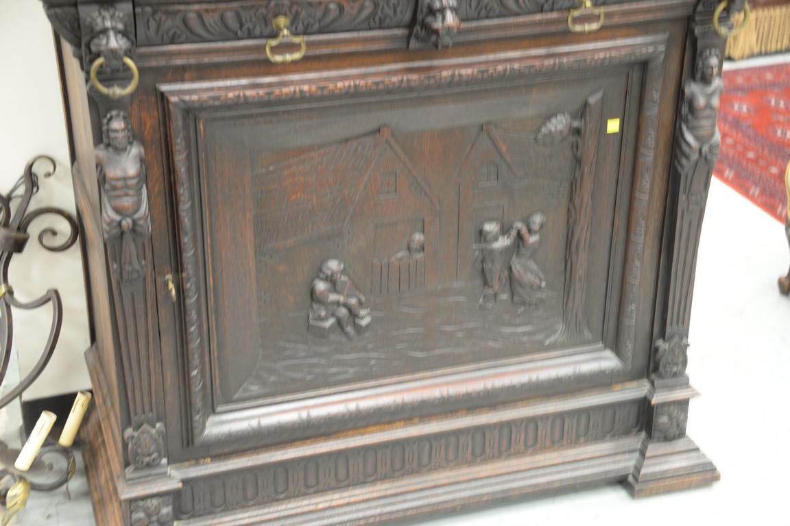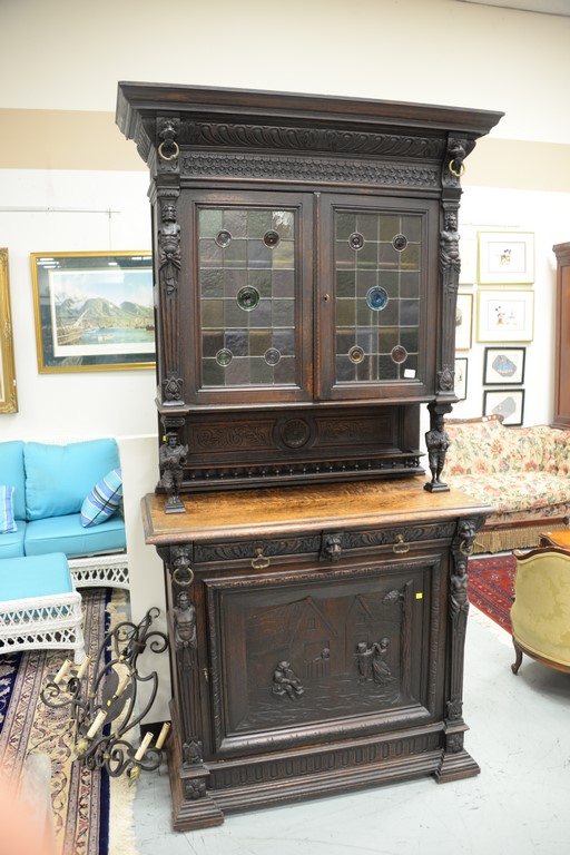 Continental oak cabinet in two parts, upper section with two leaded doors all supported by two 3D carved figures on base with two drawers and one door, probably German. ht. 91 in. wd. 45 1/2 in. dp. 20 in.