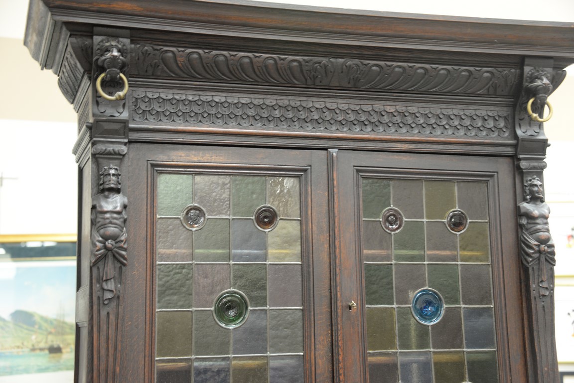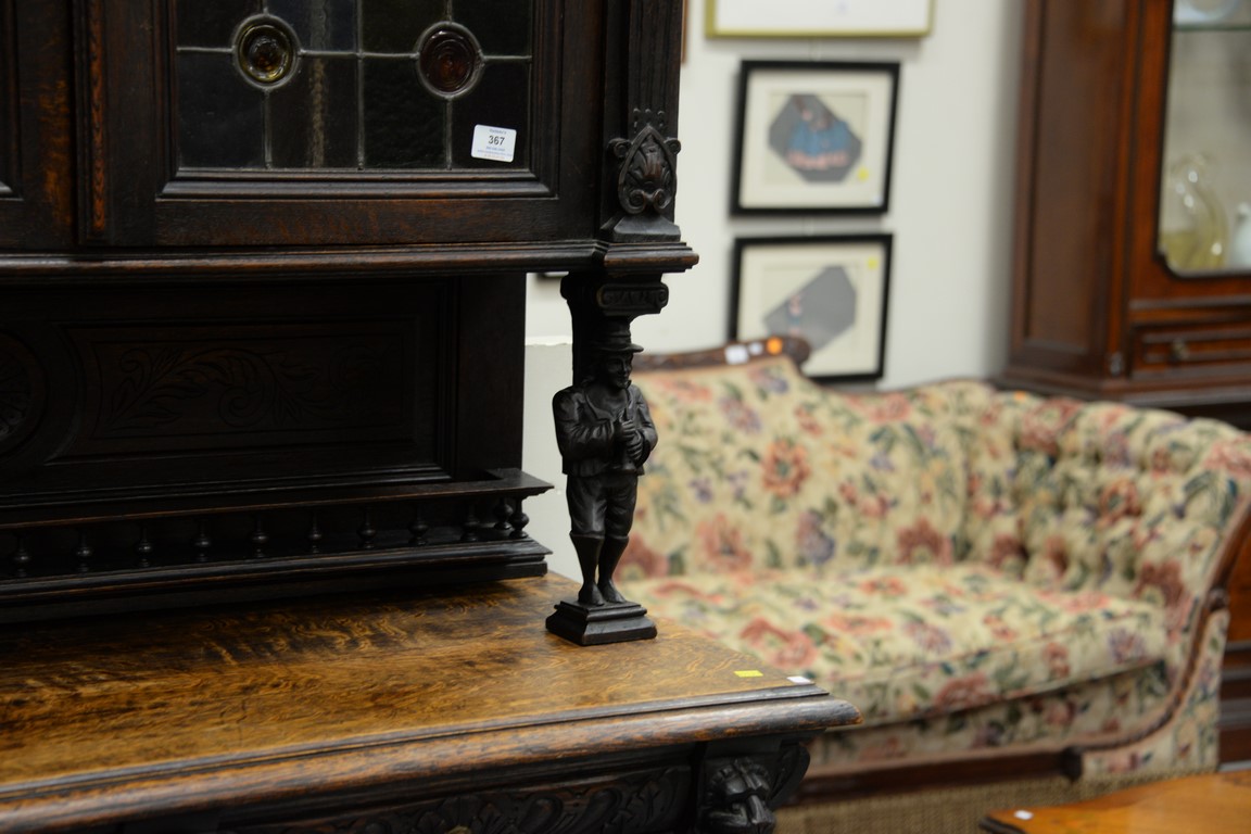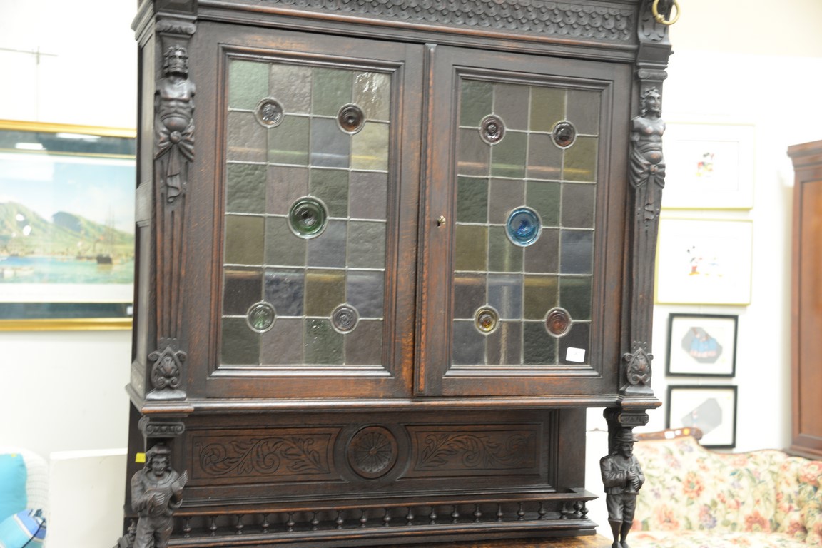 Lot 367: Continental oak cabinet in two parts, upper section with two leaded doors all supported by two 3D carved figures on base with two dr…