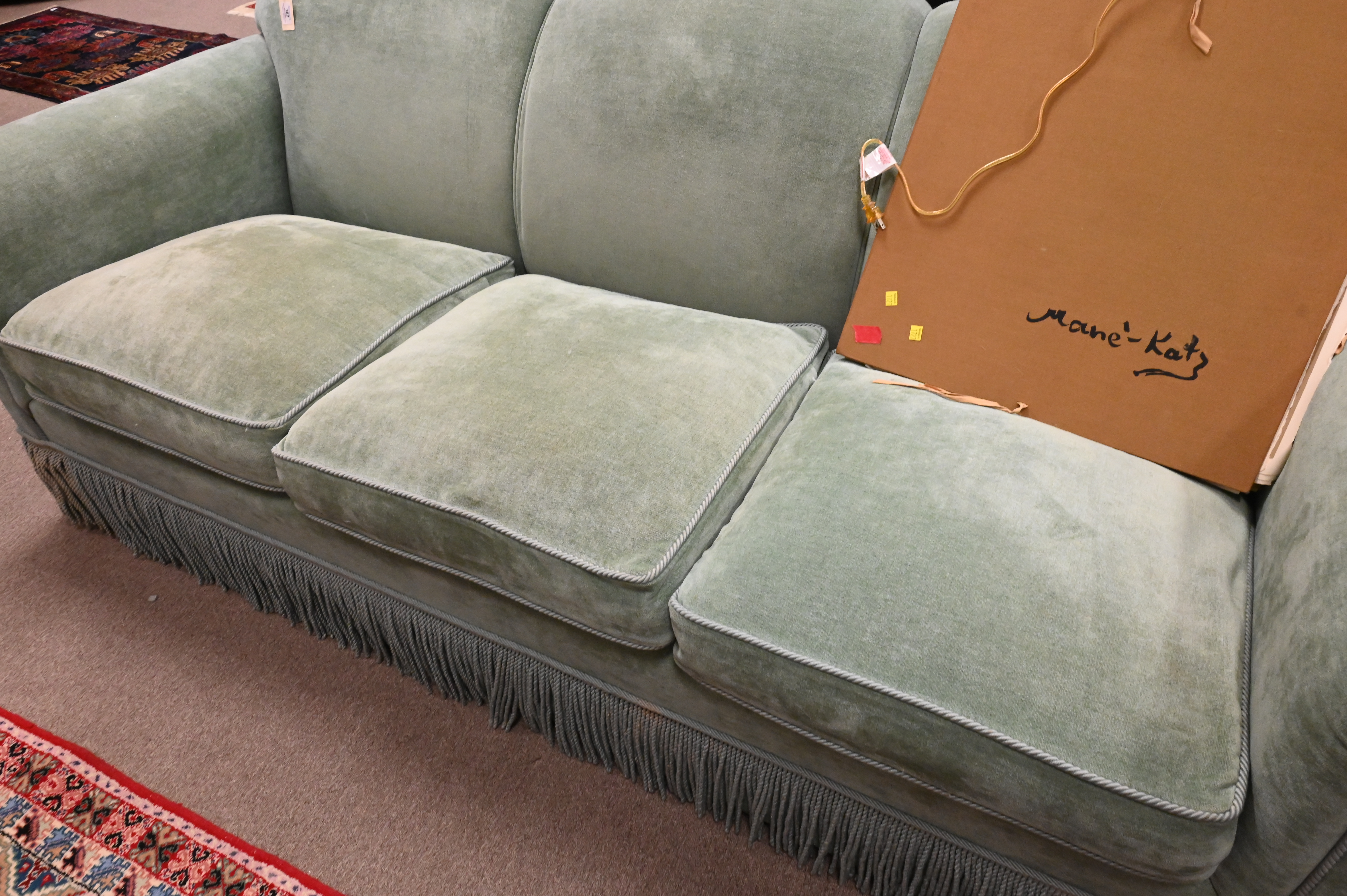 Custom Upholstered Teal Sofa, having three cushion seats and fringe skirt, height length. Height 35 inches, length 85 inches.